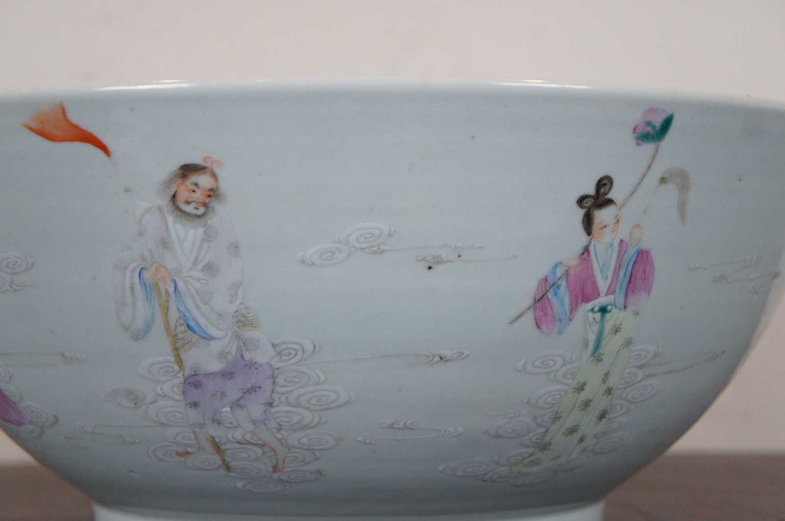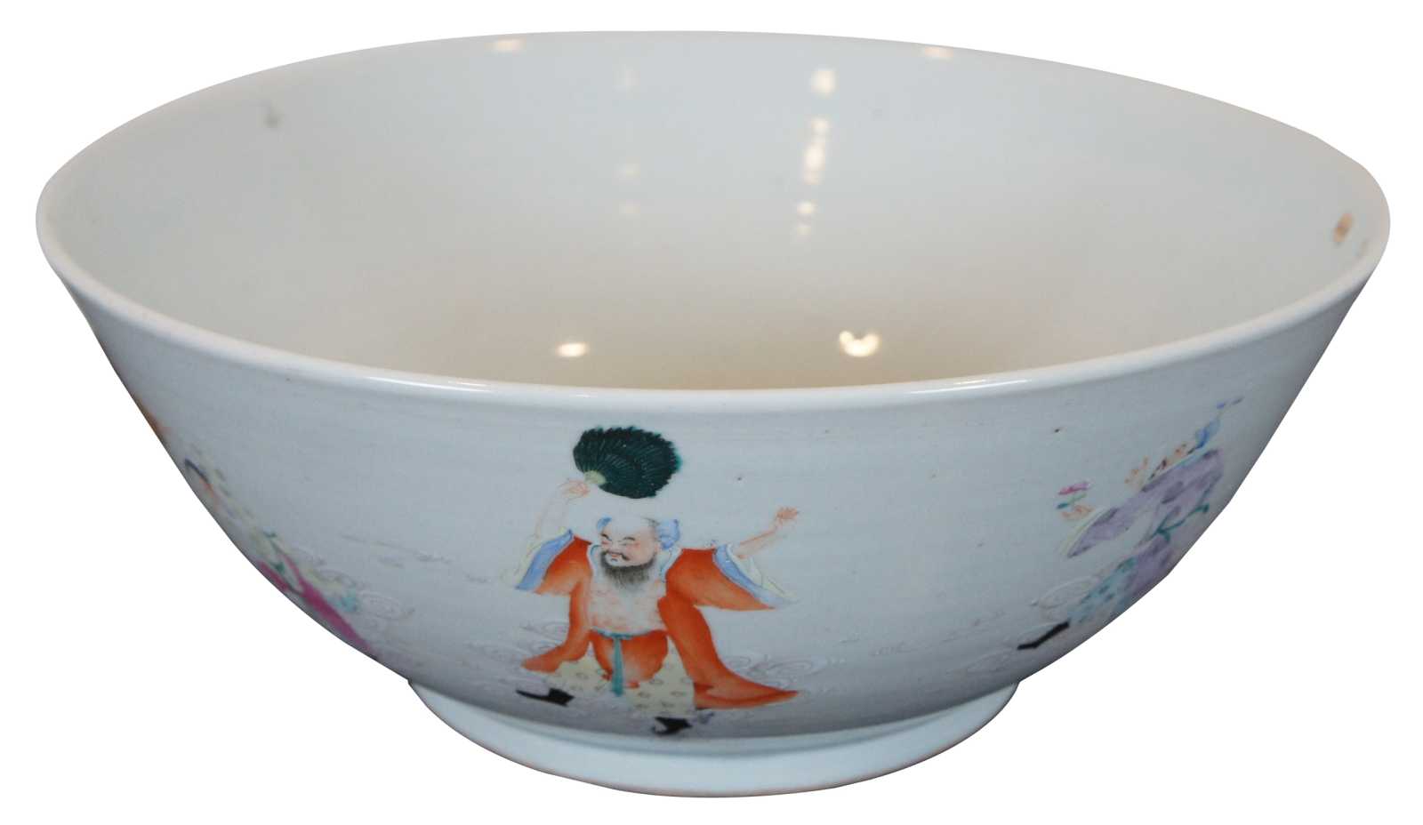 Antique 19th century Meji era, Japanese polychrom porcelain bowl, hand painted in the arita or imari style with the Seven Lucky Gods standing on clouds. “In Japanese folklore the Shichifukujin are the Seven Lucky Gods who may also be known as the Seven Gods of Happiness or the Seven Gods of Good Fortune. The seven gods are in fact of diverse origin as some are originally from Buddhism, some are from Shinto, and still others come from Chinese tradition.