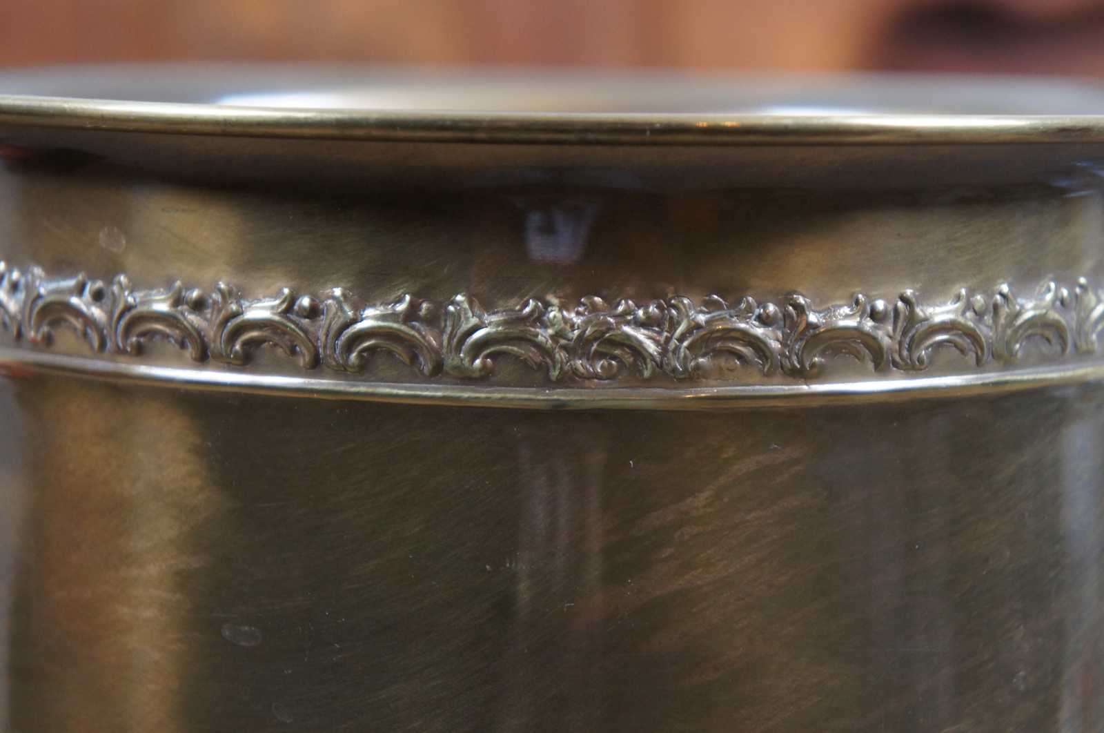 Vintage brass and oak champagne bucket with tripod pedestal stand, and ball and claw feet.