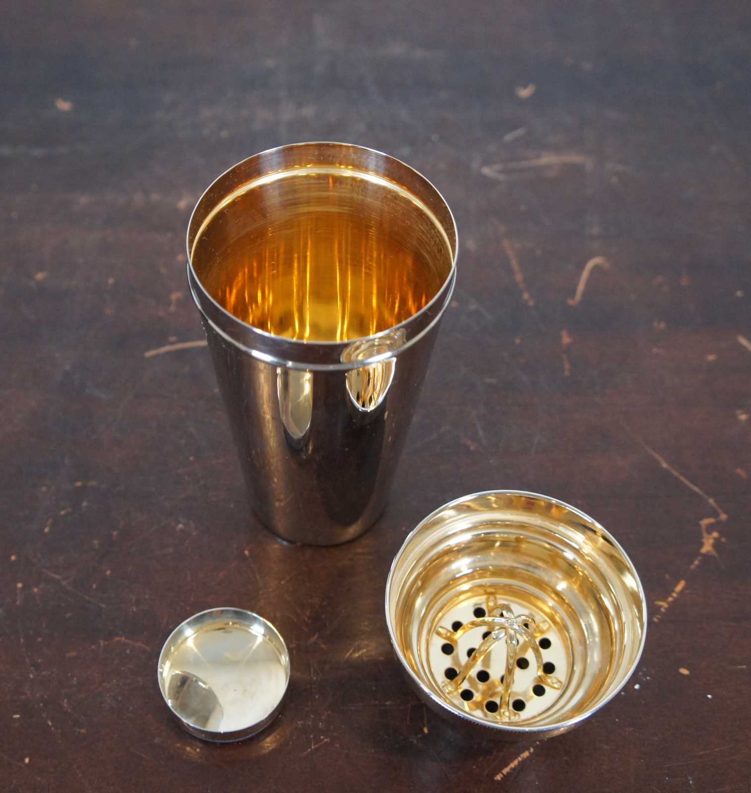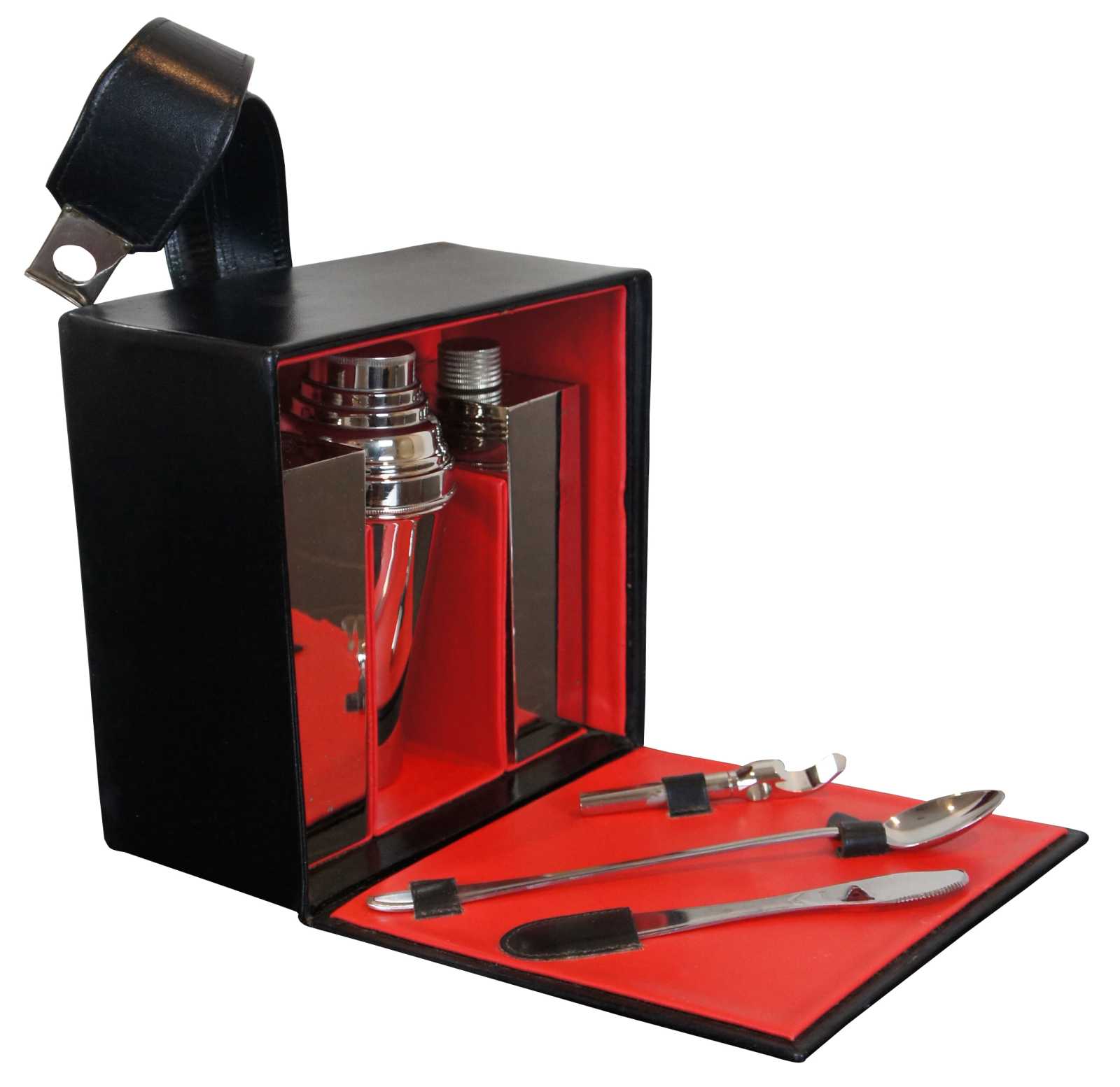 Mid century Rostfrei German travel bar set in a black leather case; includes two flasks with nested shot glasses, bottle opener, stirring spoon, bar knife, and shaker.