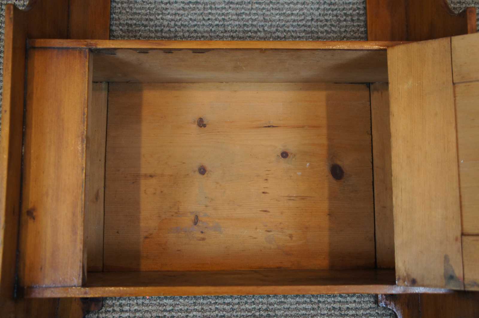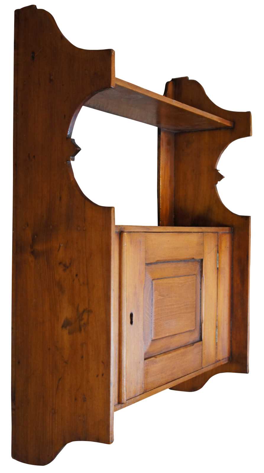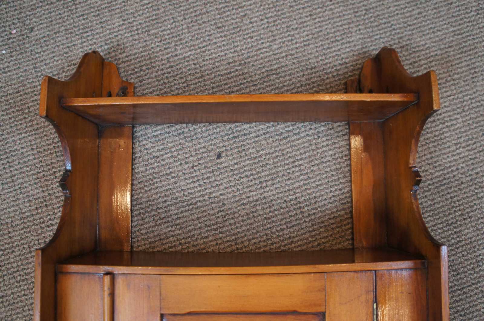Antique 19th century pine wall hanging cabinet. Great for used as a bathroom cabinet display of curiosities. features 2 shelf over lower cabinet with paneles door.
