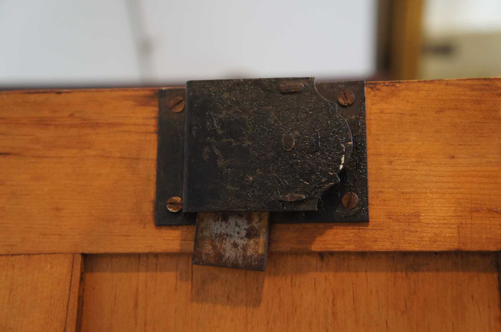 Good Overall - Light staining on back, small nicks and dings, broken hanger hole on one side with crack; no key; see pictures