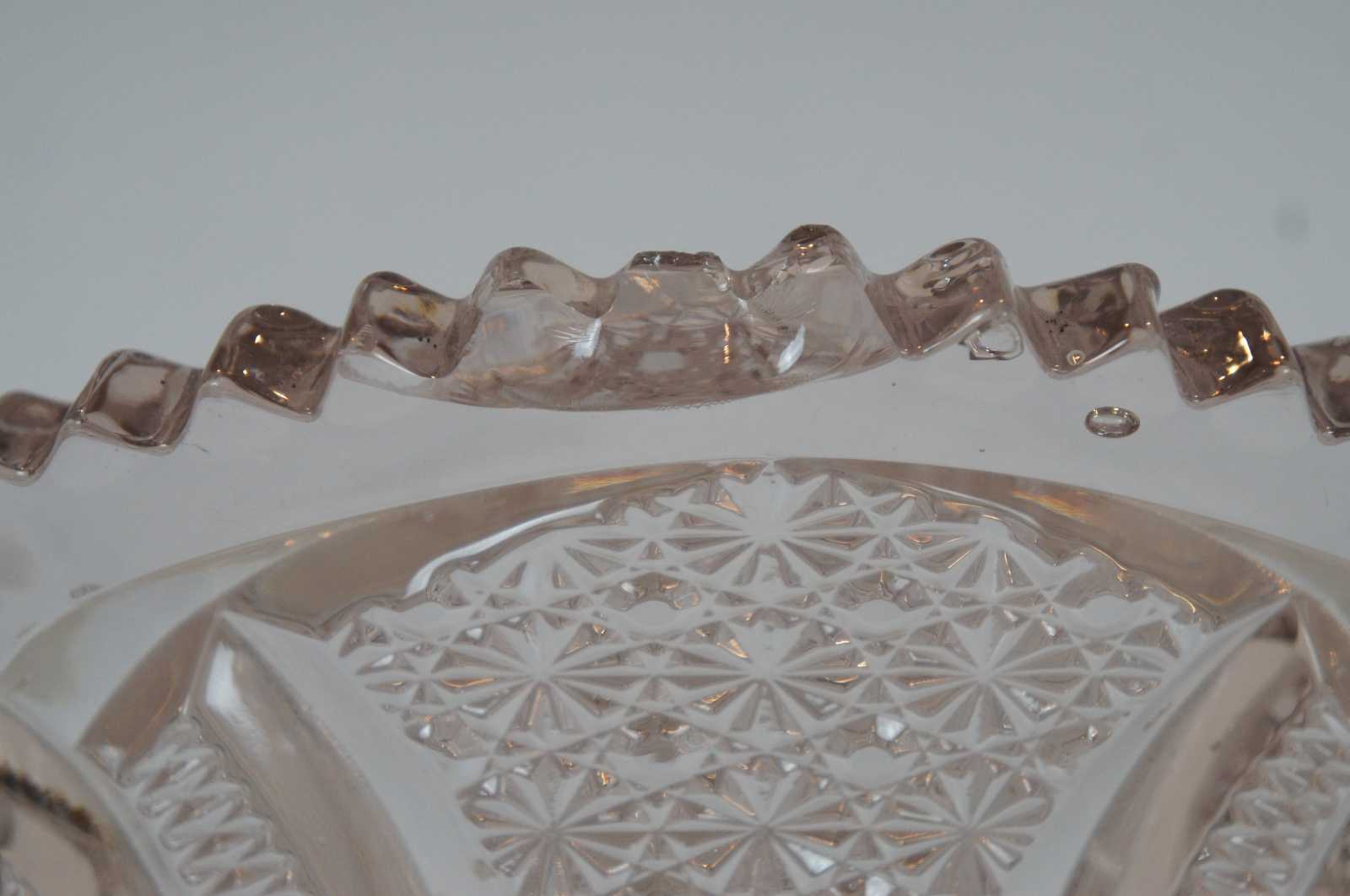 Large vintage pressed glass punch bowl with a scalloped sawtooth edge and geometric star pattern.