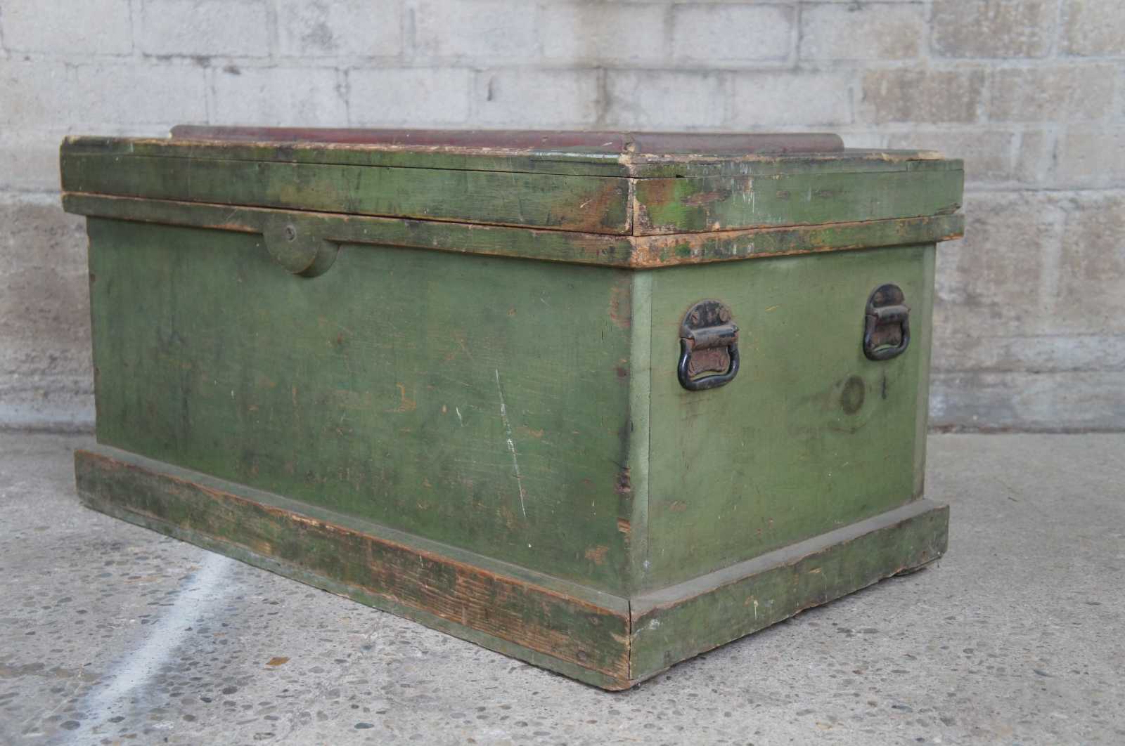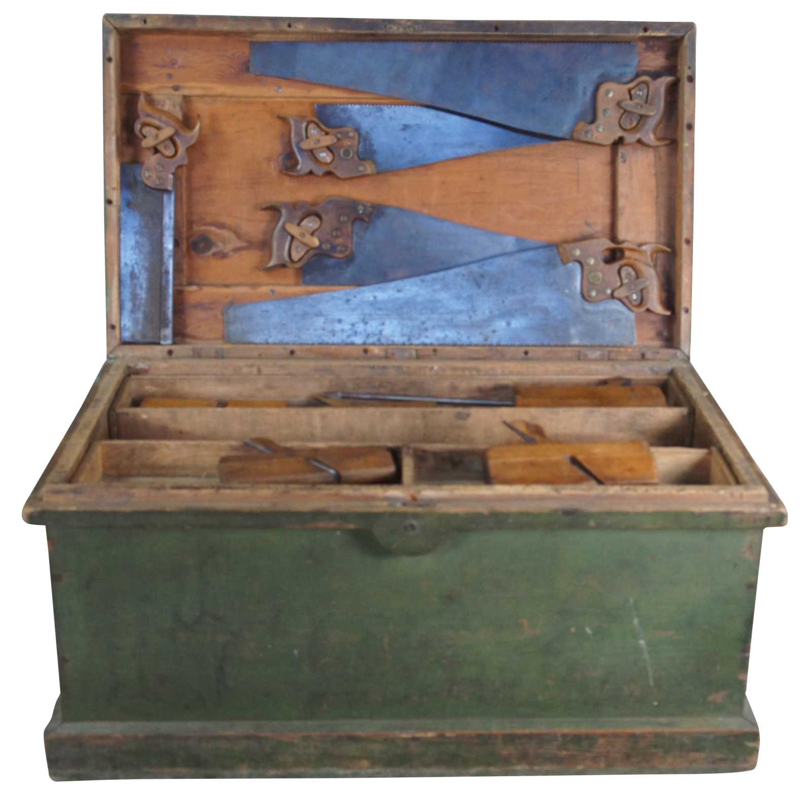 An exceptional and rare antique pine carpenters tool chest or trunk featuring five Disston hand saws, a large lot of antique planers and various extras. Marked along the upper lid, "Erected January 1906, No sleighing this winter until March 15""