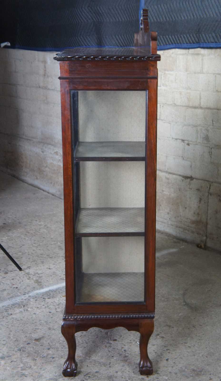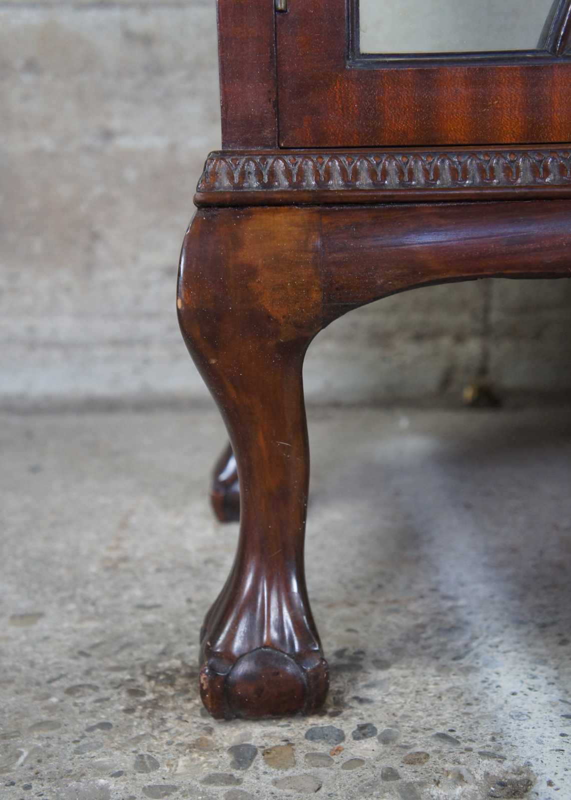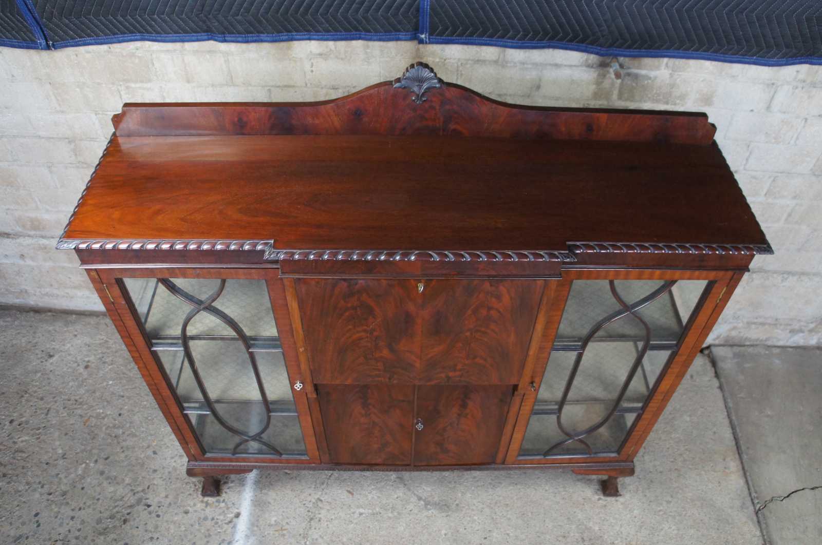 Exquisite 19th Century Chippendale style side by side secretary. A rectangular case with breakfront design made from crotch mahogany with carved backsplash. Features a drop front writing desk flanked by bookcases. The petite secretary opens to a tooled green leather work surface in front of pigeon holes and hand dovetailed drawer. Includes lower cabinet for storage below drop front. The exterior flanked curio cabinets are glass covered with wooden fretwork backing and two fixed shelves. Case is supported by cabriole legs leading to ball and claw feet. An elegant yet functional design perfect for use in a library or home.