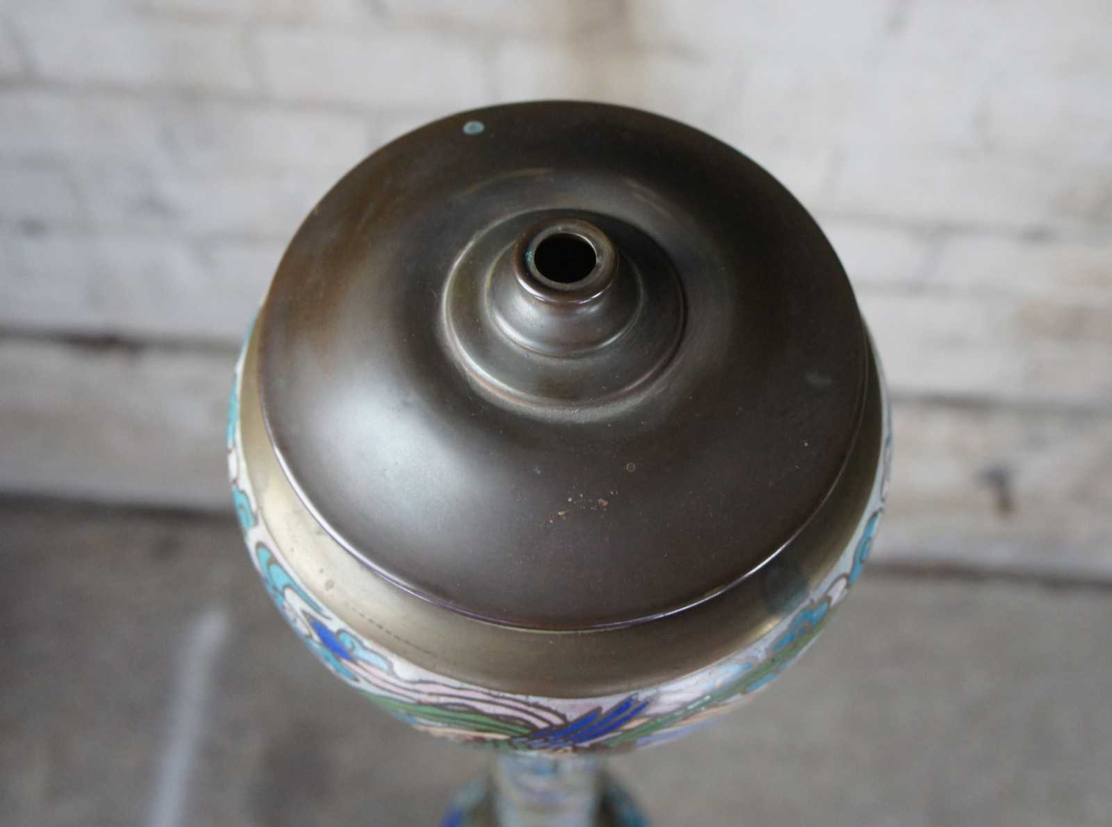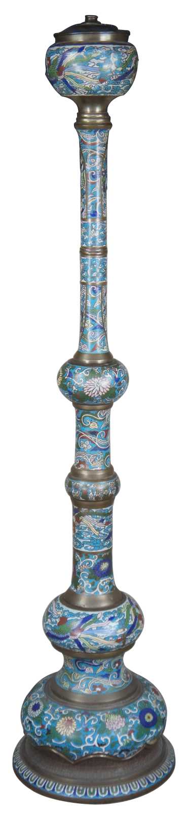 Monumental antique cloisonne floor oil lamp featuring champleve enamel design of stylized animals, figures and vined florals against a field of clouds and brass accents.