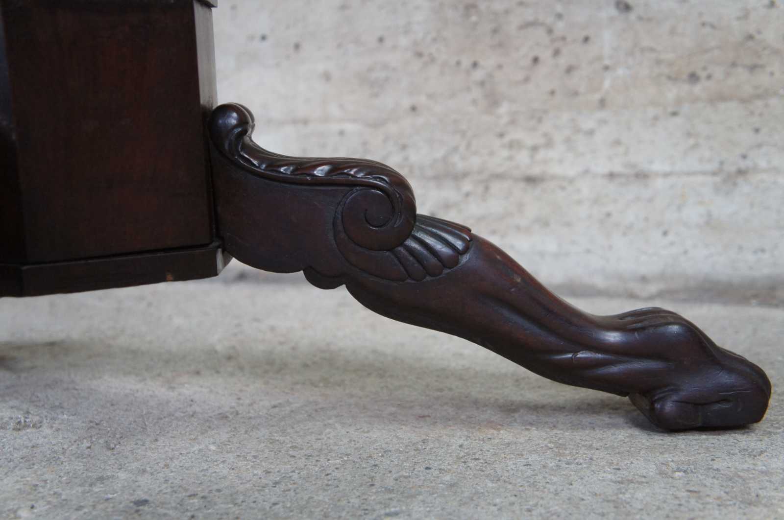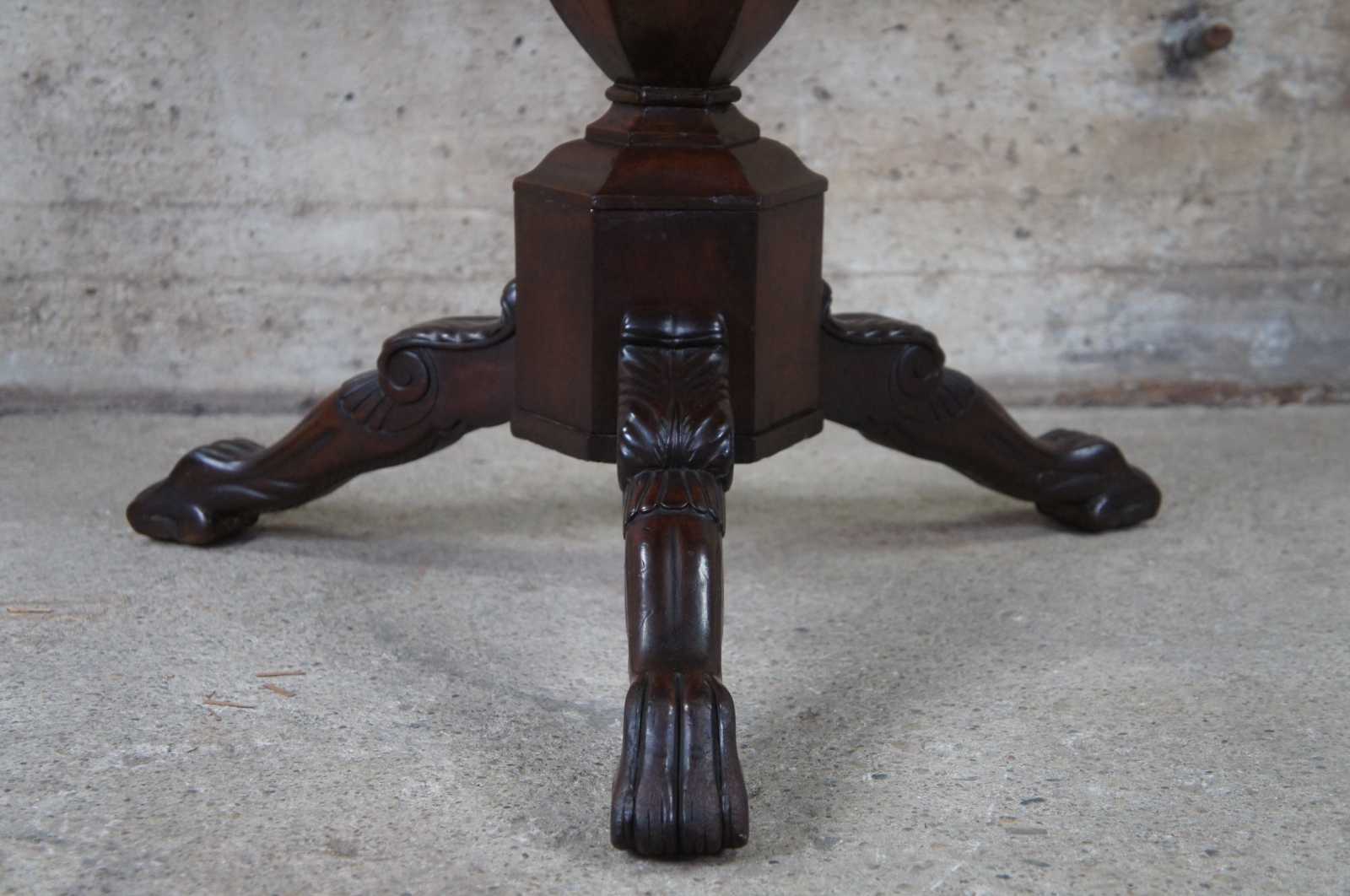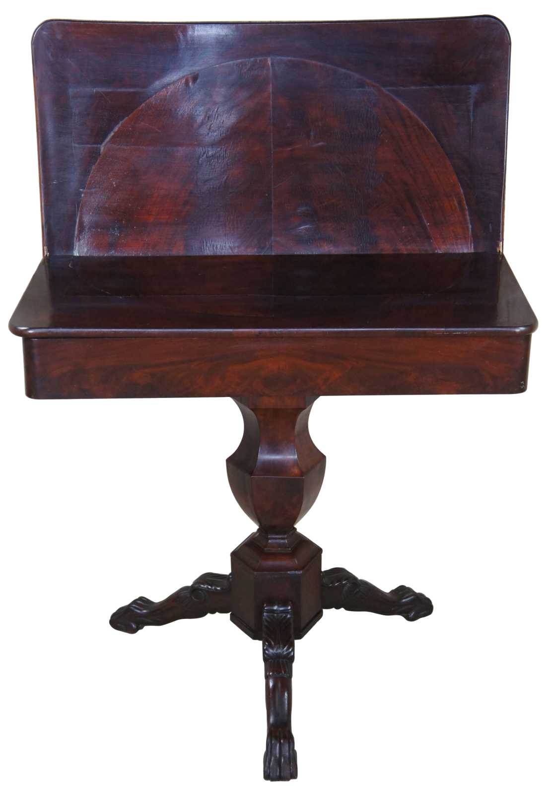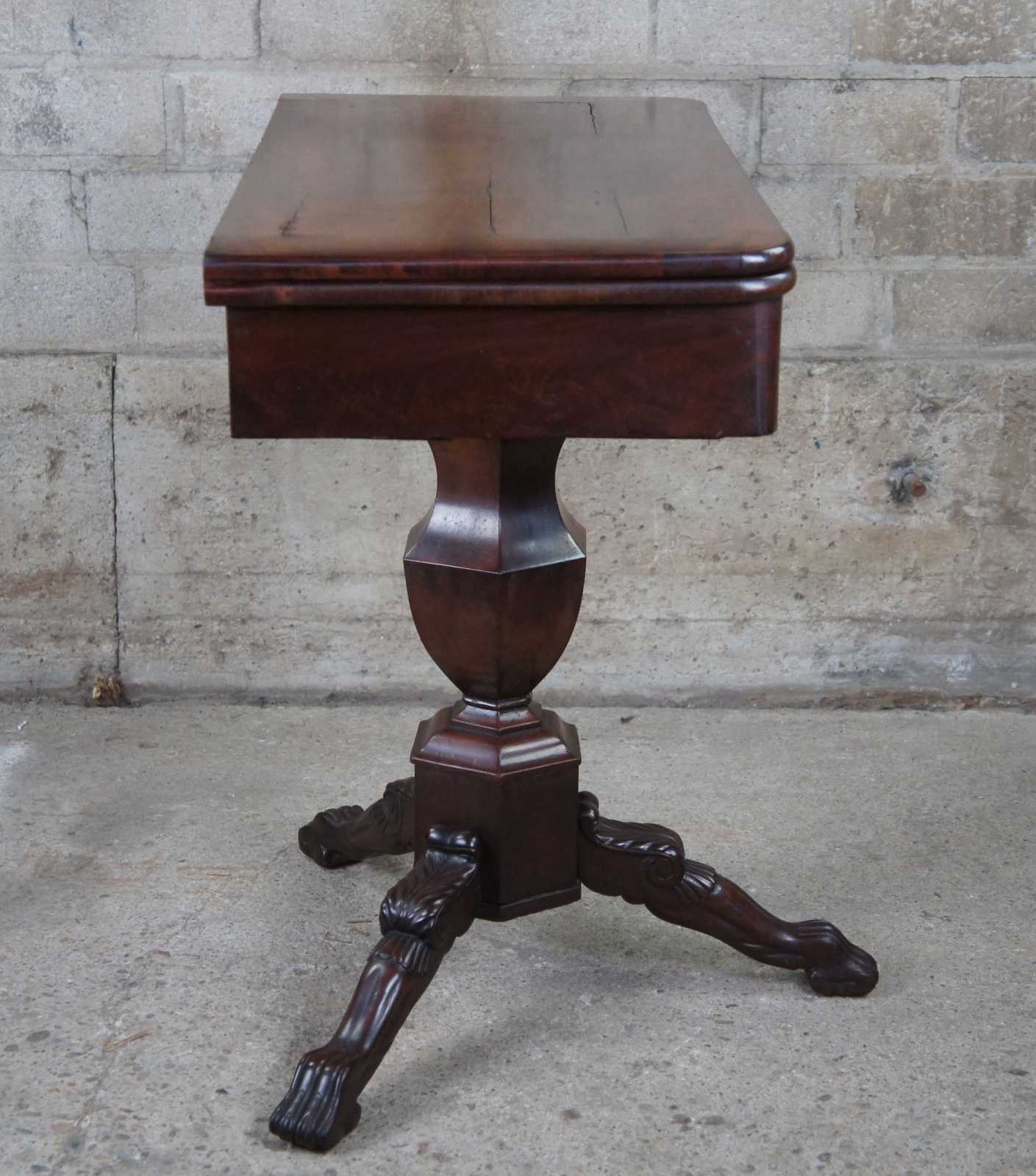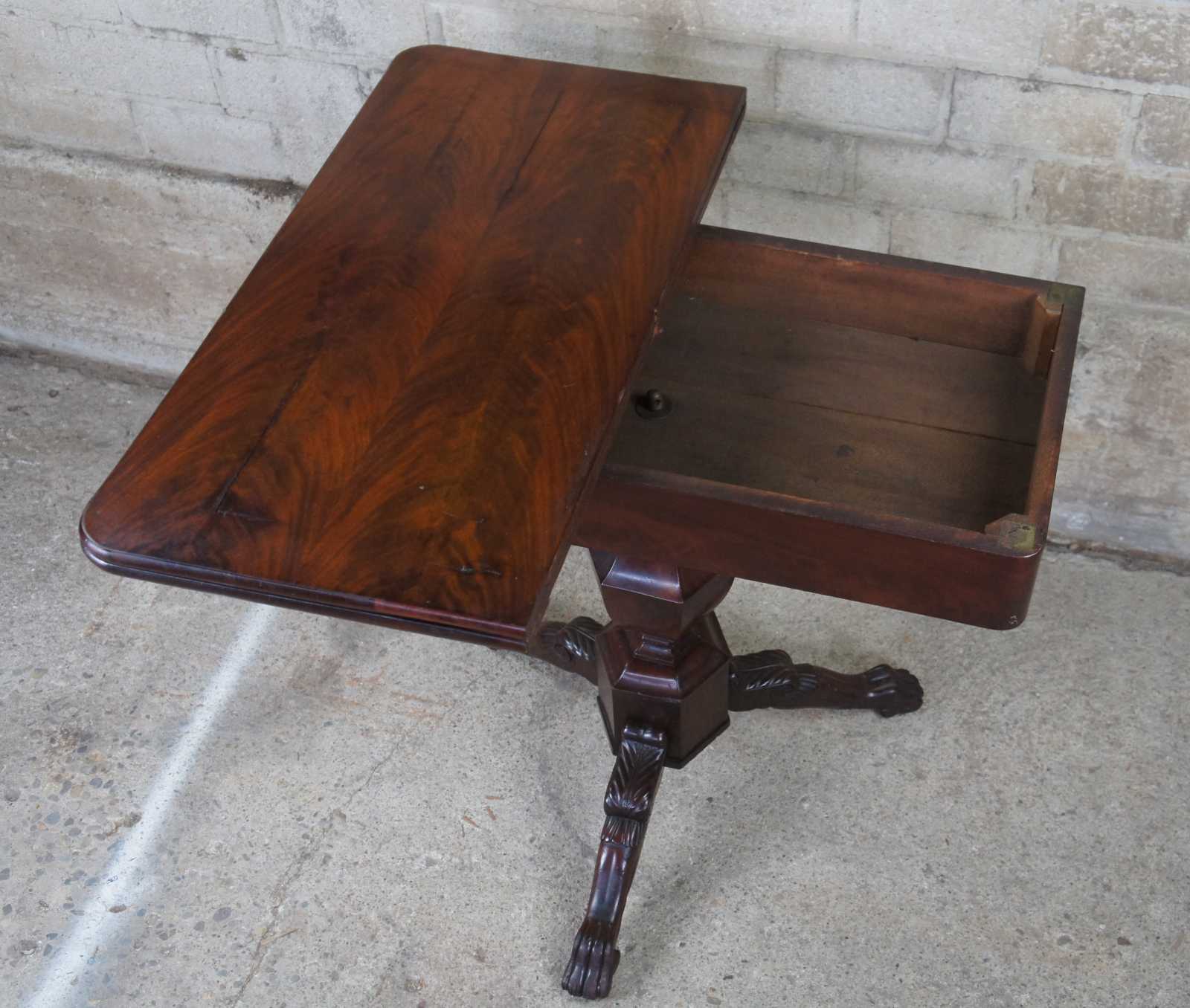 An exquisite American Empire flame mahogany paw foot game table, circa 1830s. Features a rectangular top that flips open to a square form with circular crotch veneer center. The top is supported by a turned baluster leading to a carved tripod base with scrolled and toned legs leading to paw feet. Storage below top allows for games and accessories to be concealed.