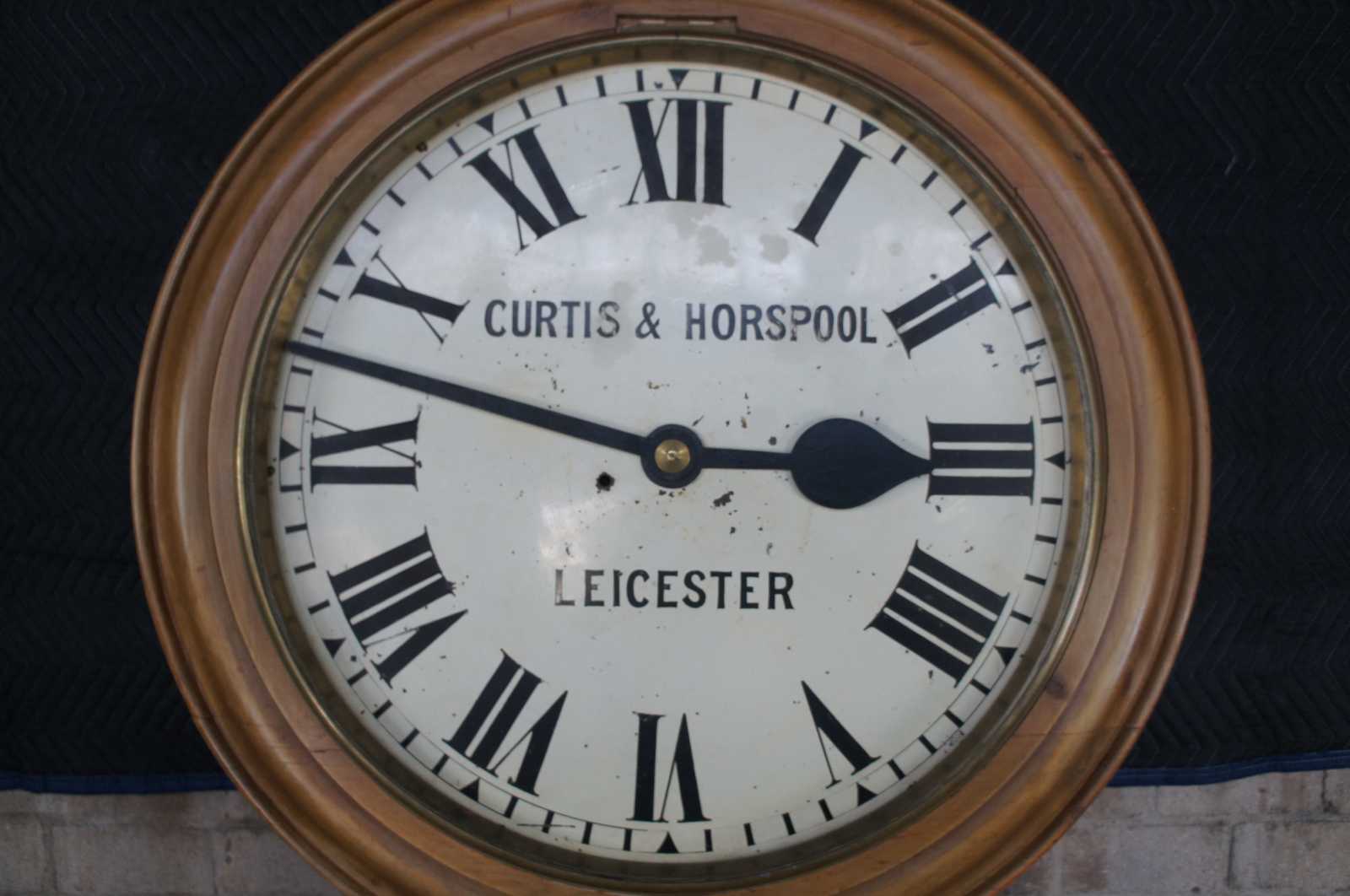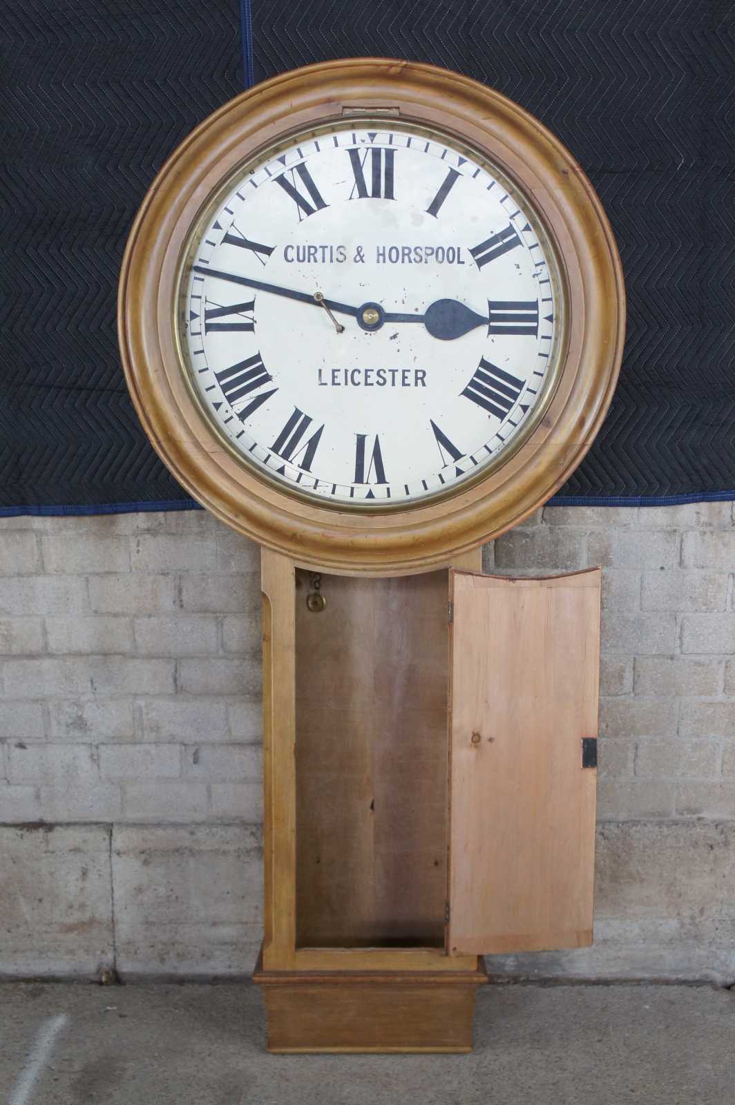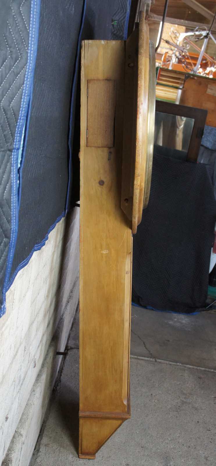 18th century monumental museum quality Act of Parliament clock. Made from pine with a large round face over elongated case. Features an enameled metal face marked Curtis Horspool in Leicester, London England. Curtis was the royal watchmaker of the Prince of Wales.