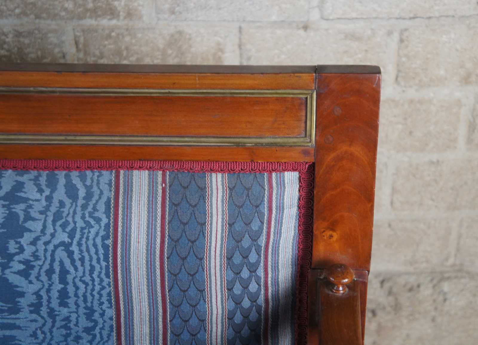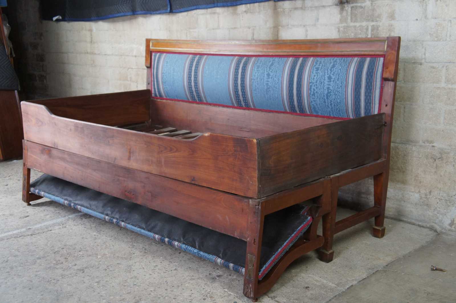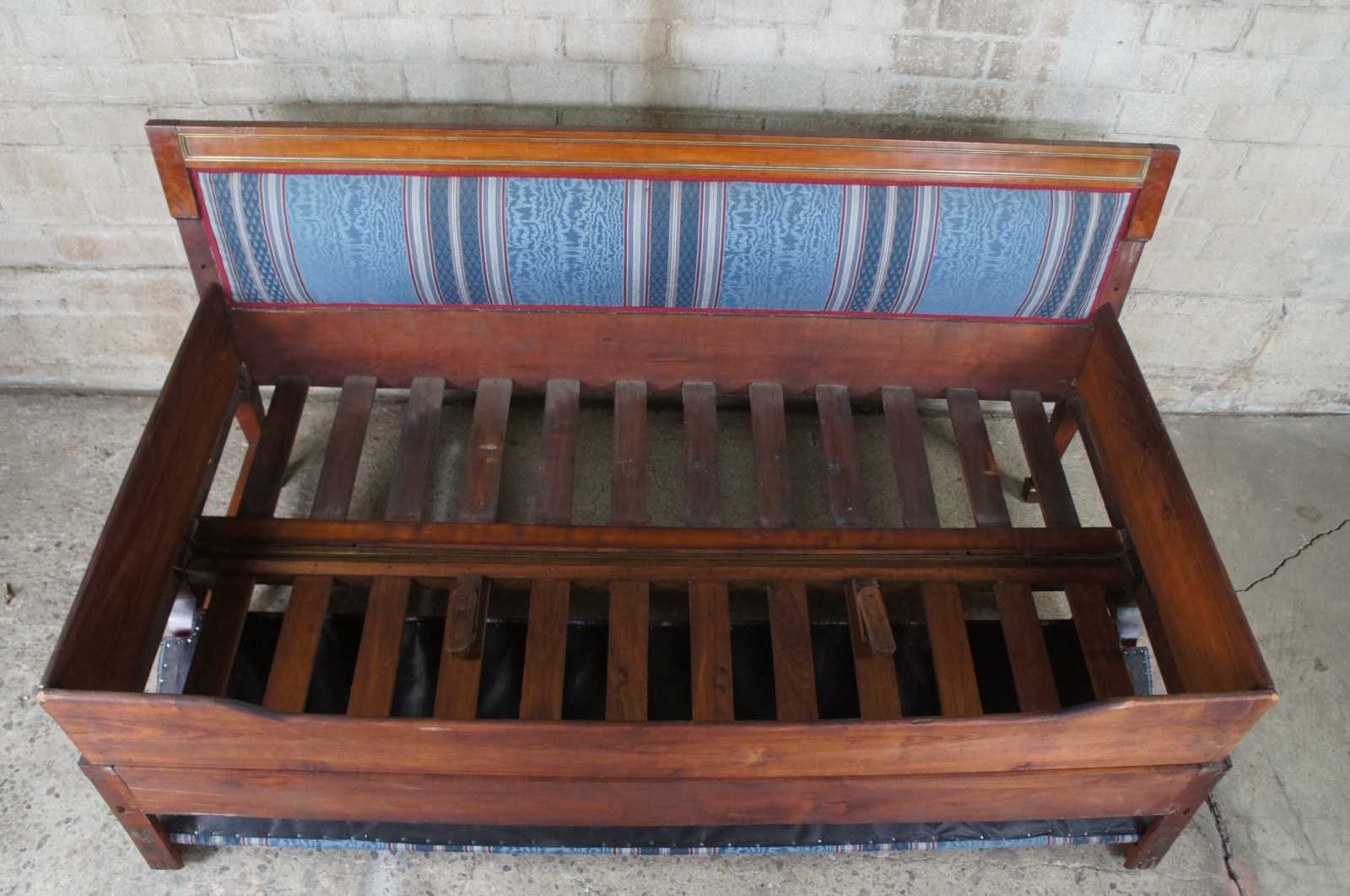 Early 19th century museum quality English Regency convertible hall bench or bed. A rectangular form made from mahogany with with brass ormolu. Upholstered in a striped blue and red fabric with red cording. The bench is supported by square tapered legs leading to spade or marlboro feet. When ready to sleep the brass bolts along the back side can be released allowing it to fold open into a flat surface with a built in frame for mattress. Also known as a "hide a bed or sleep bench"