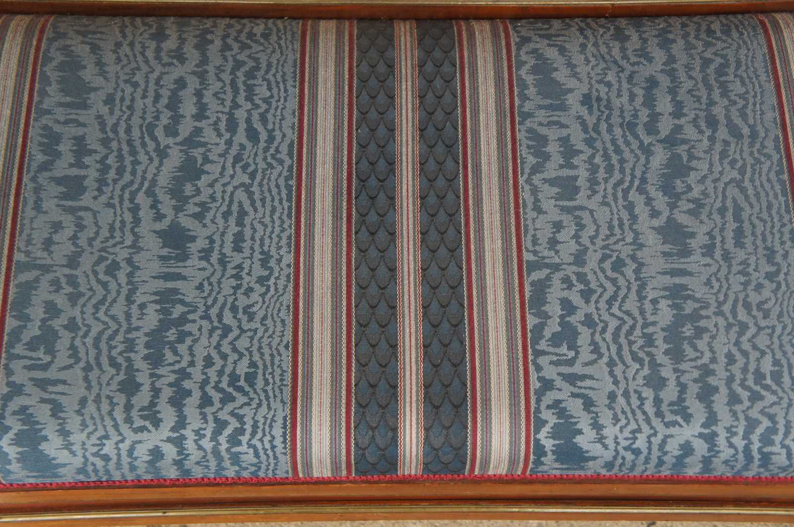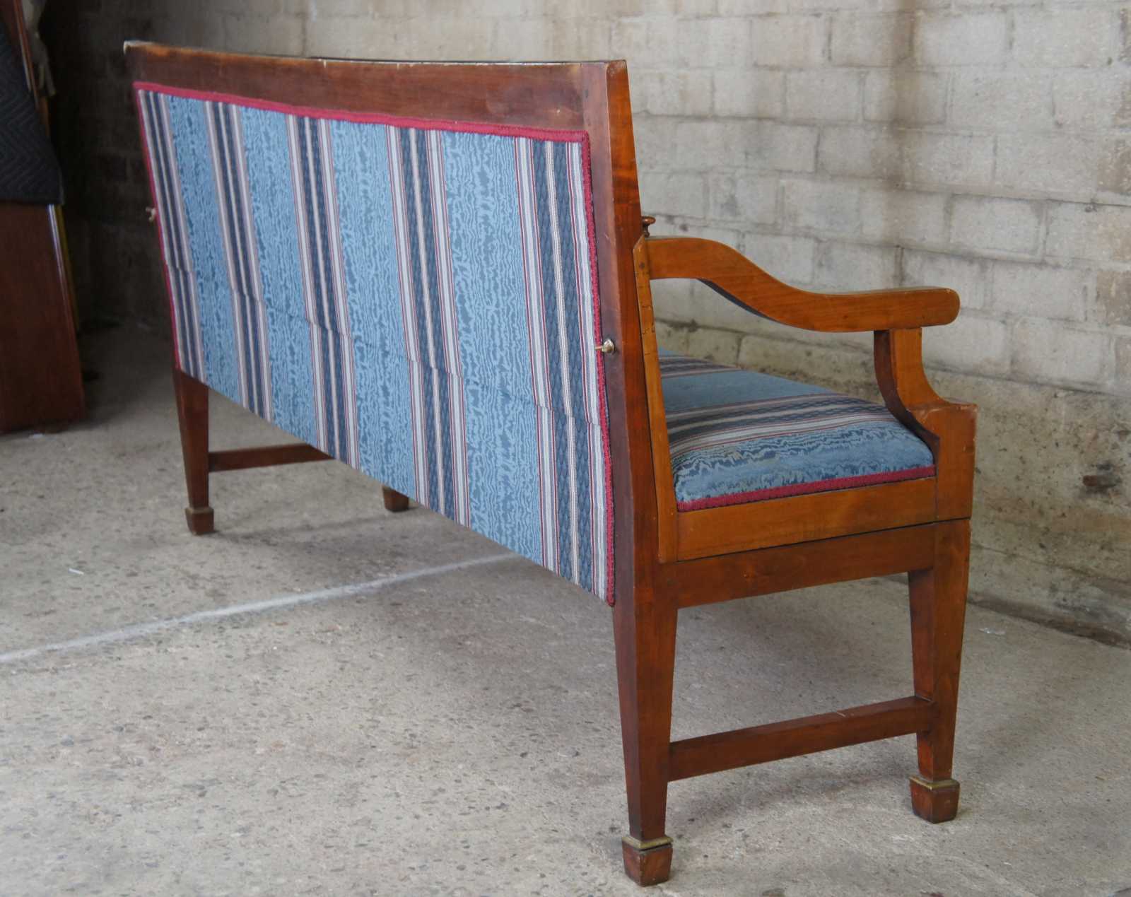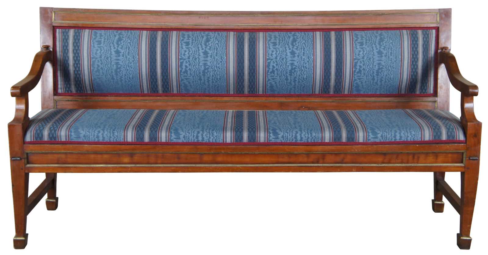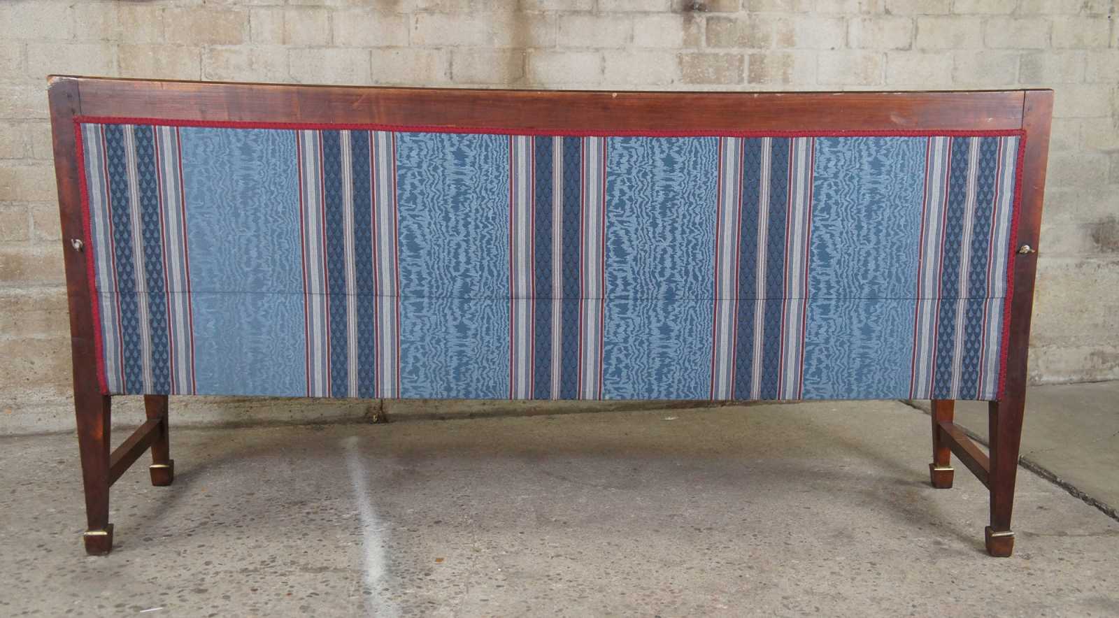 Early 19th century museum quality English Regency convertible hall bench or bed. A rectangular form made from mahogany with with brass ormolu. Upholstered in a striped blue and red fabric with red cording. The bench is supported by square tapered legs leading to spade or marlboro feet. When ready to sleep the brass bolts along the back side can be released allowing it to fold open into a flat surface with a built in frame for mattress. Also known as a "hide a bed or sleep bench"