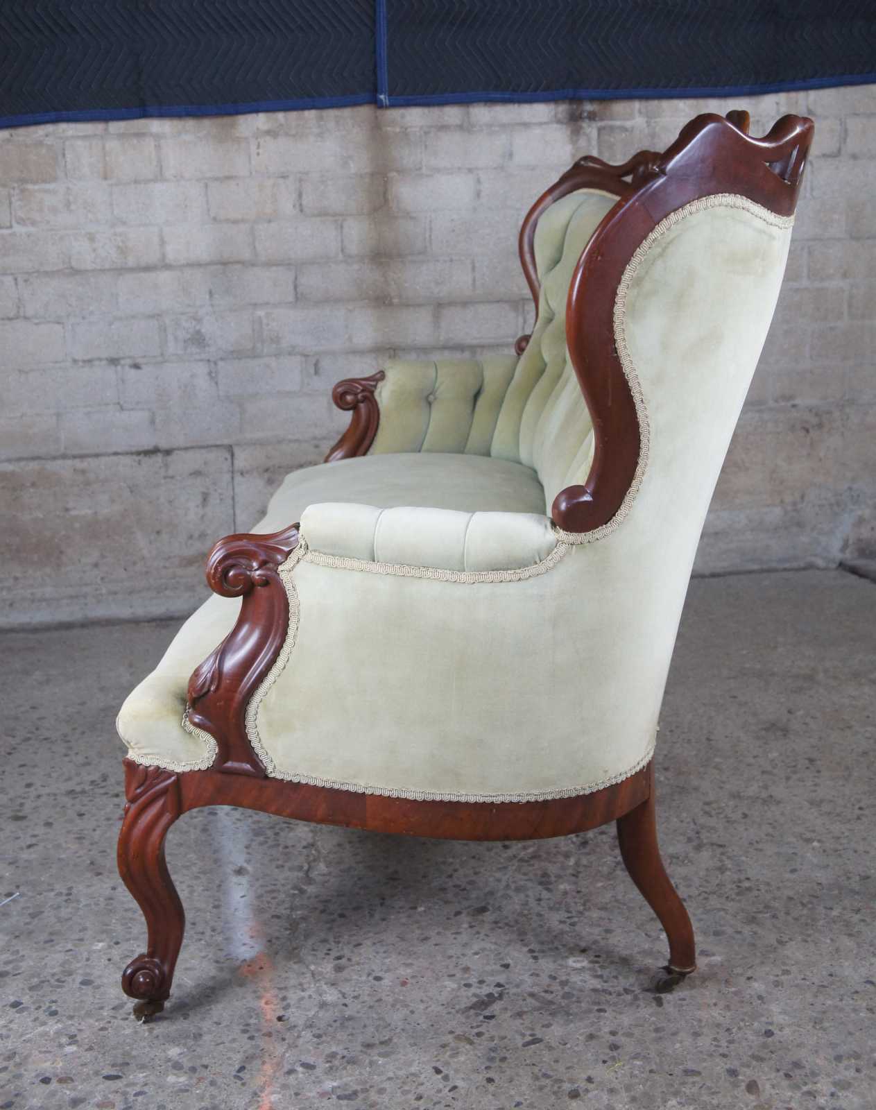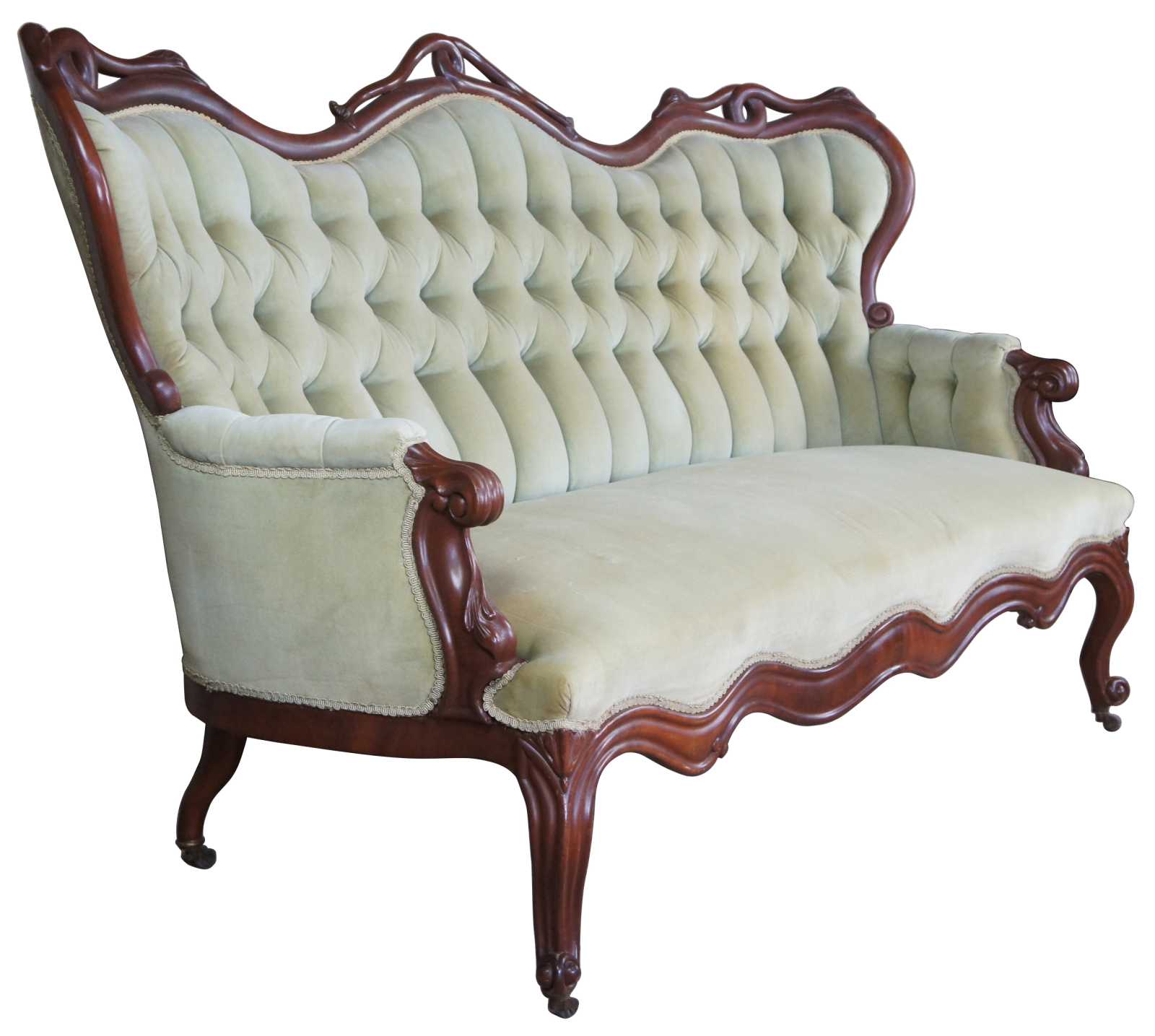 Antique Victorian carved parlor sofa or settee. Made of mahogany with serpentine form featuring carved intertwined serpents with swan like heads and fish tails along the wing-backs and tufted velvet upholstery.