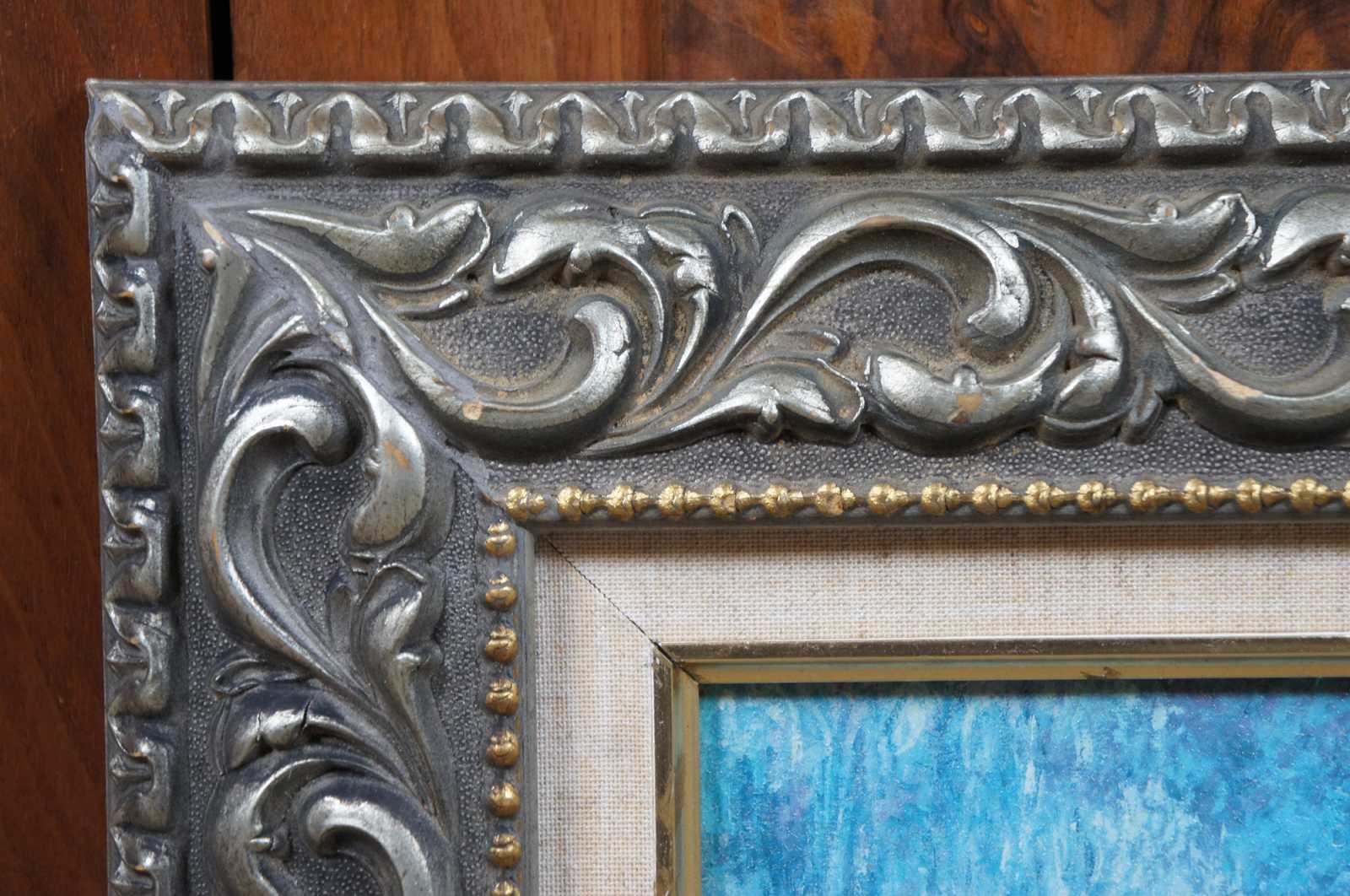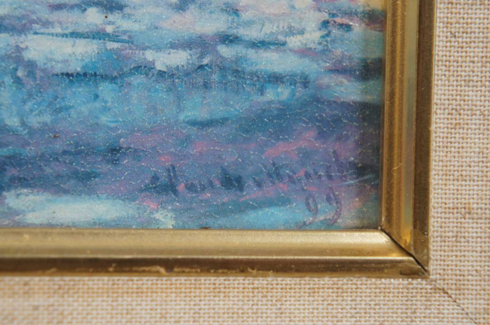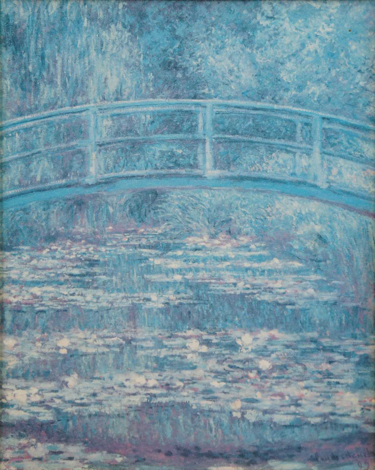 2002 framed print on canvas of The Water Lily Pond by impressionist artist Claude Monet, showing the Japanese foot bridge in Monet’s garden.