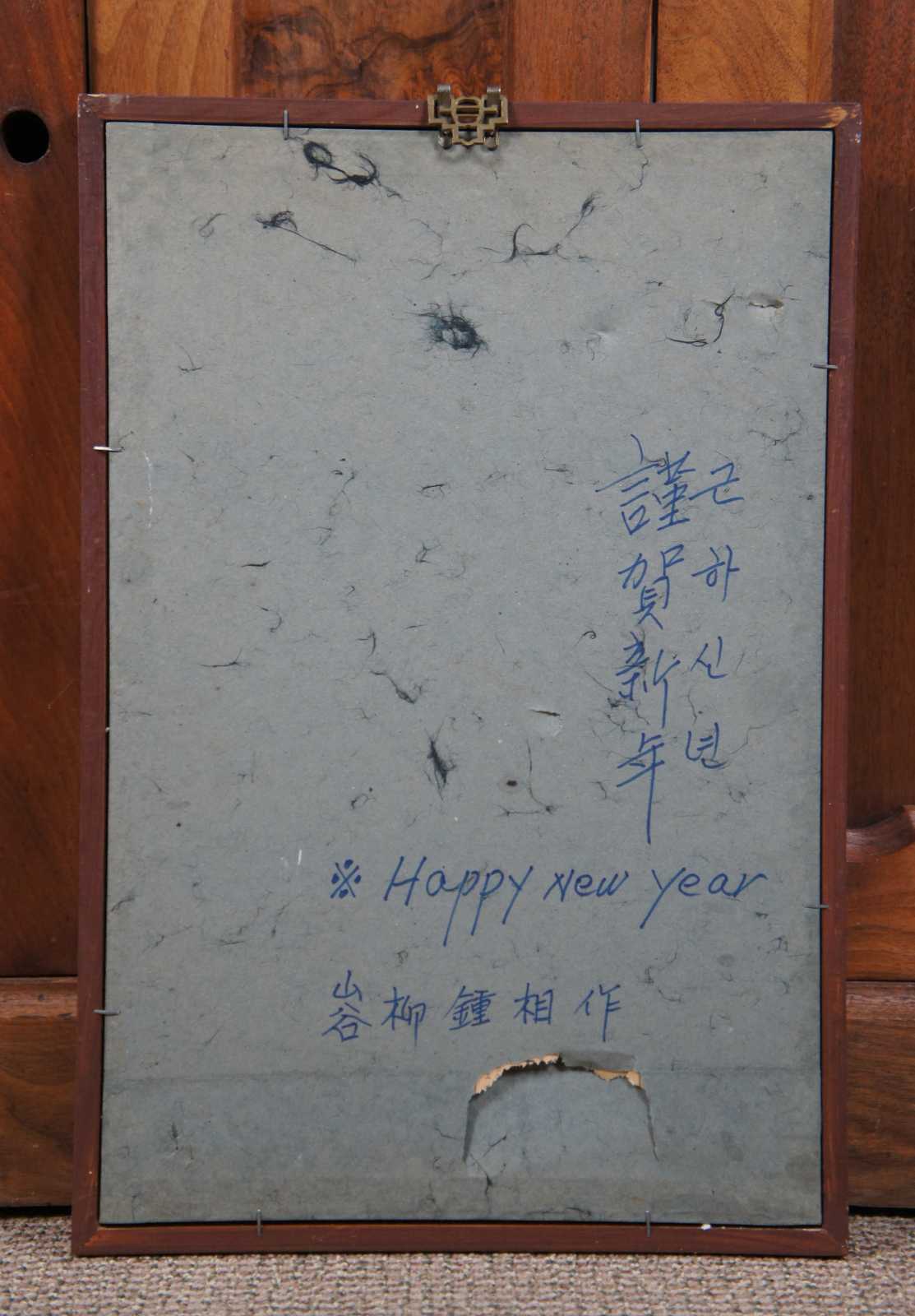 Vintage Korean watercolor painting showing a mountain landscape with a cottage and flying birds. Titled Congratulations to the New Year.