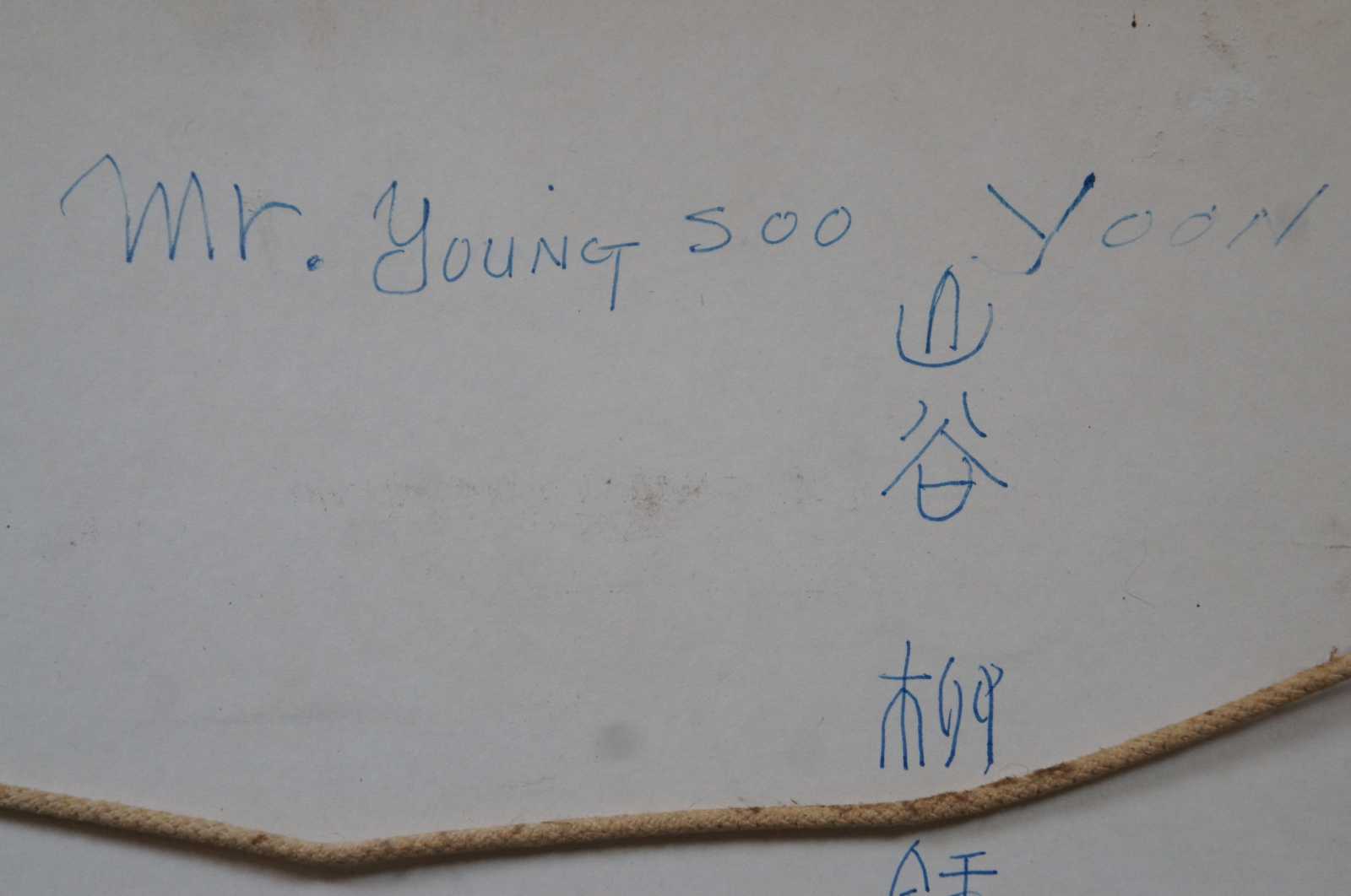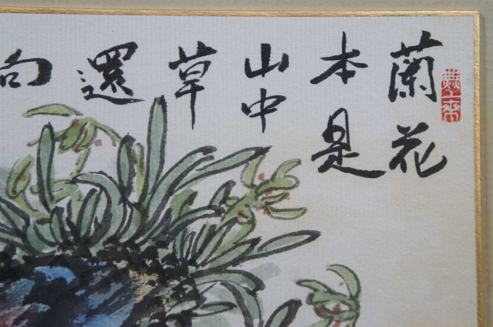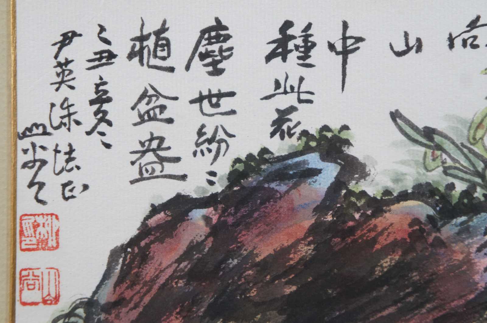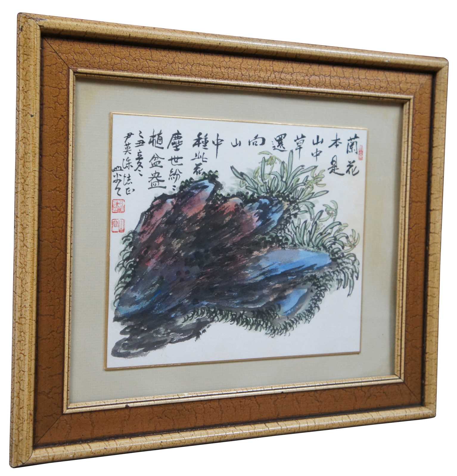 Vintage watercolor landscape painting with calligraphy by Mr. Young Soo Yoon, made in Seoul, Korea 1984. Trans.ation; In the middle of the Orchid mountain, the mountains are turning back to the grass, the earth is so beautiful
