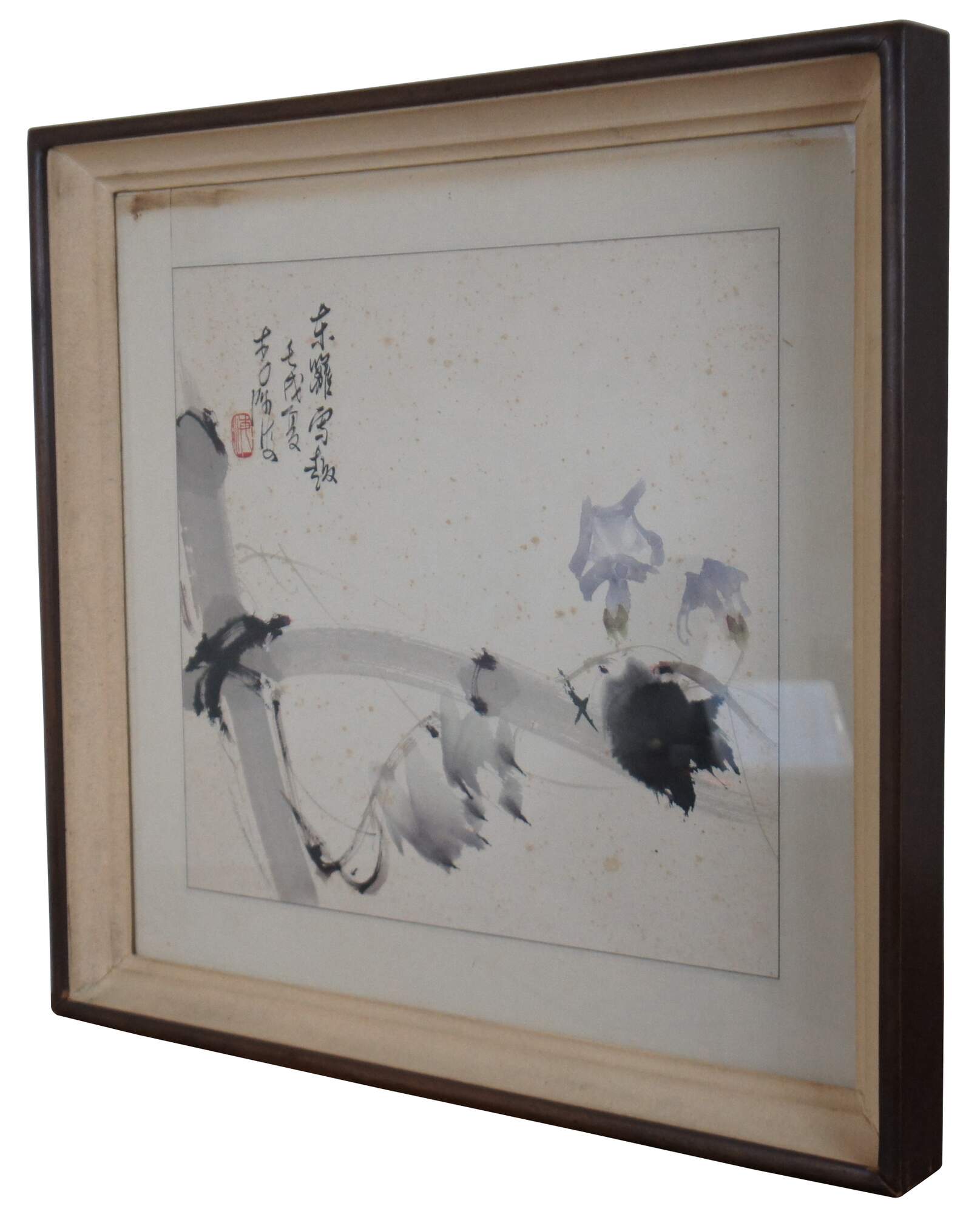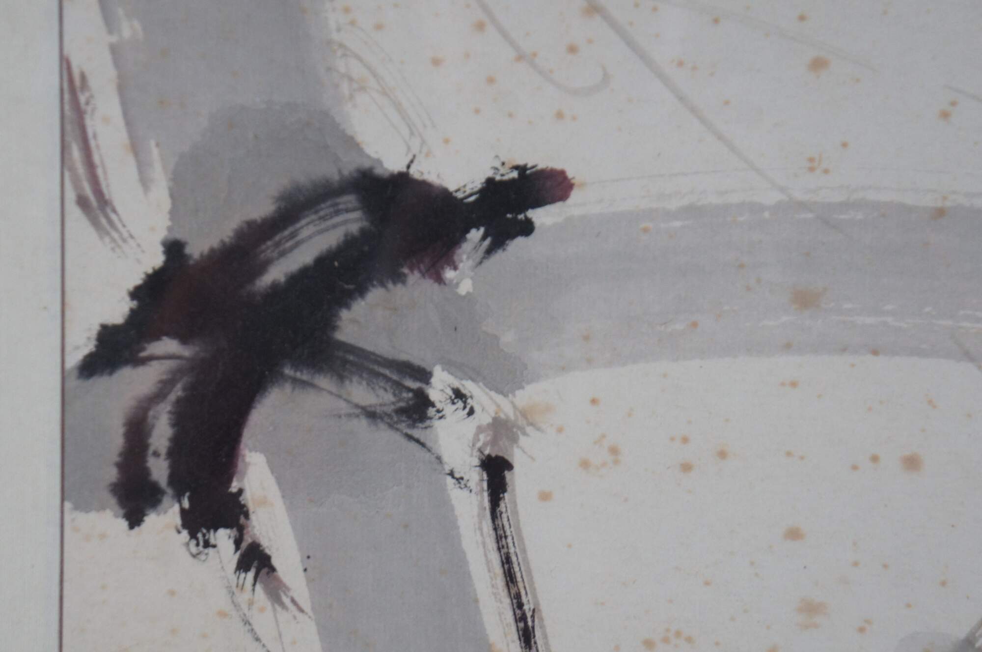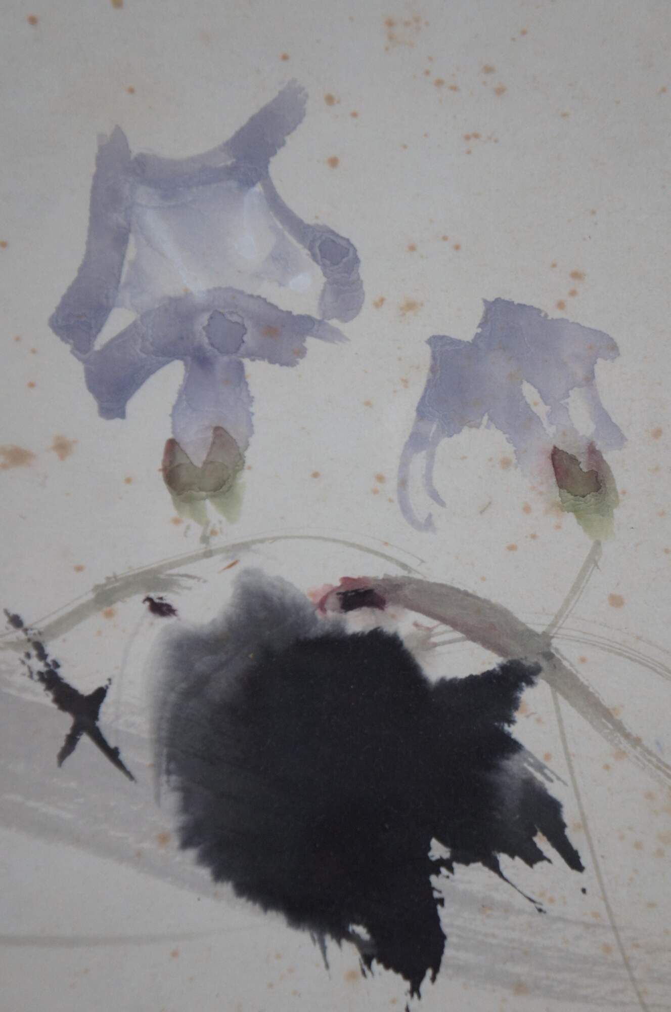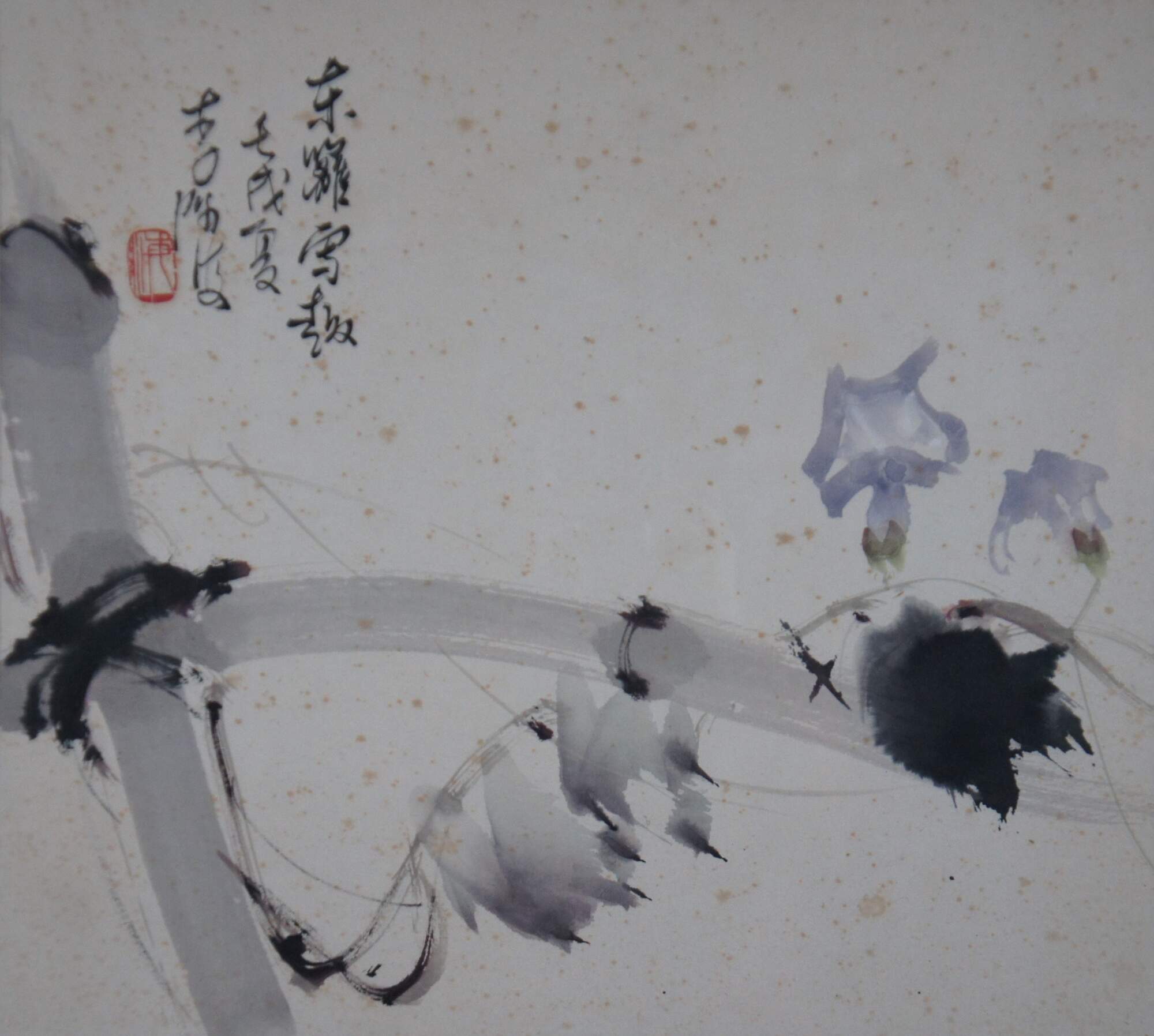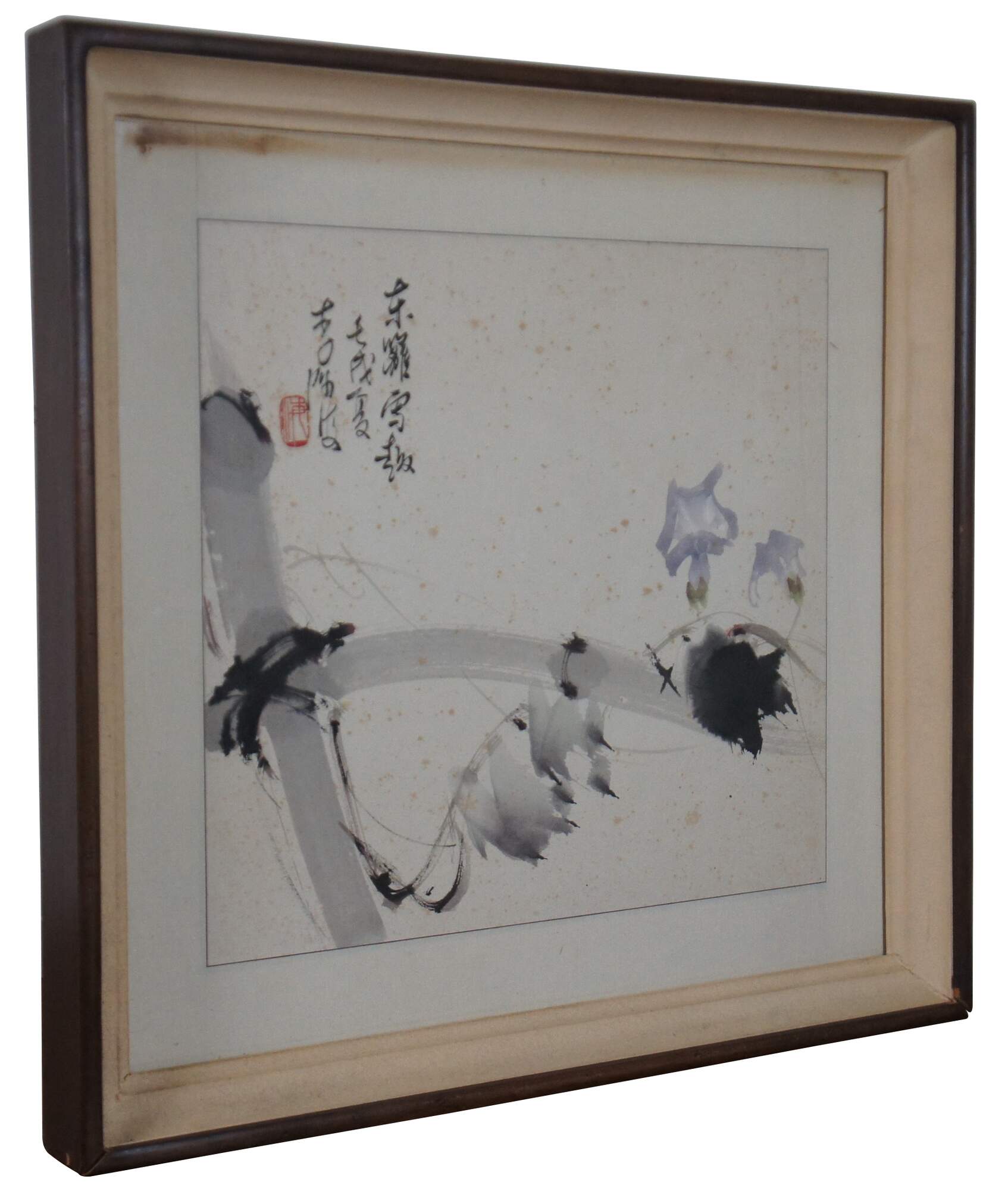 Vintage Chinese semi-abstract watercolor painting showing a vine of flowers twisting around a bamboo fence with snow. Circa 1980s.