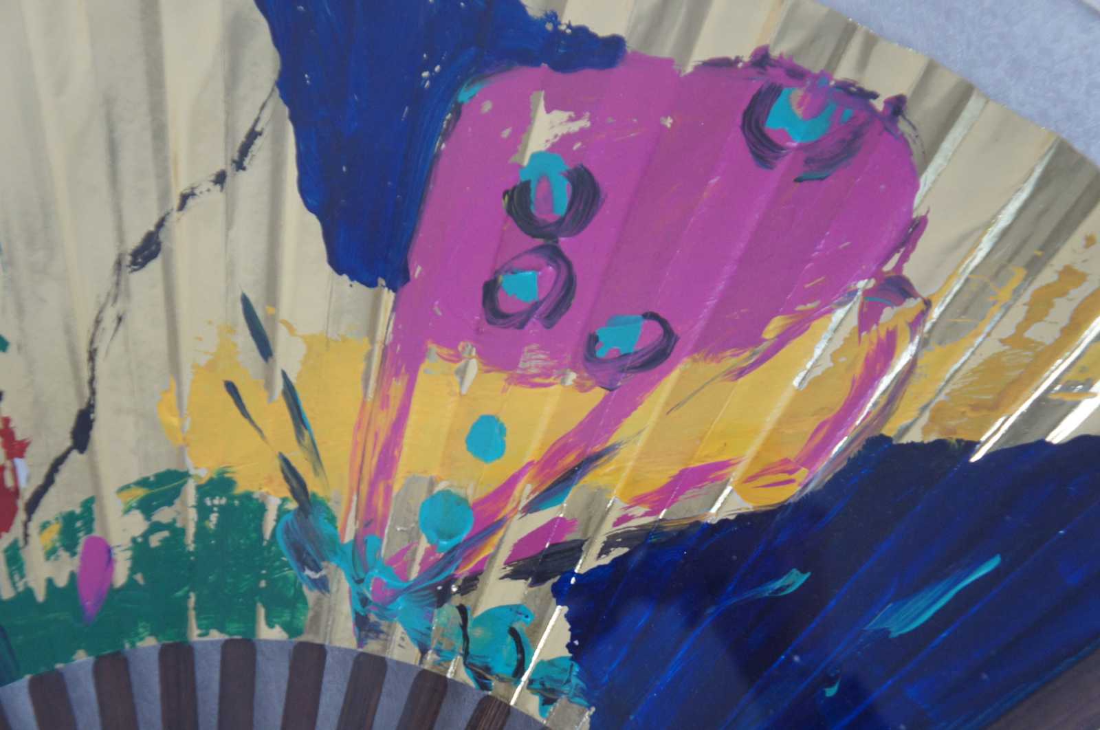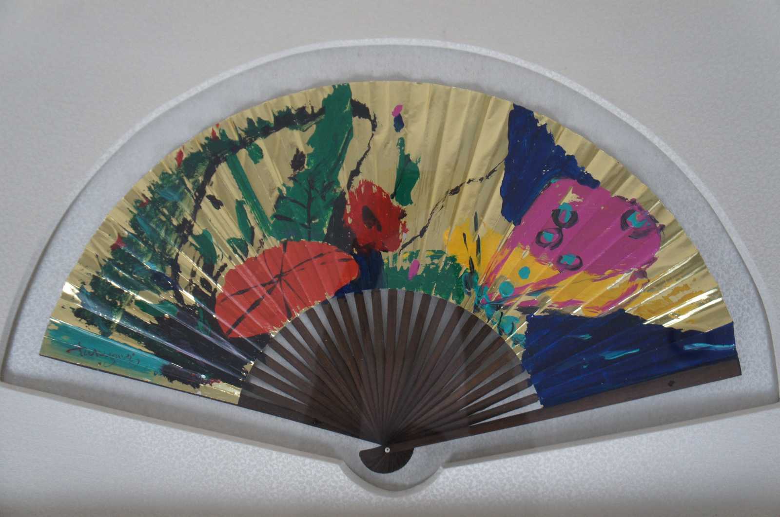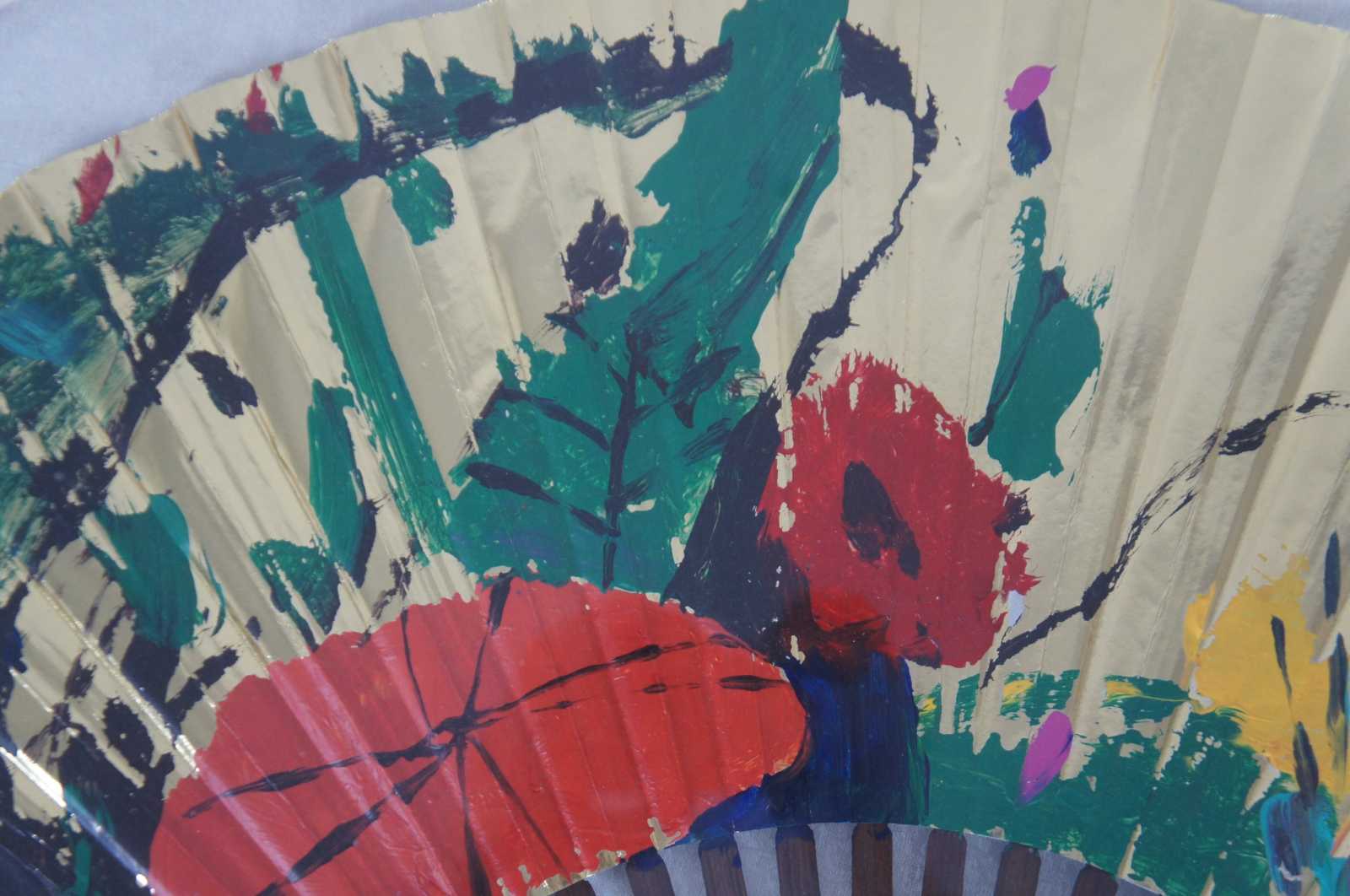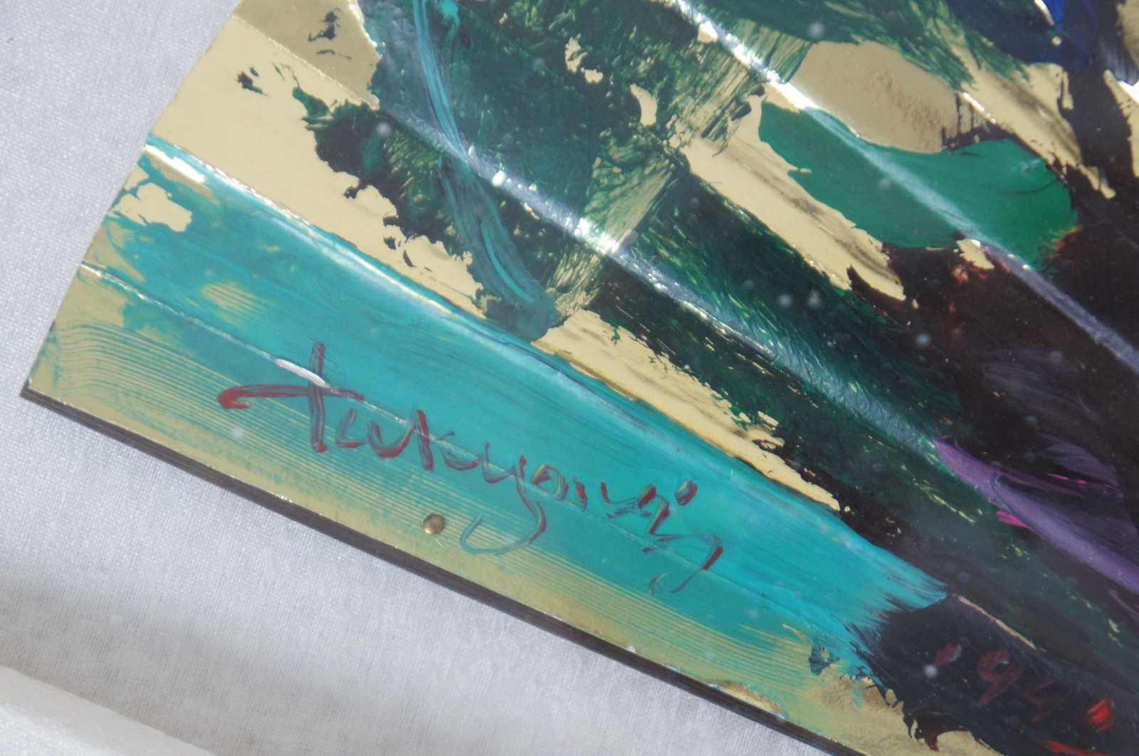 Vintage large hand painted golden fan by Tak-Young Jung from his 1991 solo exhibition “The Admiration of Life Through the Symbolization of Colors“ at the Modern Art Gallery in Los Angeles, CA. “Long regarded as paradigmatic in histories of modern art in Asia, abstraction assumed new urgency in the hands of ink painters like Jung Tak-young (b. 1937). During the politically and socially turbulent early decades of postwar Korea, Jung played an exemplary role in the Korean emergence of a self-consciously abstract ink painting through sustained experimentation that included rejecting the use of ink, the very material that crucially defined ink painting. For Jung, abstraction was a necessary platform for rethinking entrenched concepts of medium, presence, and form in hopes of arriving at a more expanded view of contemporary art.” Signed lower left.