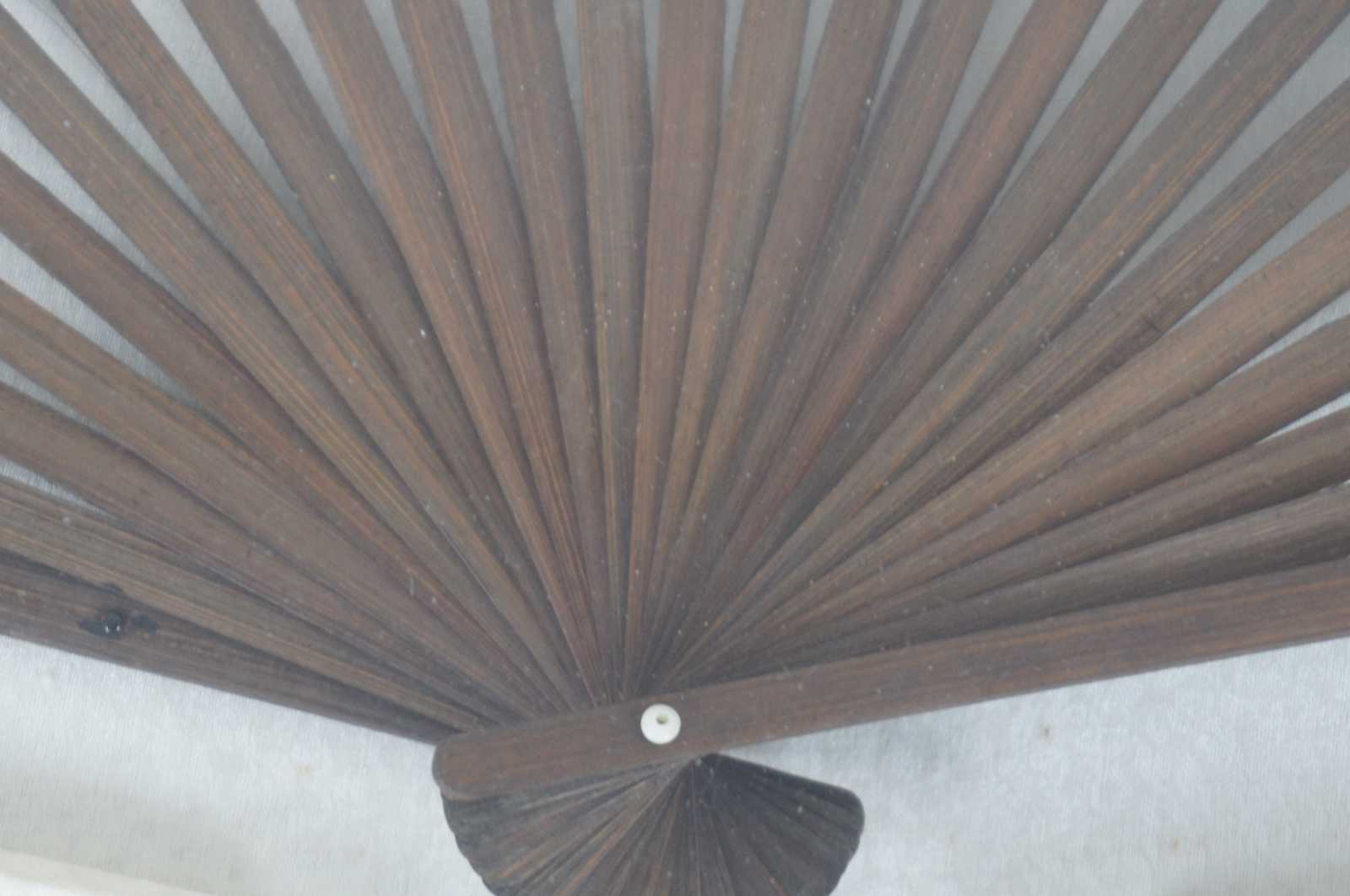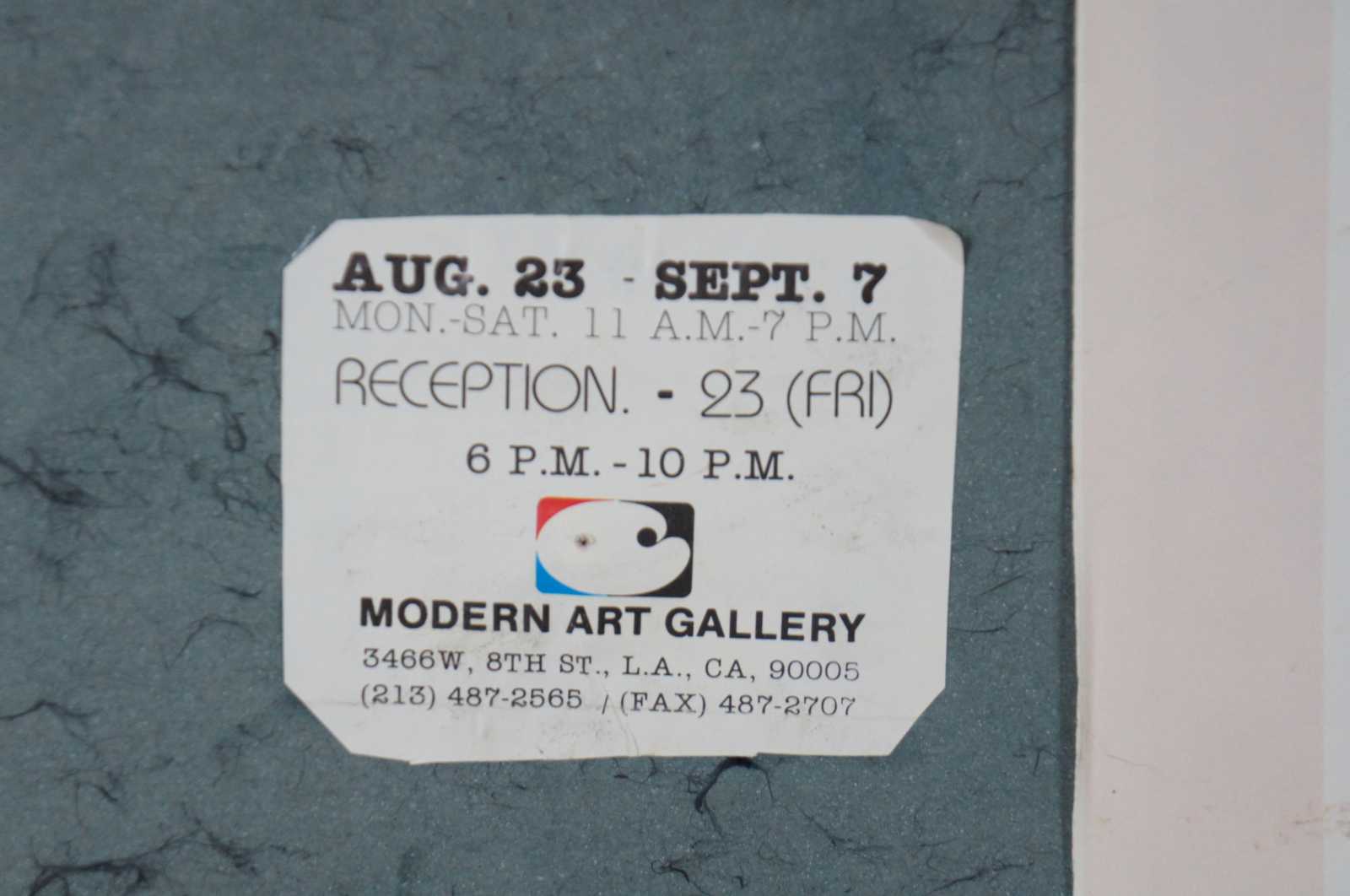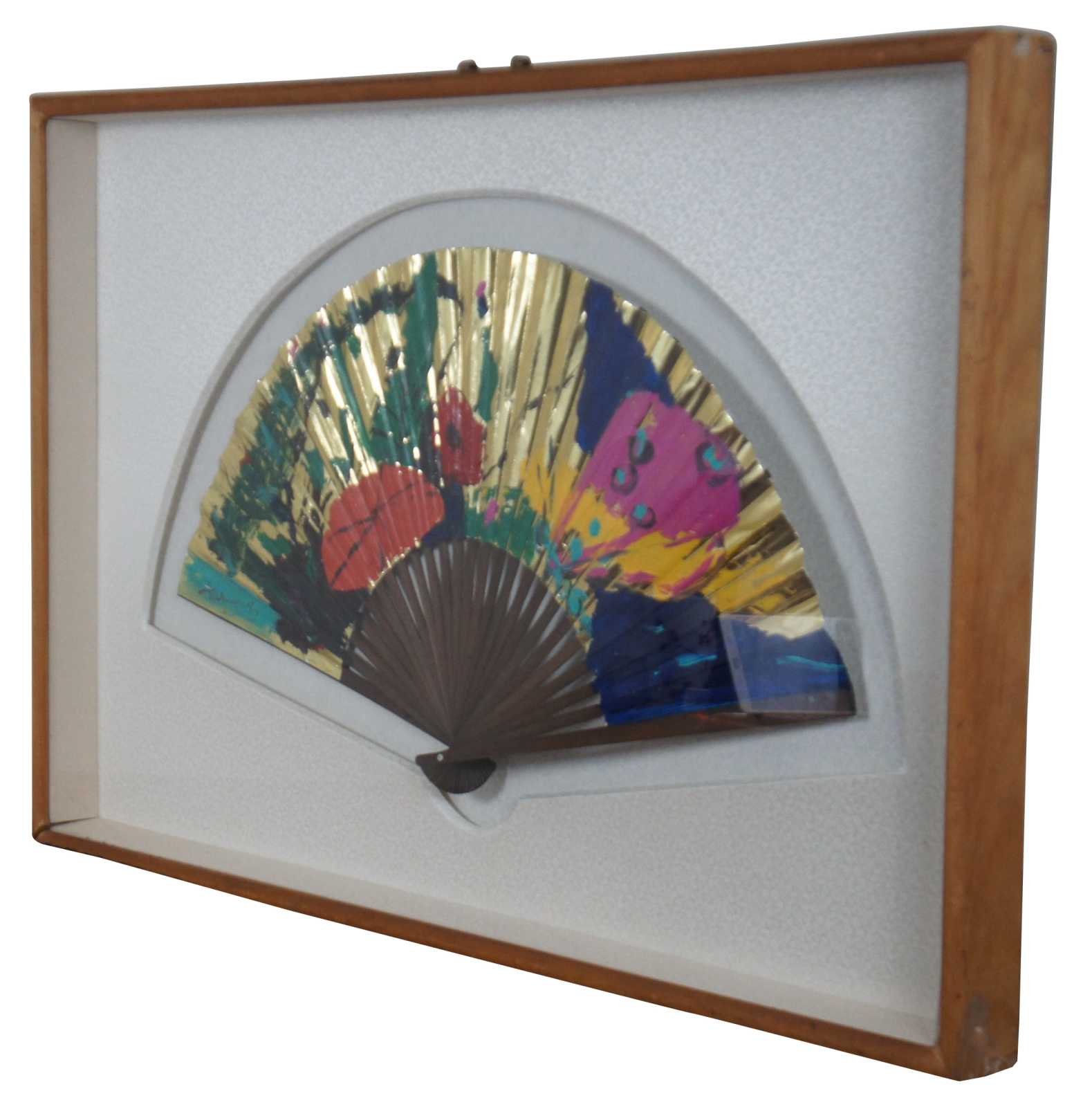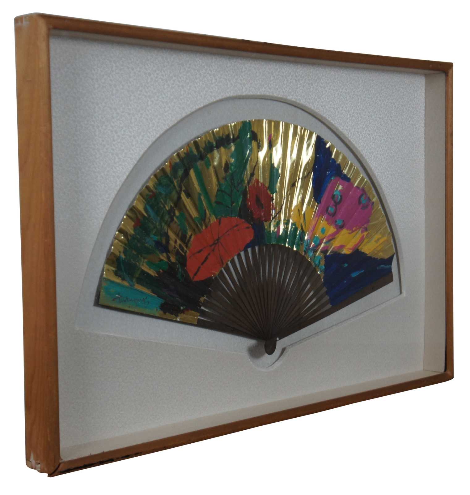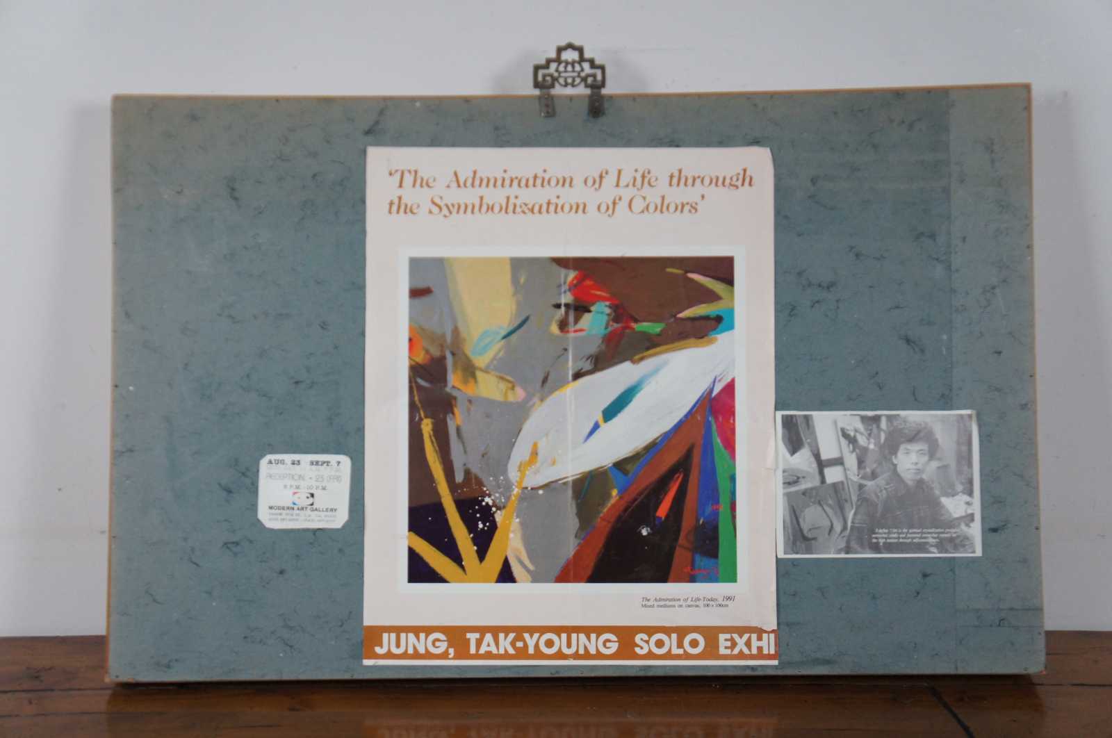 Vintage large hand painted golden fan by Tak-Young Jung from his 1991 solo exhibition “The Admiration of Life Through the Symbolization of Colors“ at the Modern Art Gallery in Los Angeles, CA. “Long regarded as paradigmatic in histories of modern art in Asia, abstraction assumed new urgency in the hands of ink painters like Jung Tak-young (b. 1937). During the politically and socially turbulent early decades of postwar Korea, Jung played an exemplary role in the Korean emergence of a self-consciously abstract ink painting through sustained experimentation that included rejecting the use of ink, the very material that crucially defined ink painting. For Jung, abstraction was a necessary platform for rethinking entrenched concepts of medium, presence, and form in hopes of arriving at a more expanded view of contemporary art.” Signed lower left.