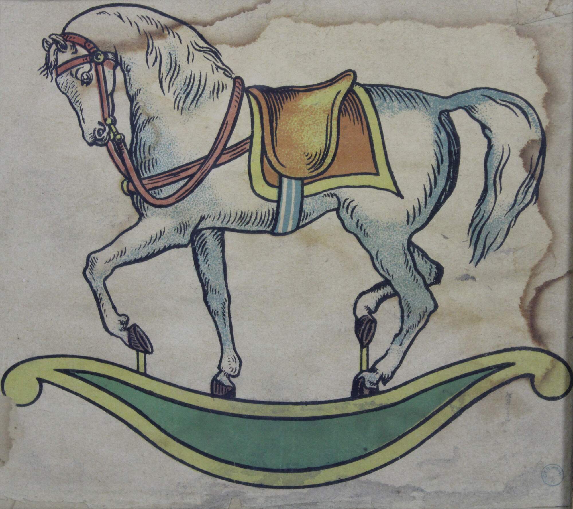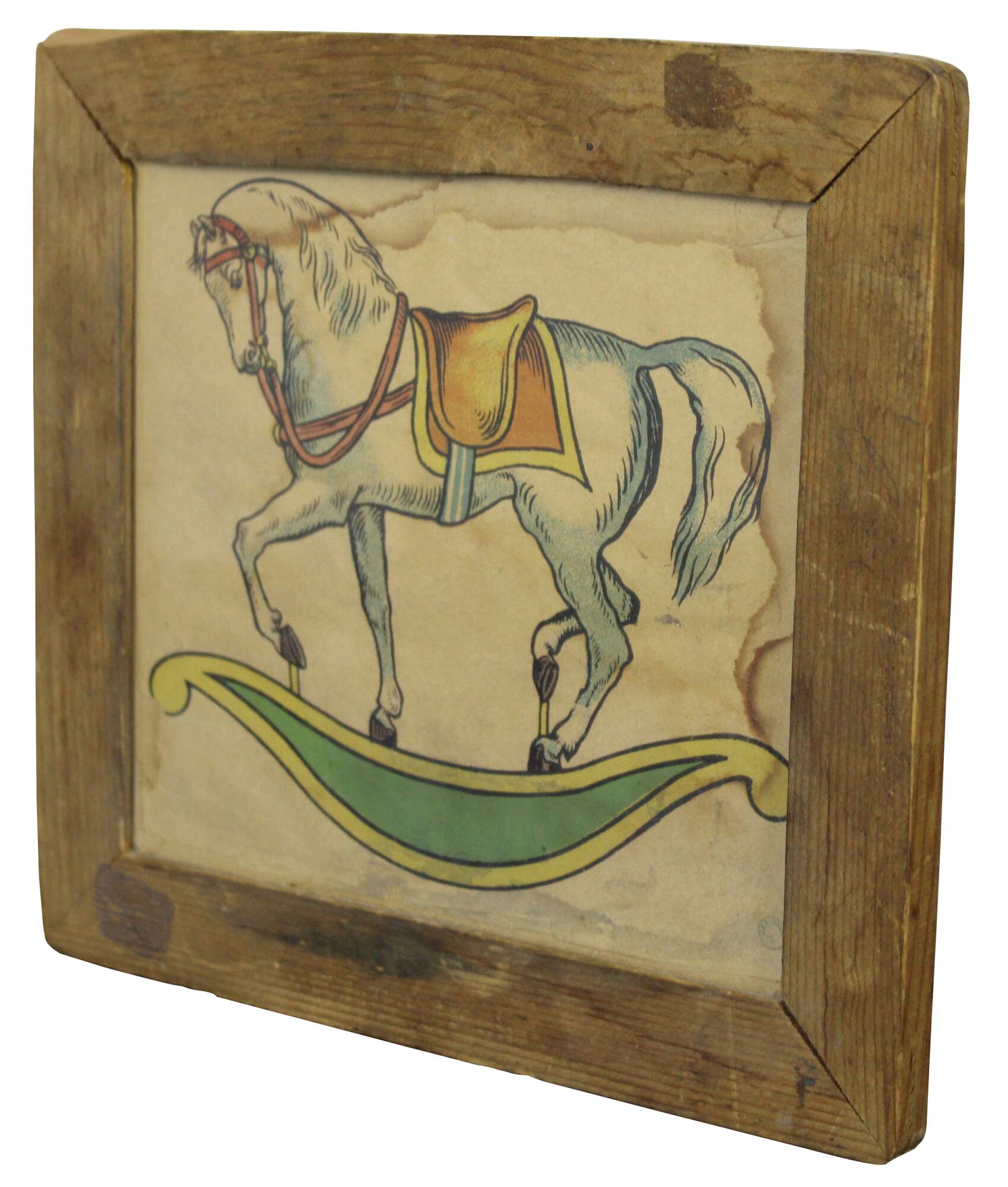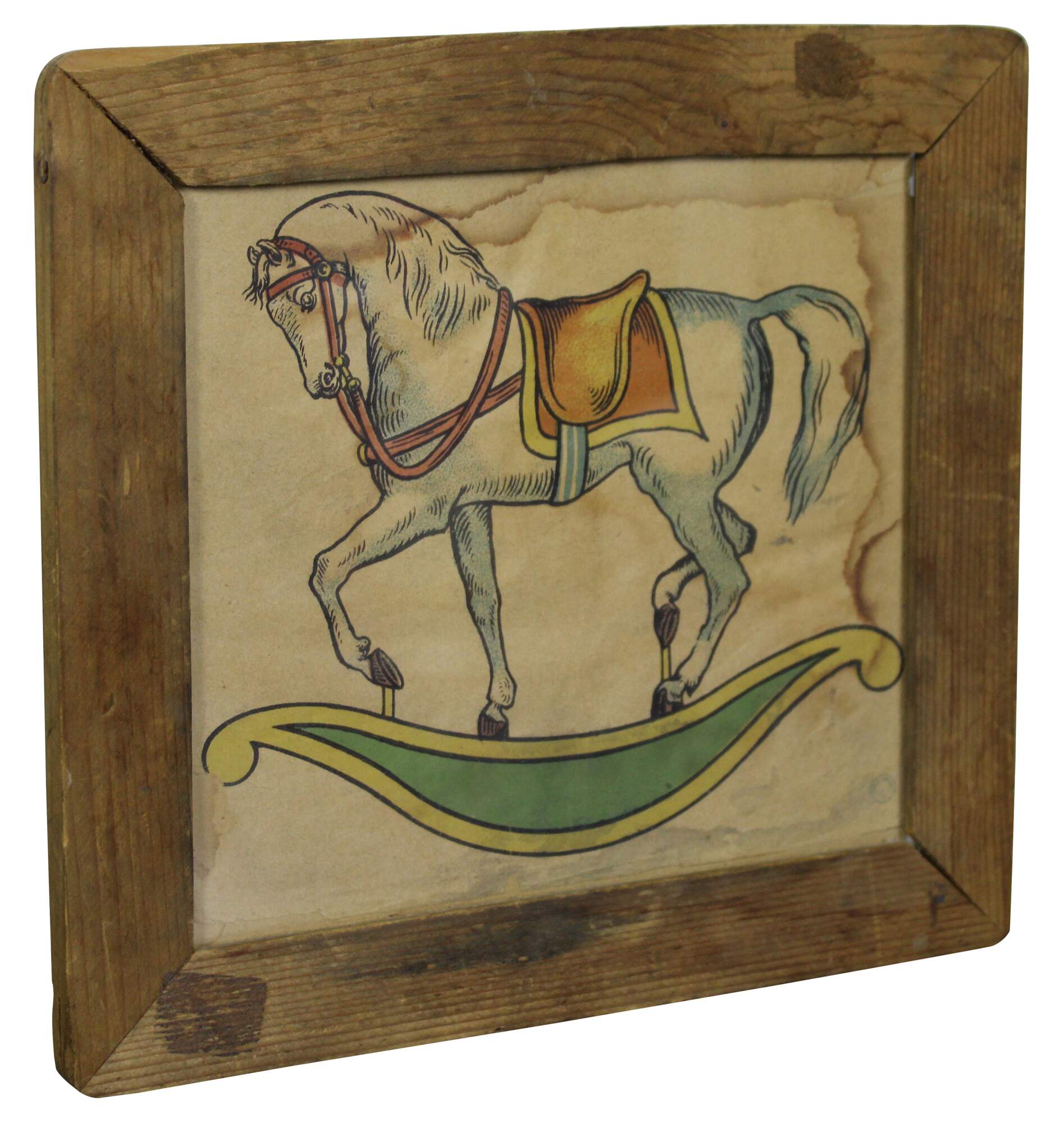 Antique picture book style print of a rocking horse, framed in a simple, primitive frame; print marked “Germany” in the lower corner.