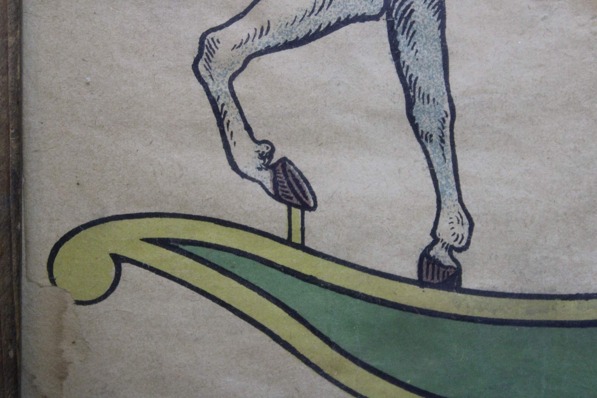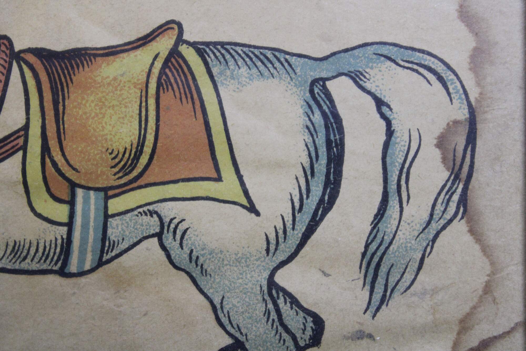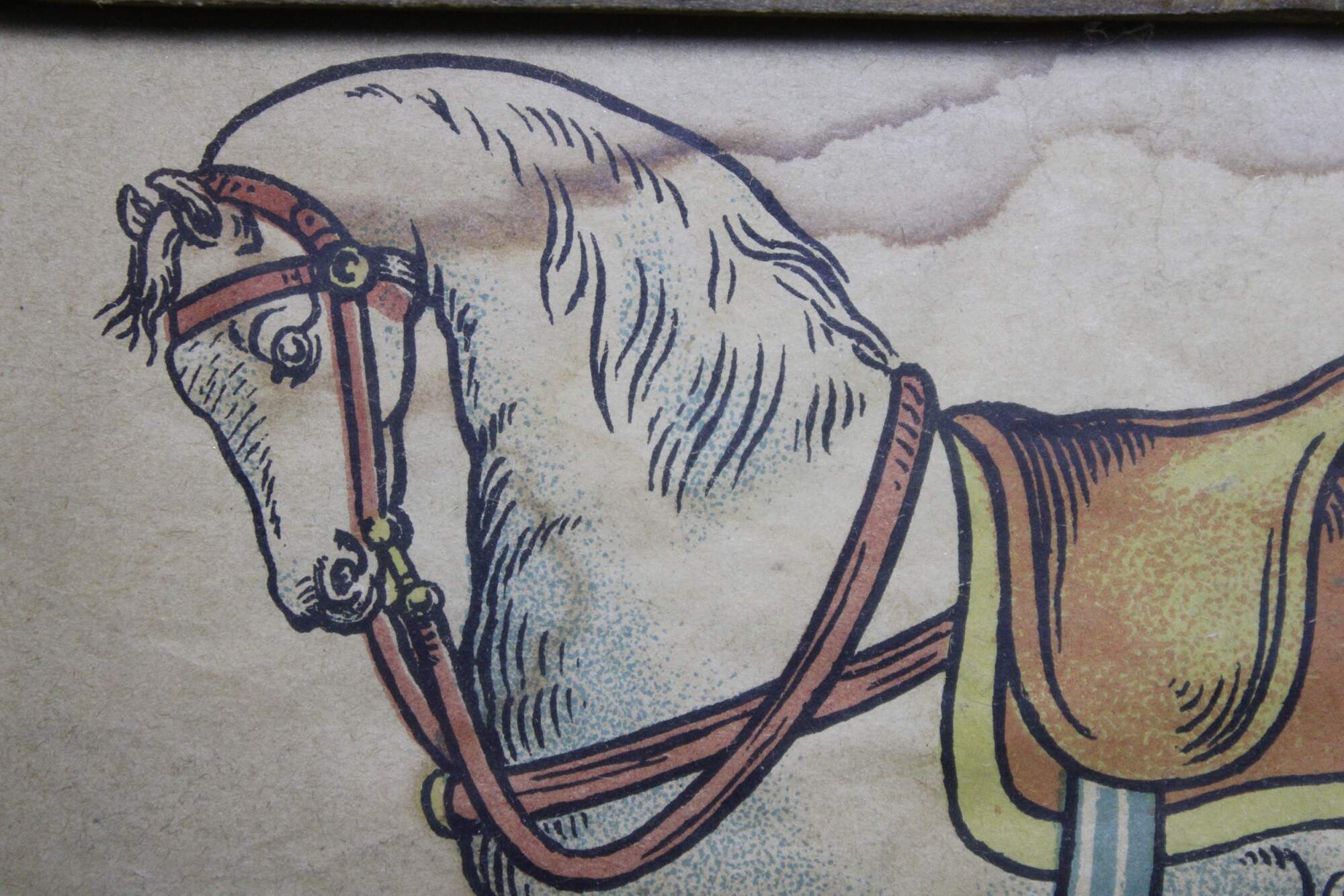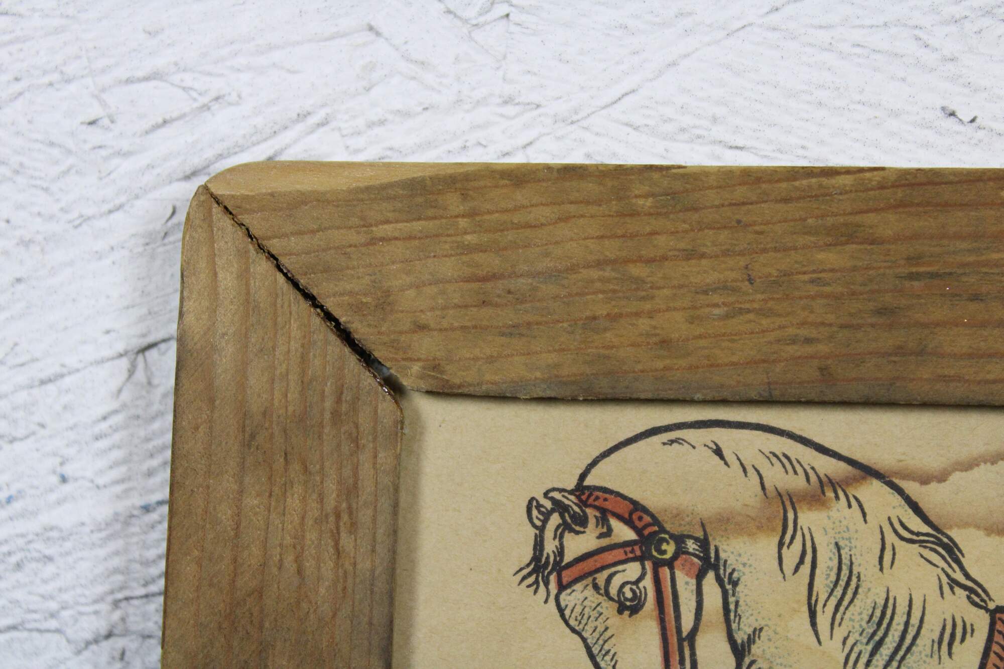 Antique picture book style print of a rocking horse, framed in a simple, primitive frame; print marked “Germany” in the lower corner.