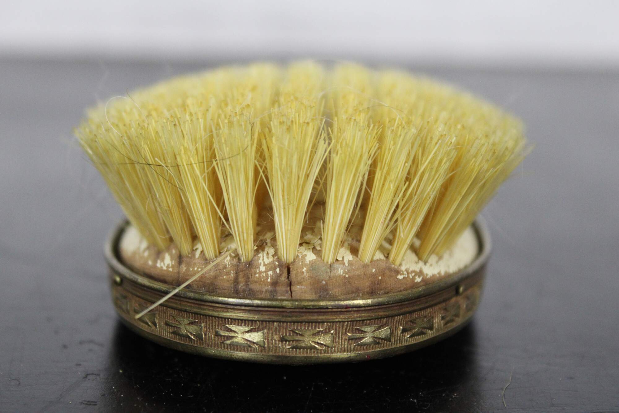 Antique brass handled hair brush with wooden bristle pad, horse hair bristles, black plastic back and guilloche enamel cameo accent.