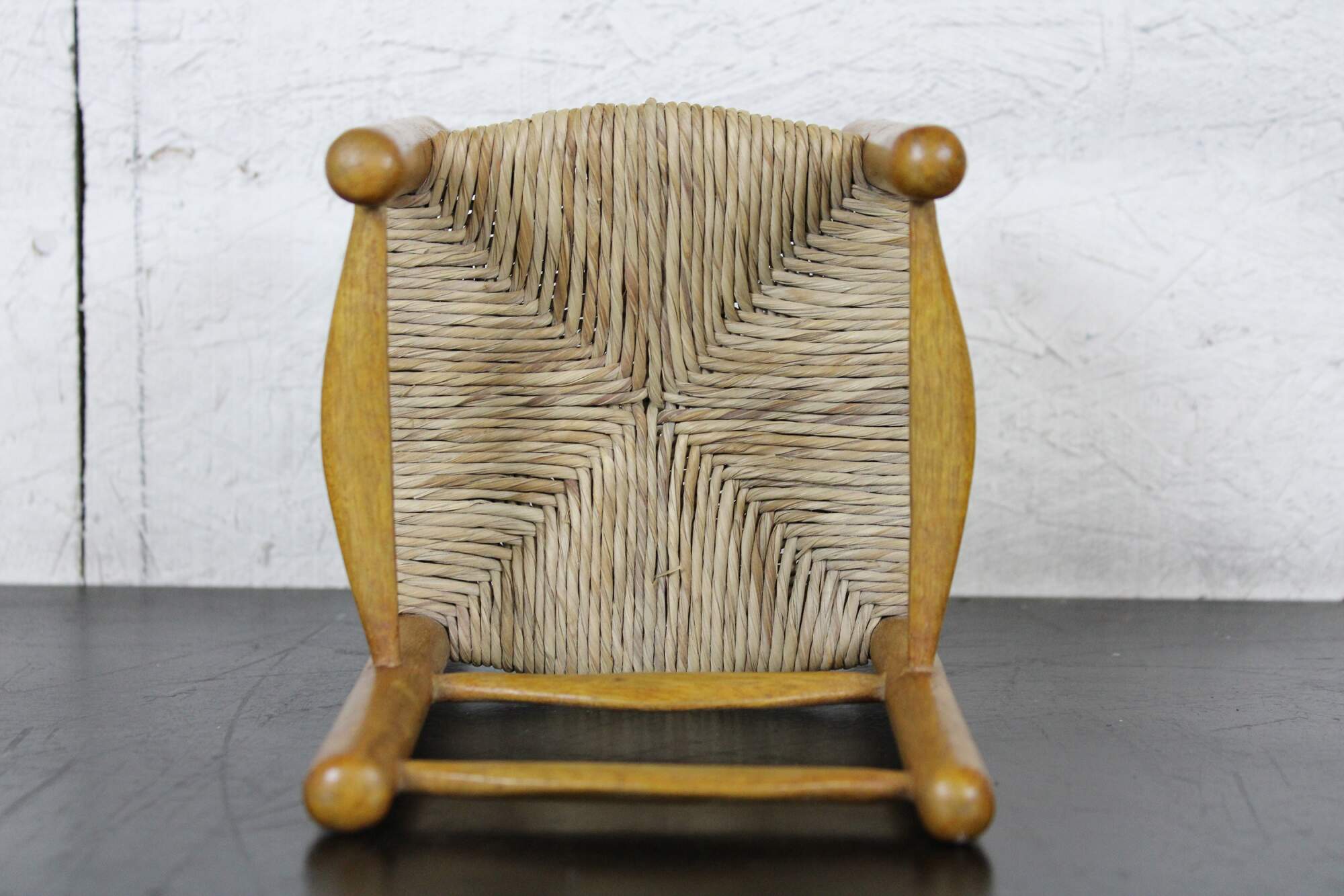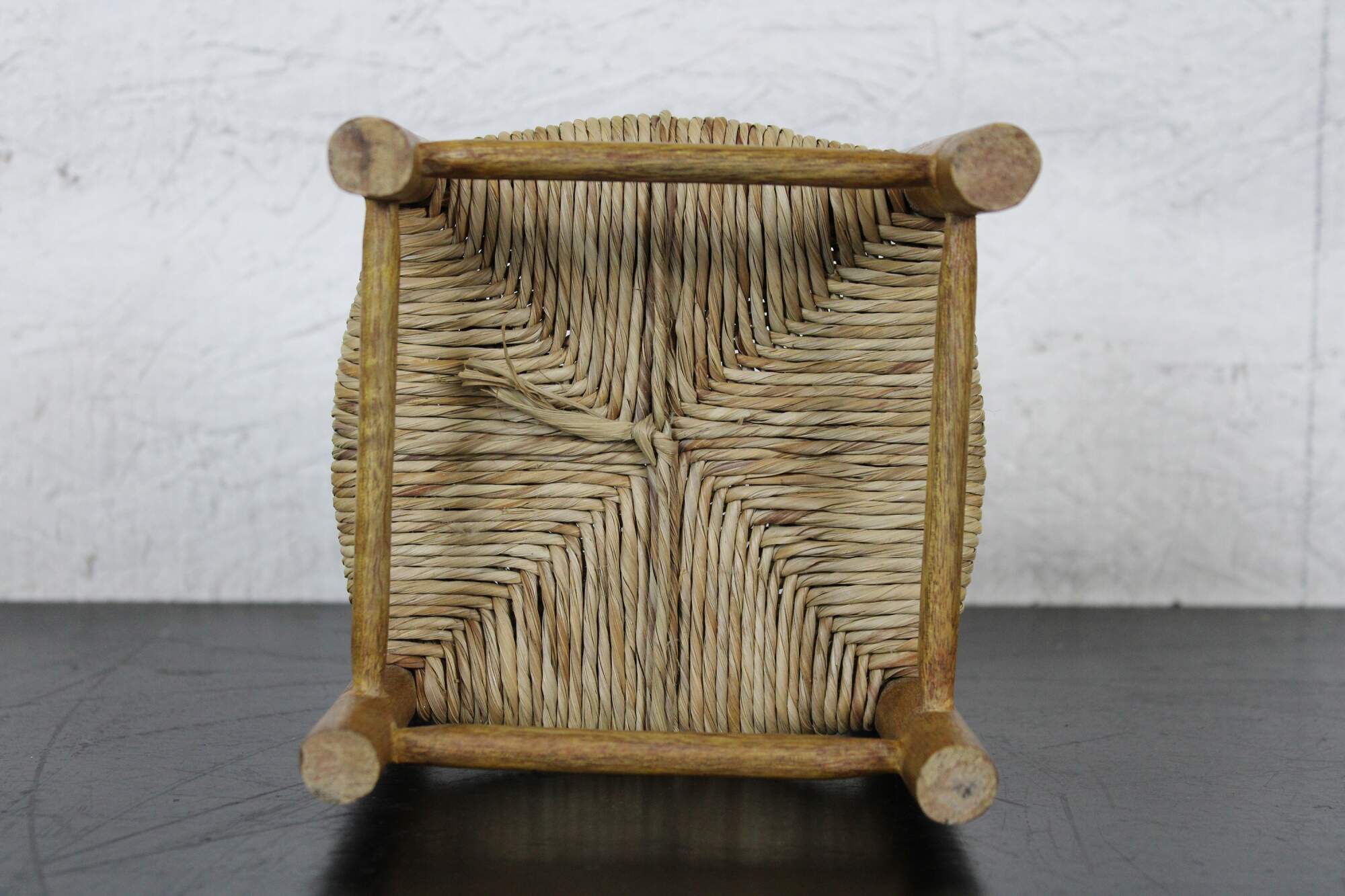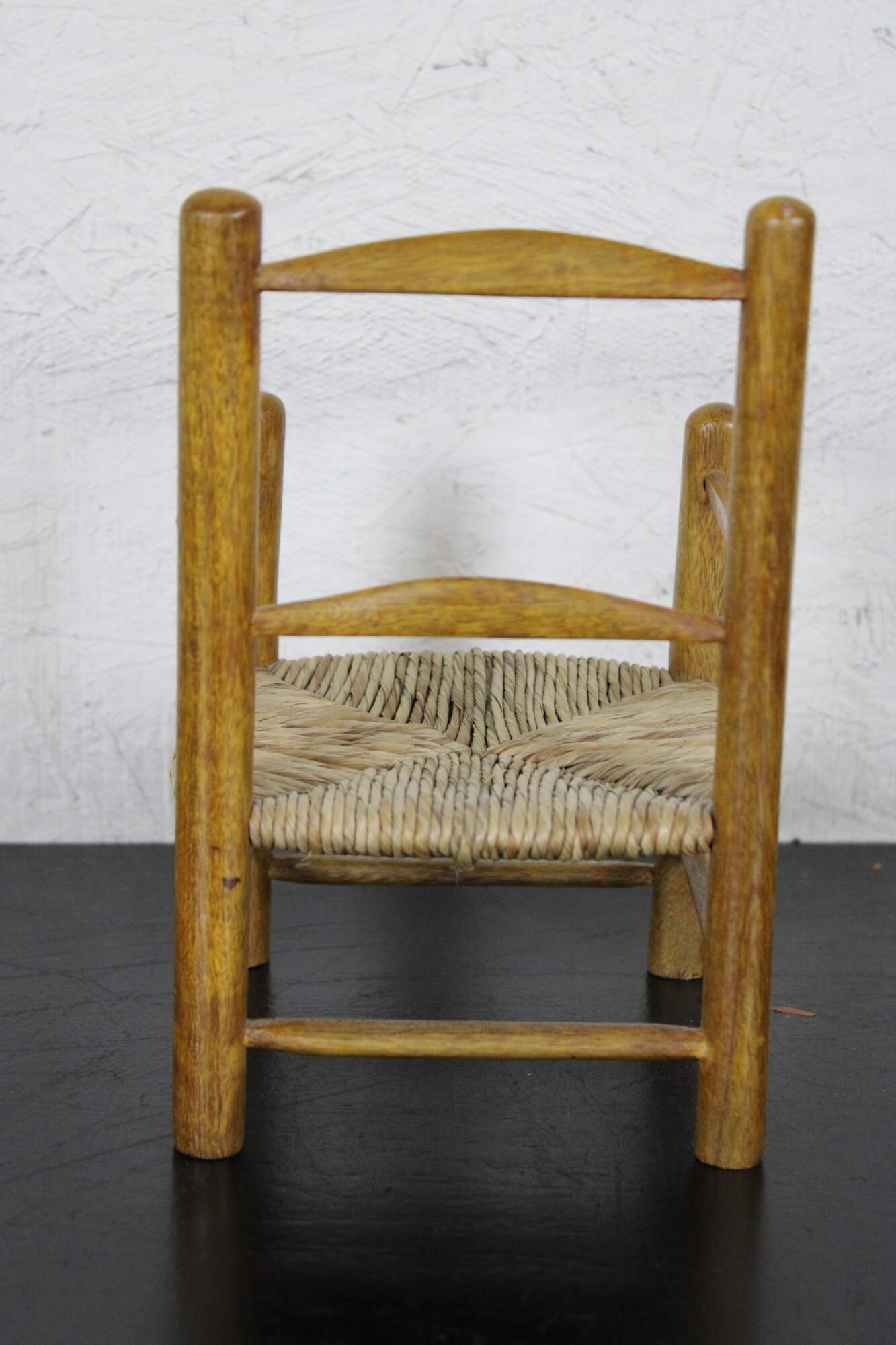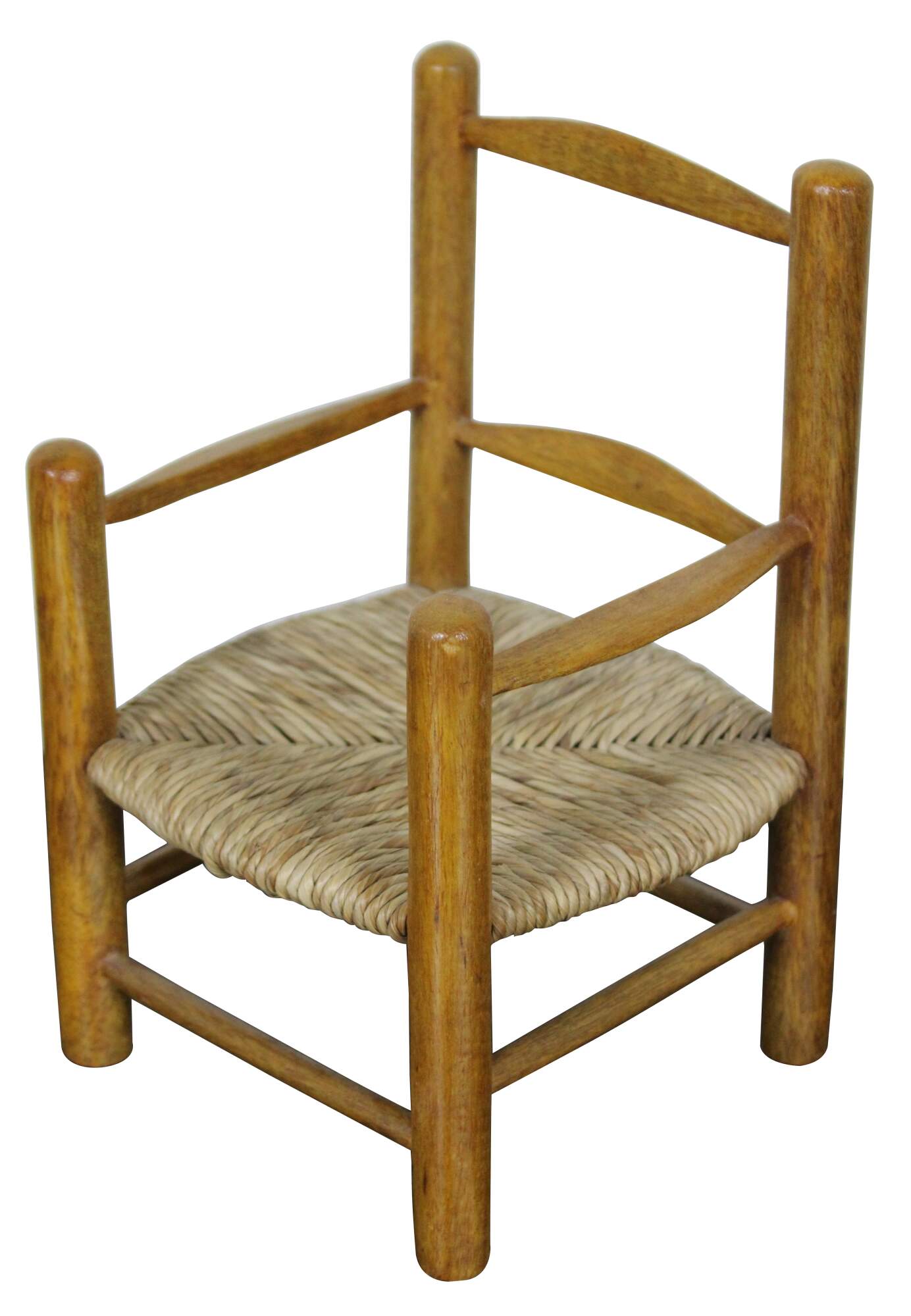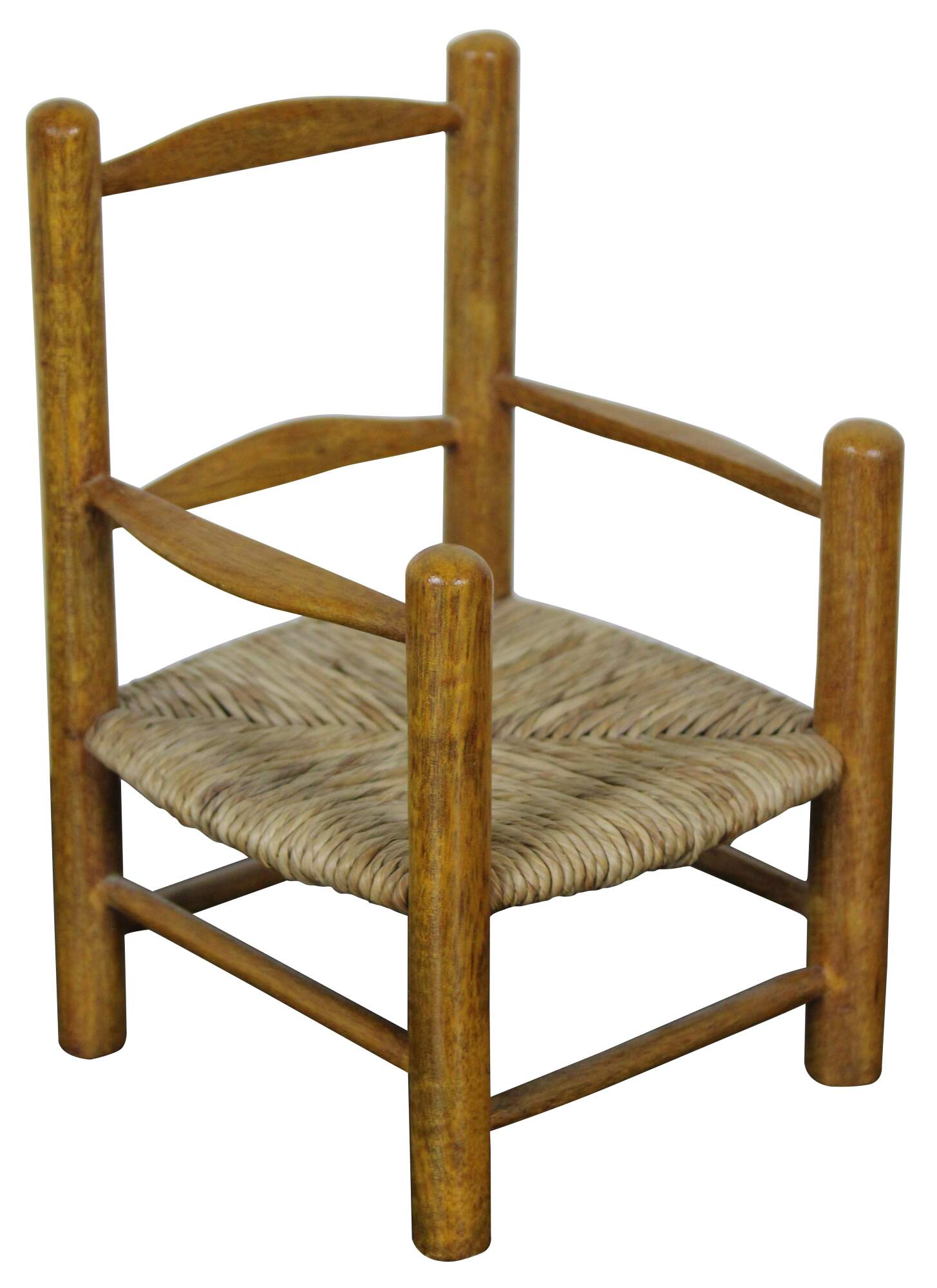 Antique country style doll sized rush seat arm chair.
