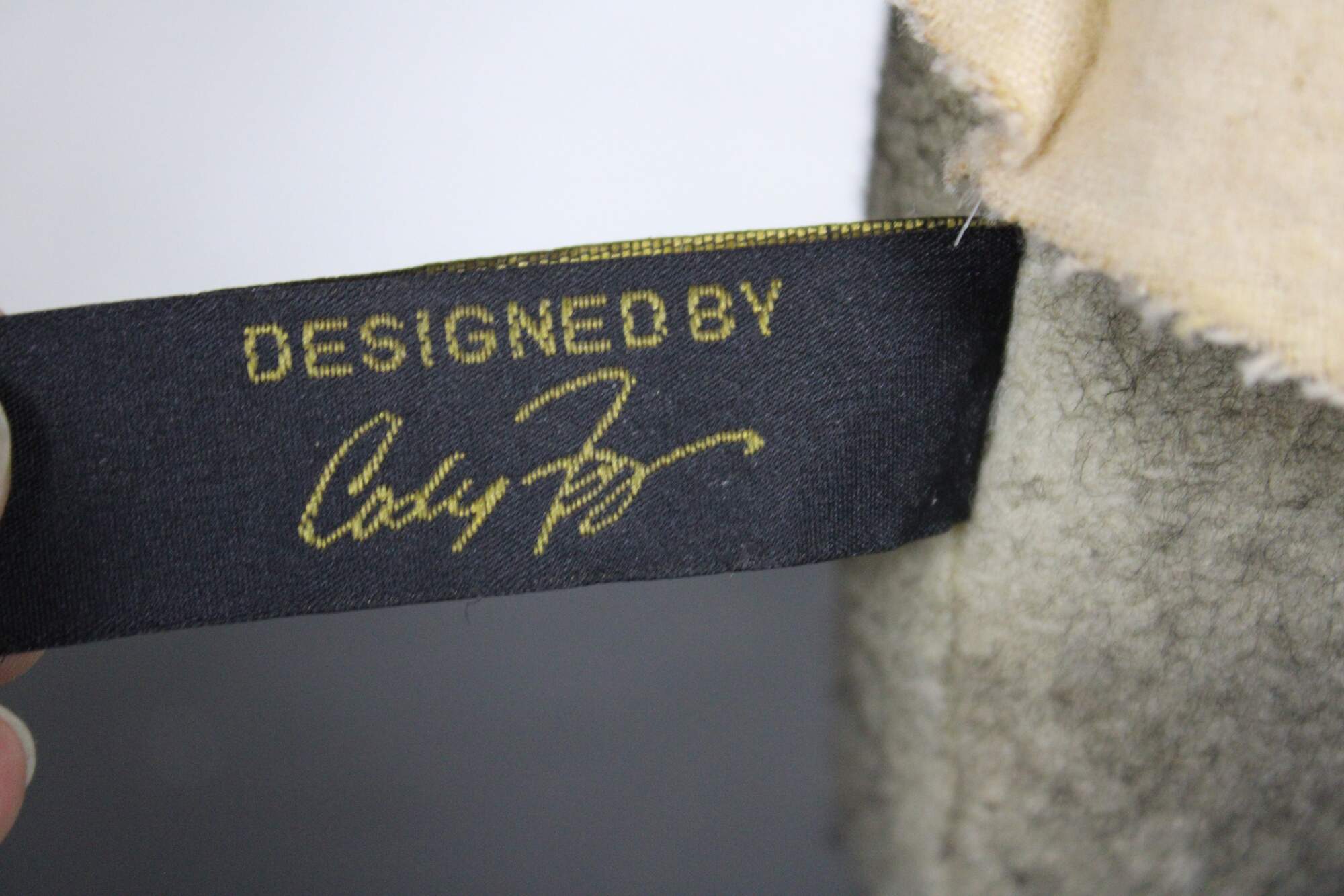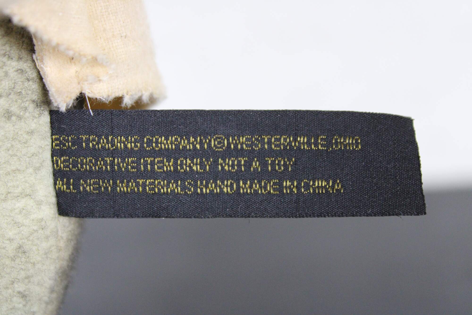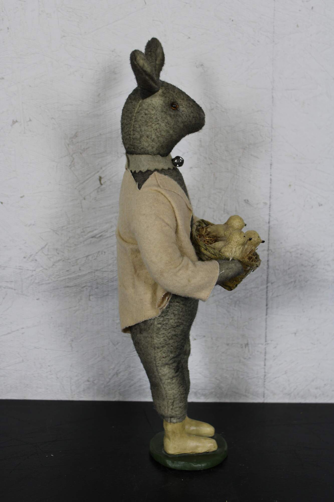 Folk art style stuffed animal ornament figurine in the shape of a gray rabbit wearing a jacket and collar, holding a basket of chicks, standing on a plaster base with painted shoes. Designed by Cody Foster for ESC Trading Company.