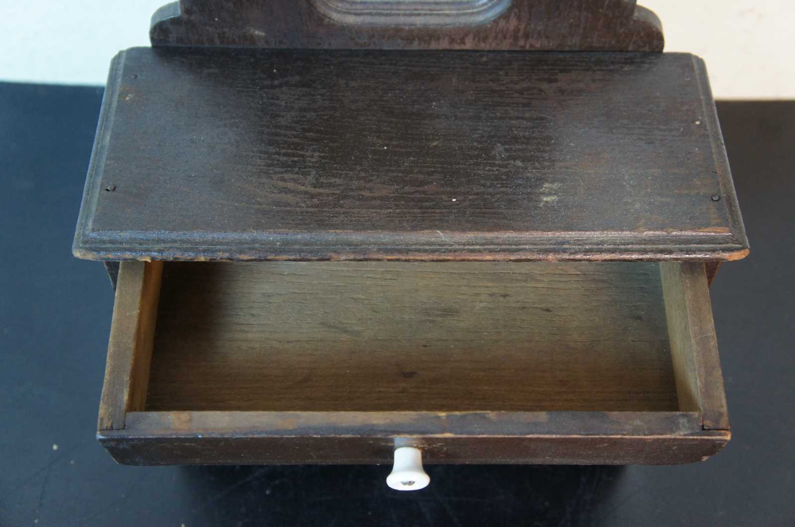 Antique 19th century Victorian salesman sample miniature pine mirrored dresser with one drawer over a two shelf cabinet.