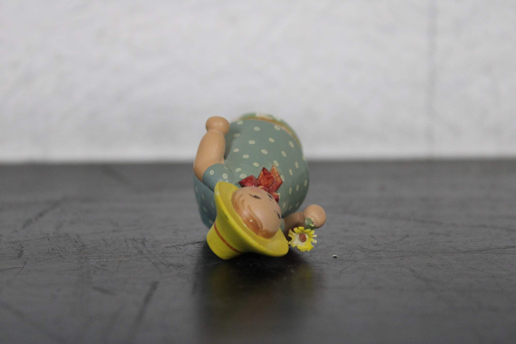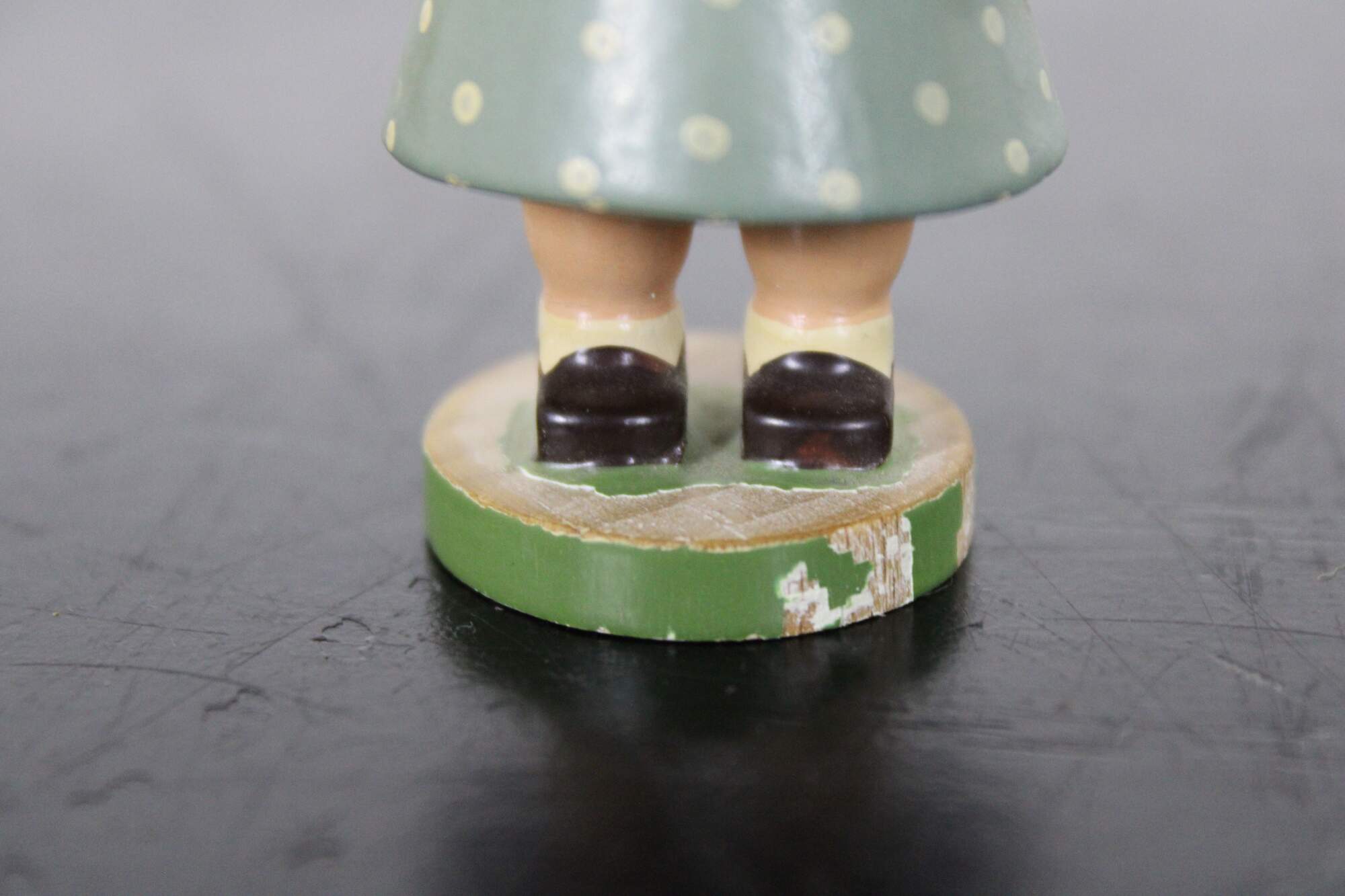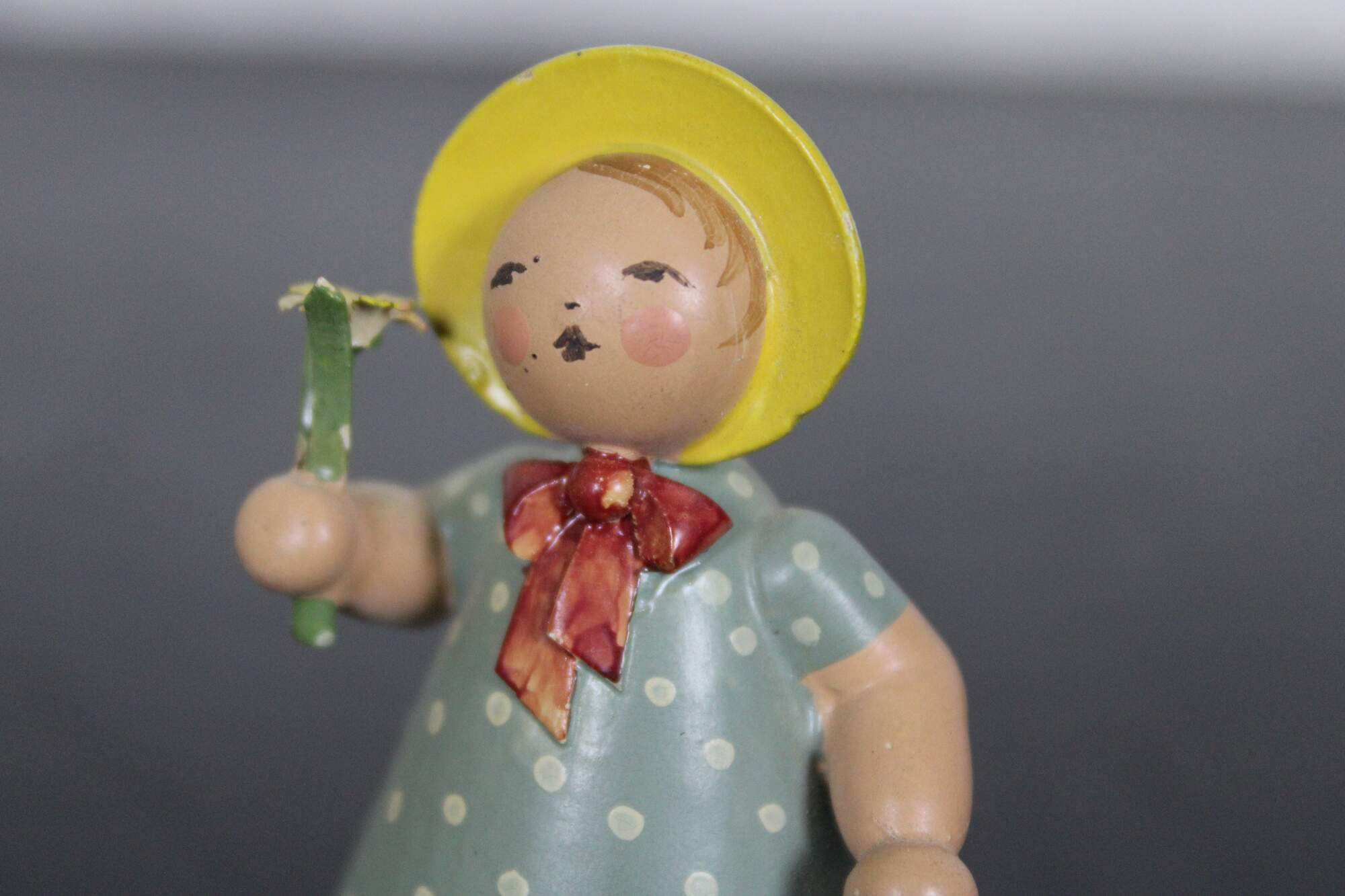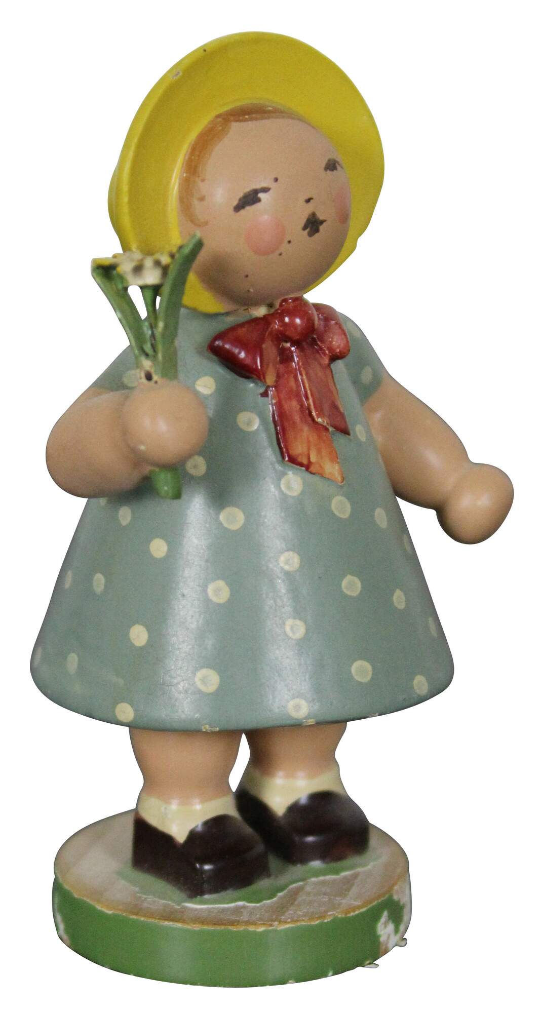 Vintage Expertic German Erzgebirge W K hand painted wood figurine of a young maiden girl wearing a bonnet, dressed in a blue polka dot dress, holding a daisy.