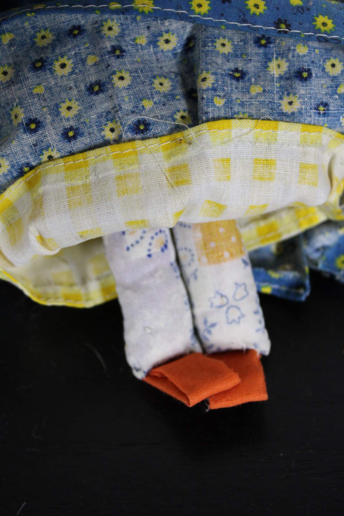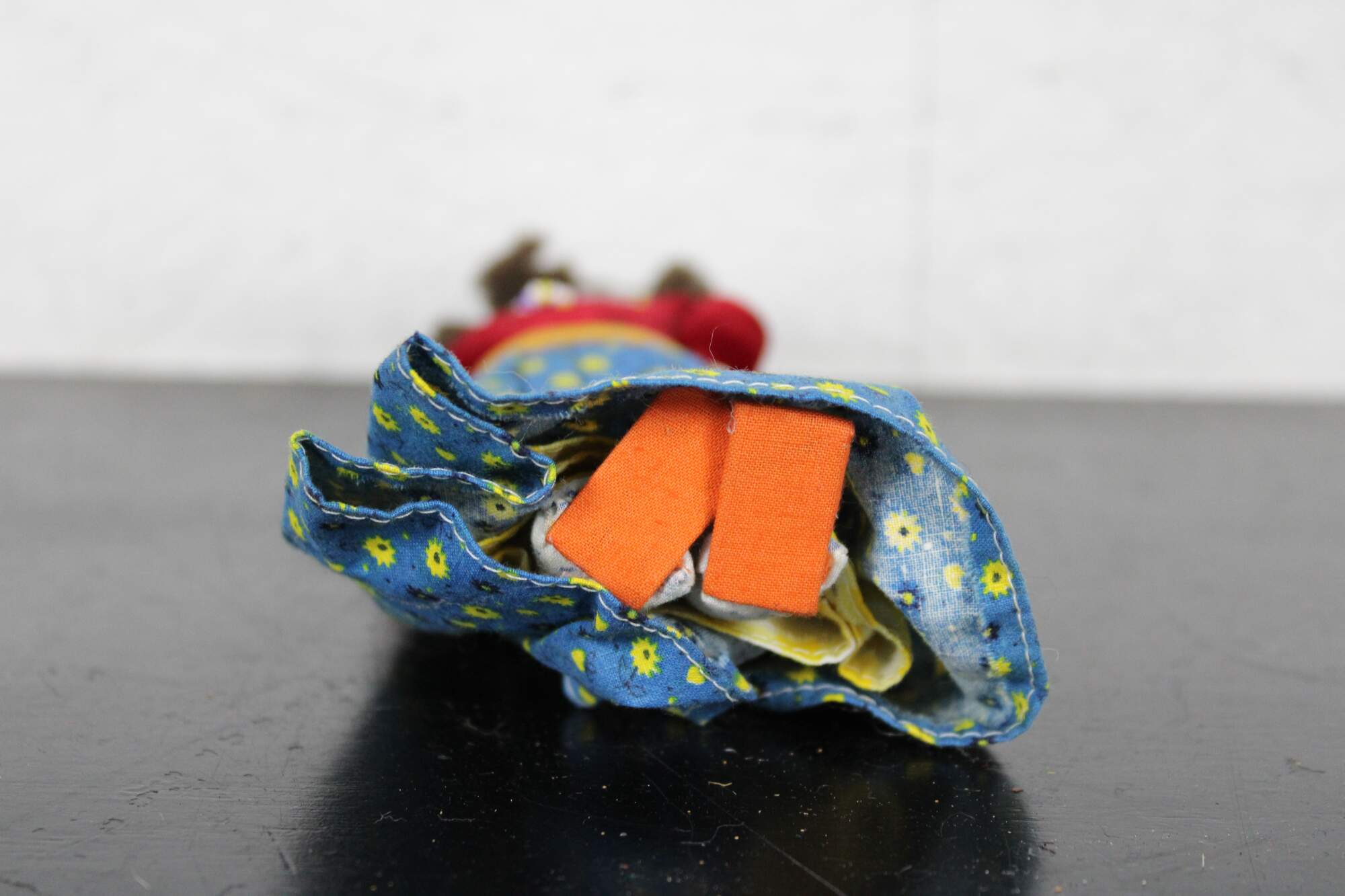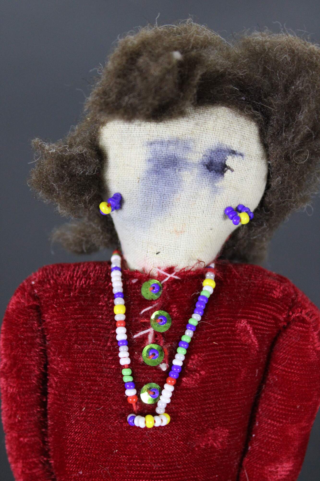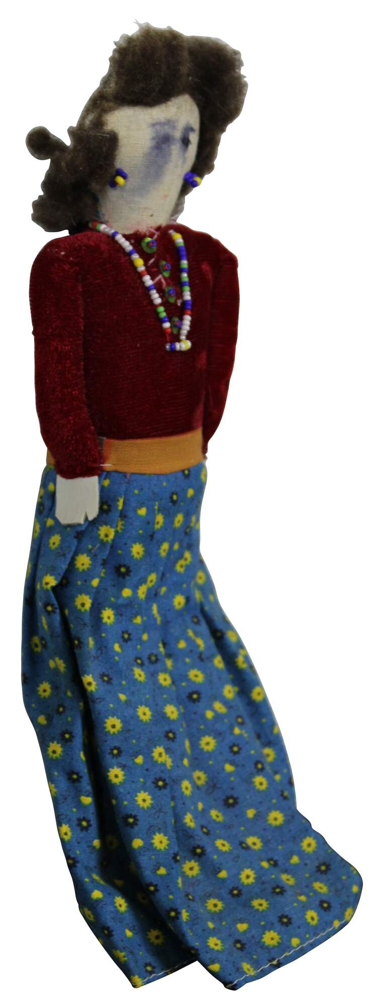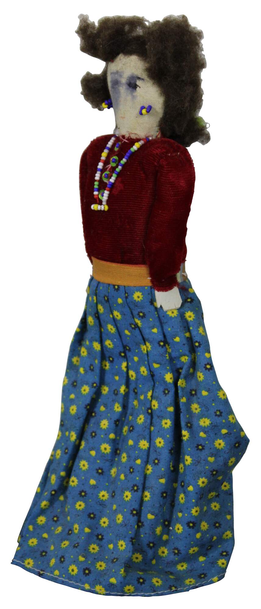 Vintage Navajo folk art cloth doll dressed in a velvet top and printed cotton skirt, with beaded jewelry and inked face.