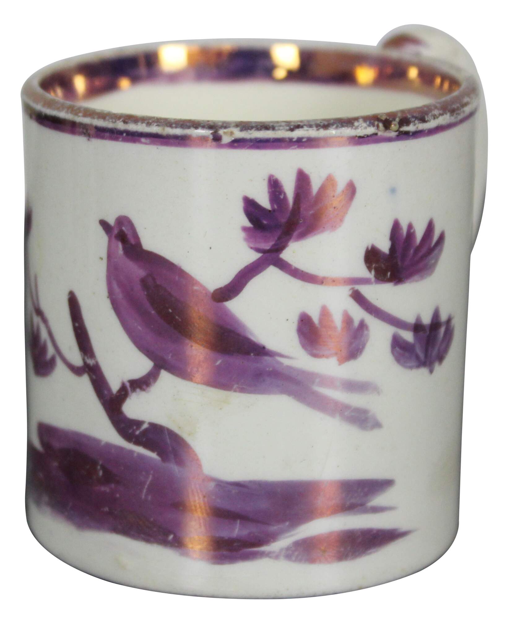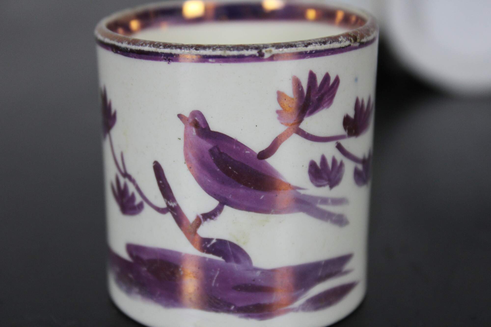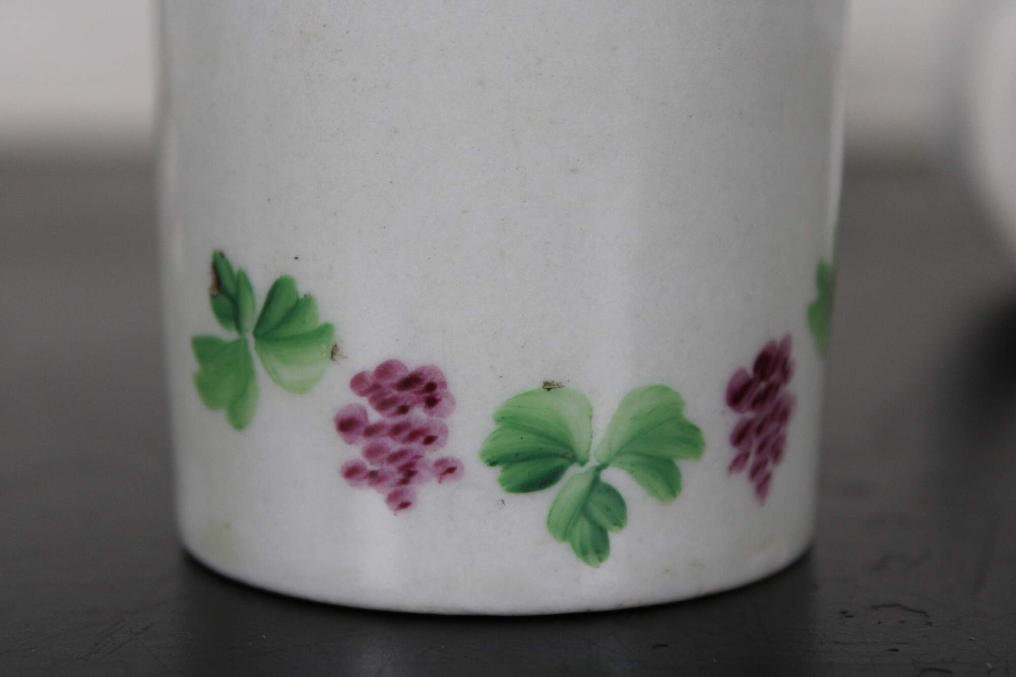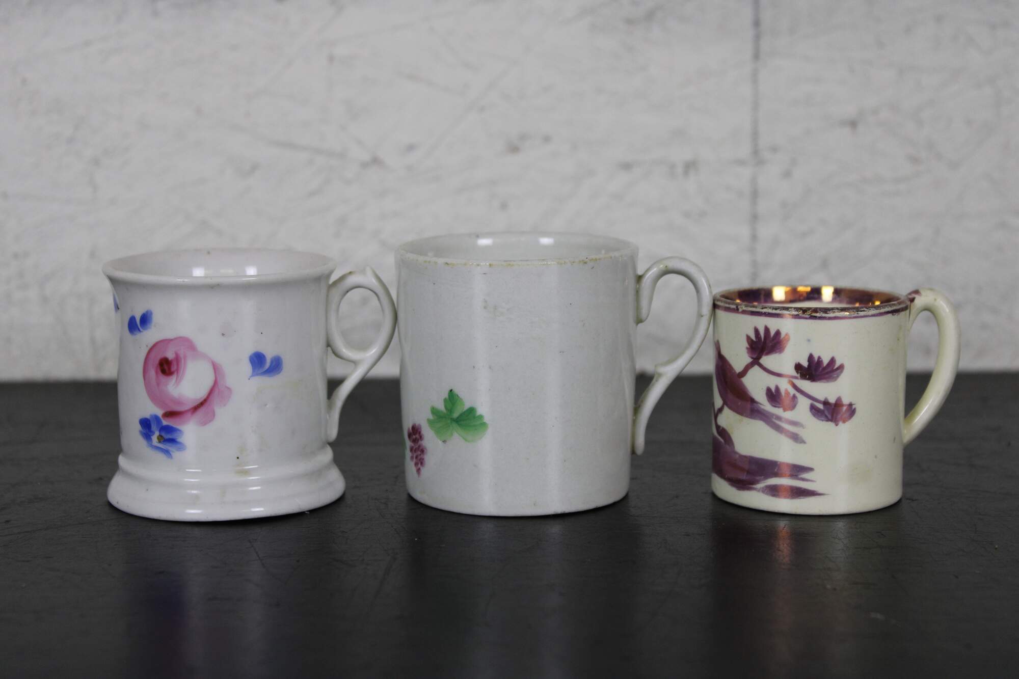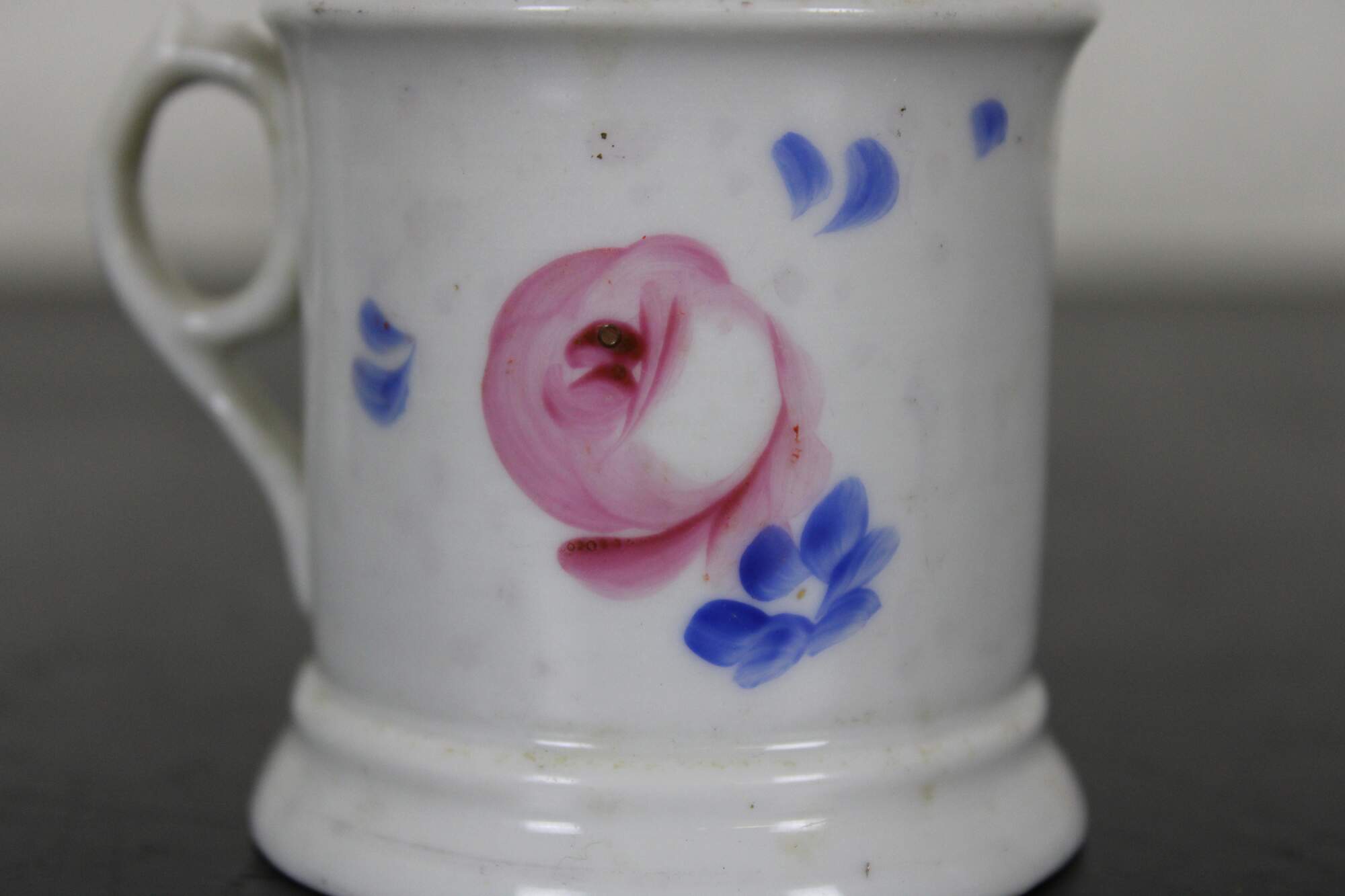 Lot of three vintage miniature porcelain mugs featuring roses, a grape vine, and a bird on a branch.
