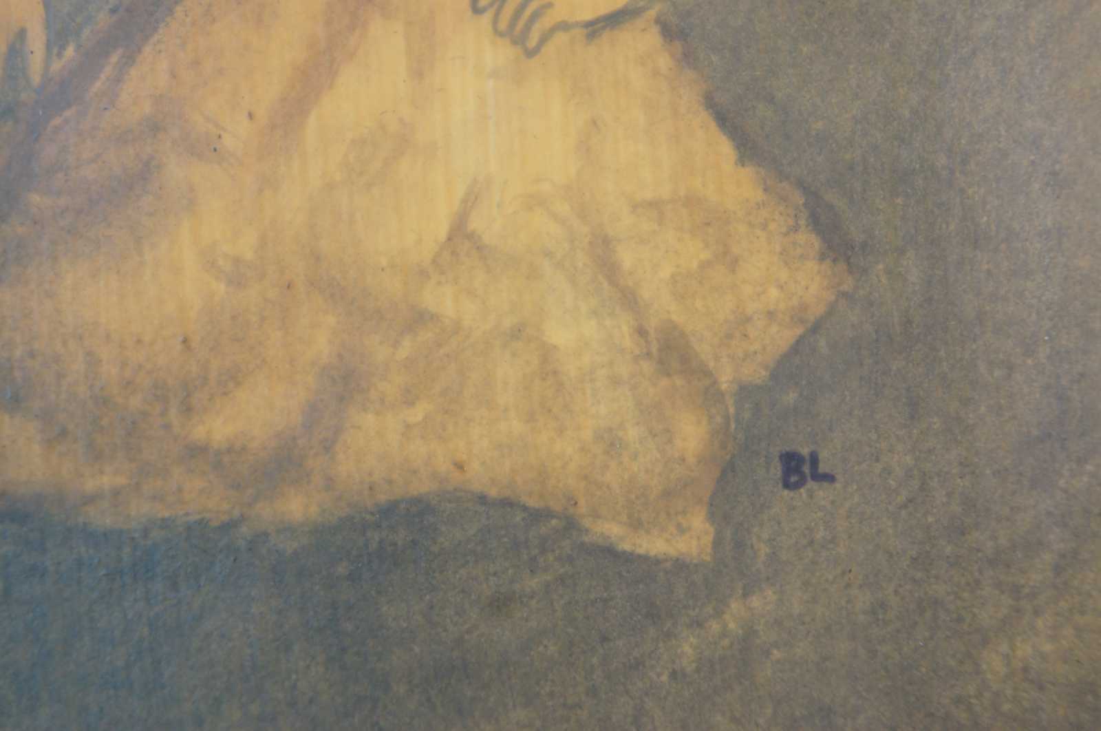Vintage watercolor painting of a young colonial girl in antique clothing reminiscent of 17th century pilgrims, signed on reverse “Billy Lynch 2007.”