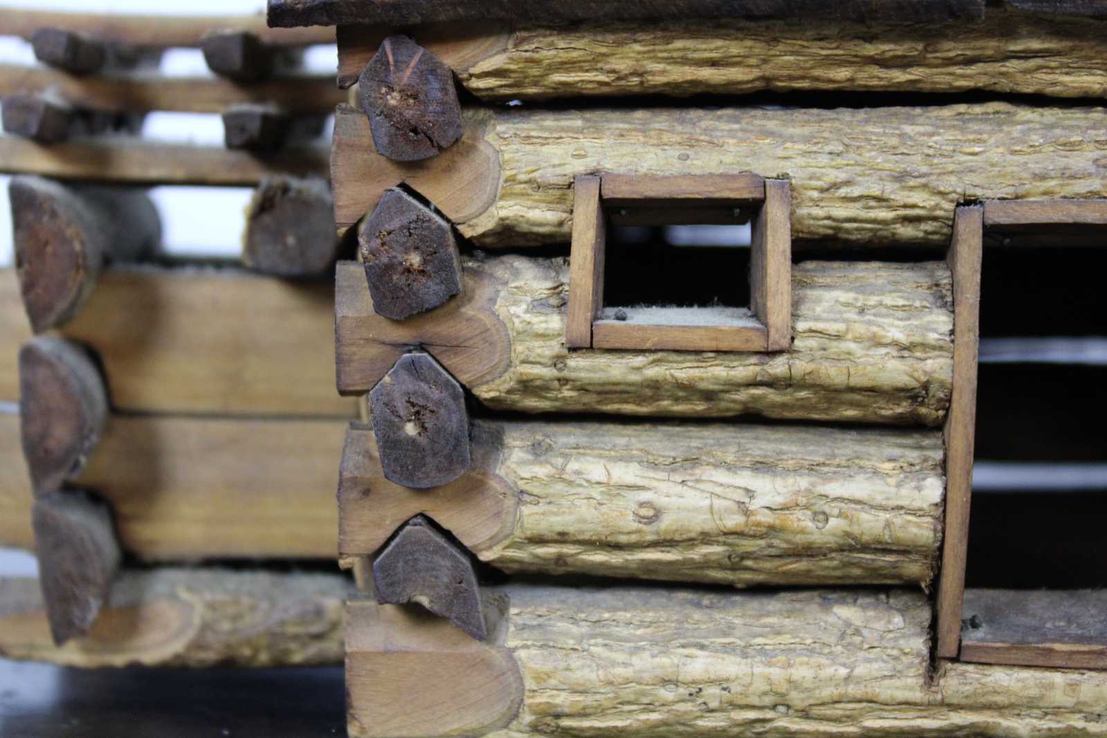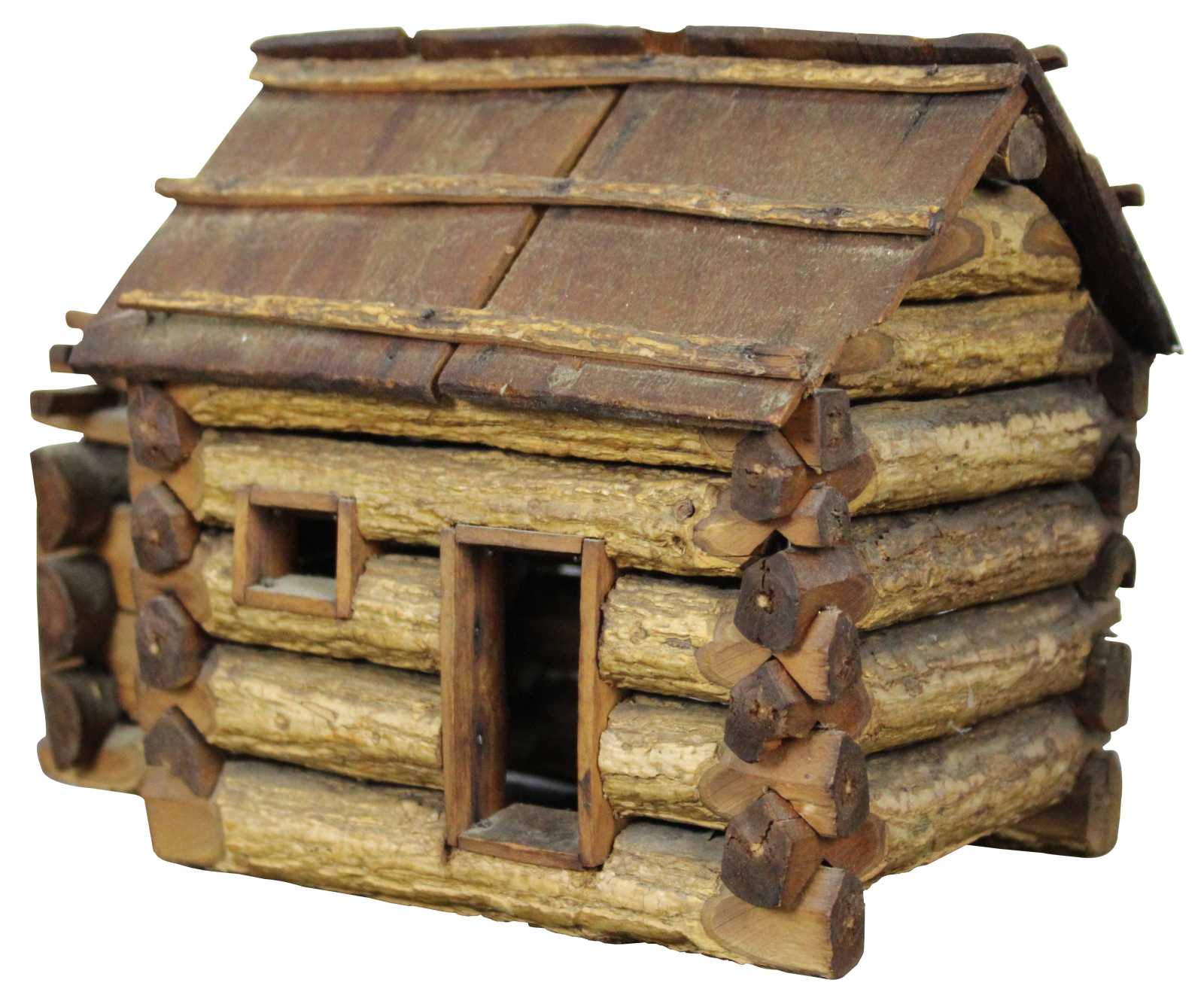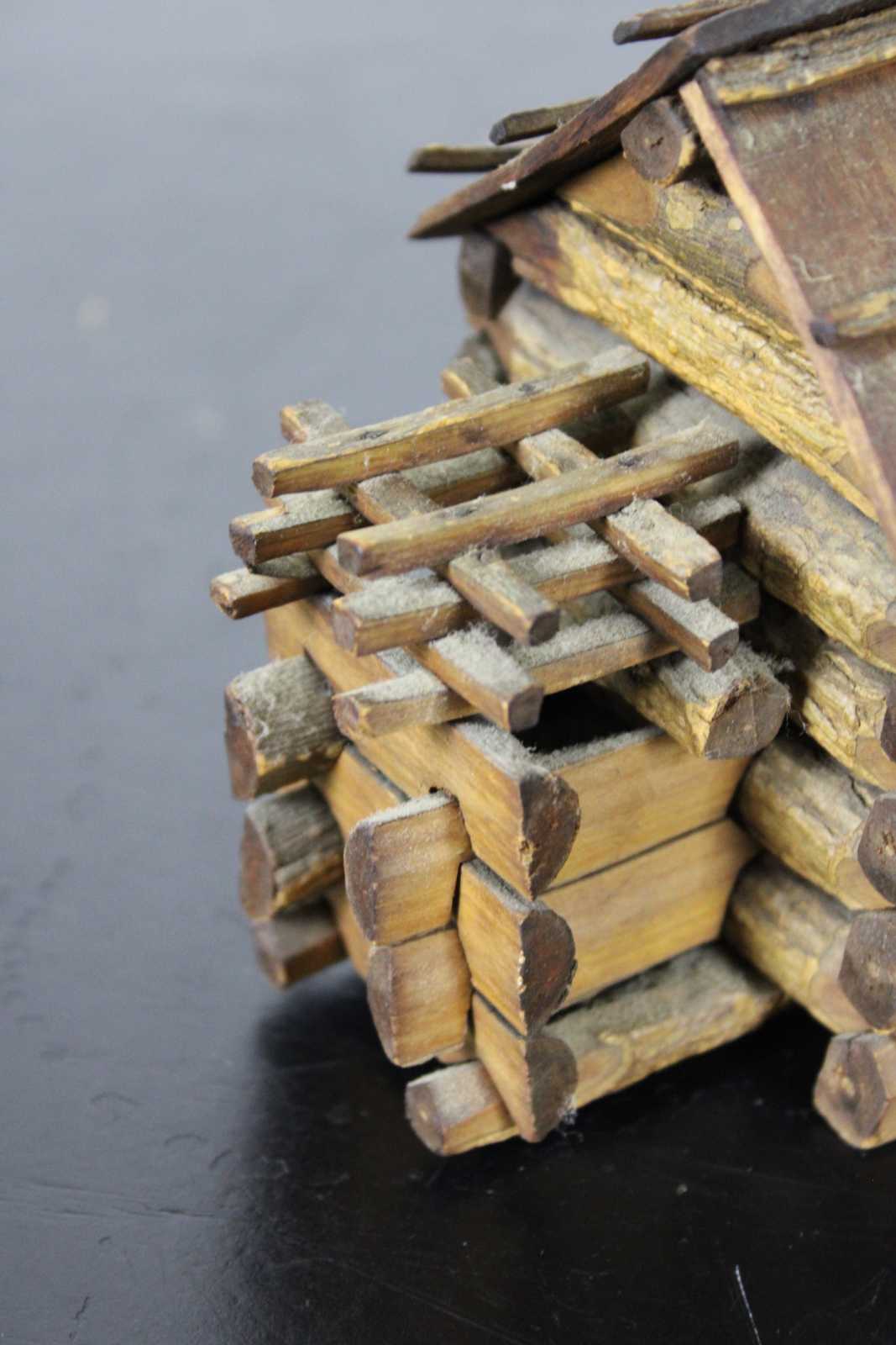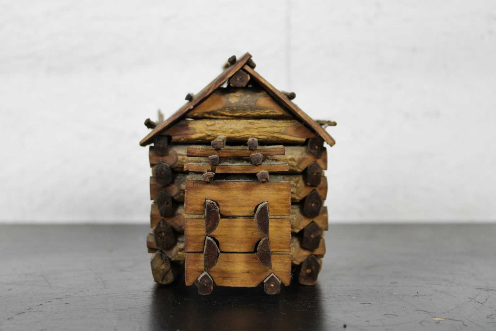 Antique handmade folk art Kentucky style miniature log cabin. This miniature log cabin model has chamfered sticks and stick built frames to window and door. A model of the home President Abraham Lincoln was born in. Circa 1950s