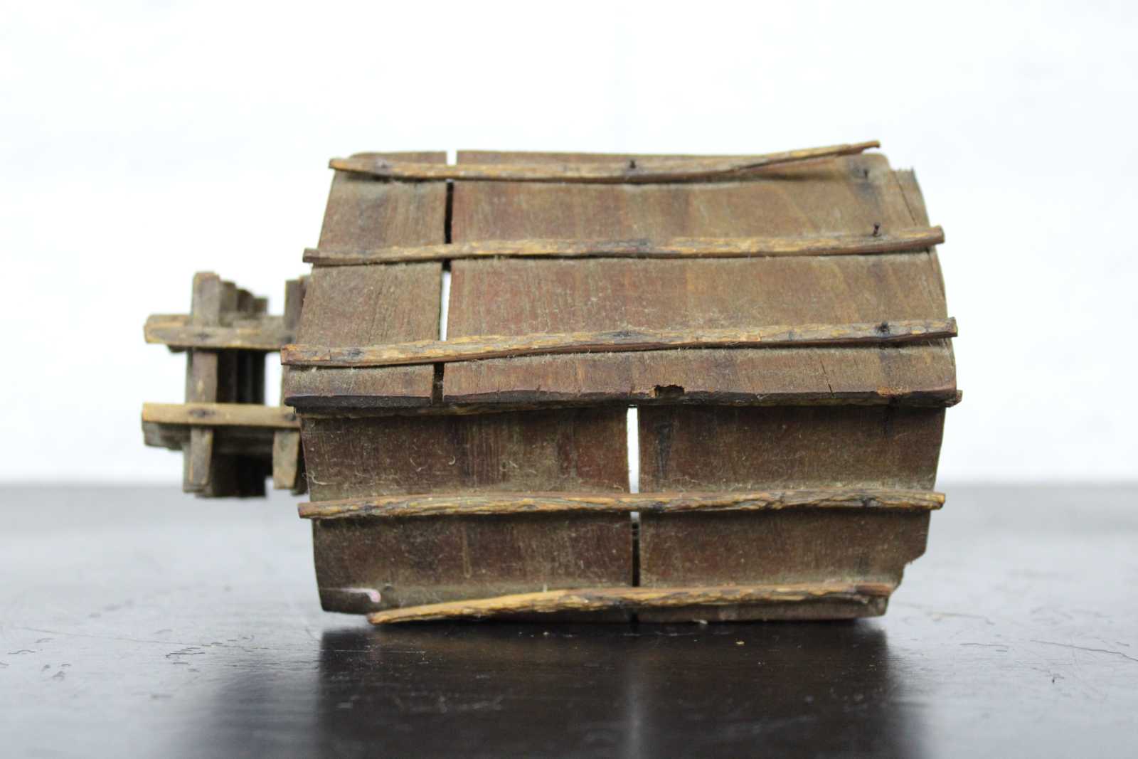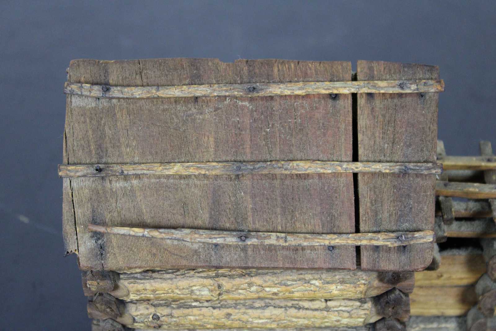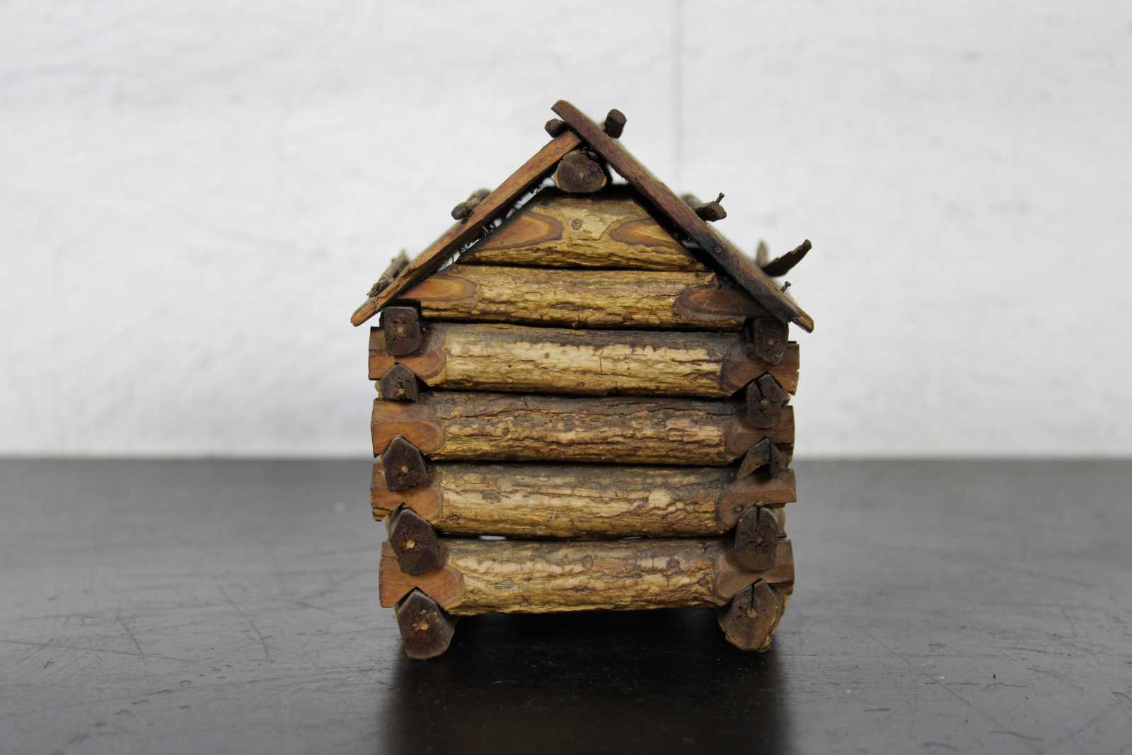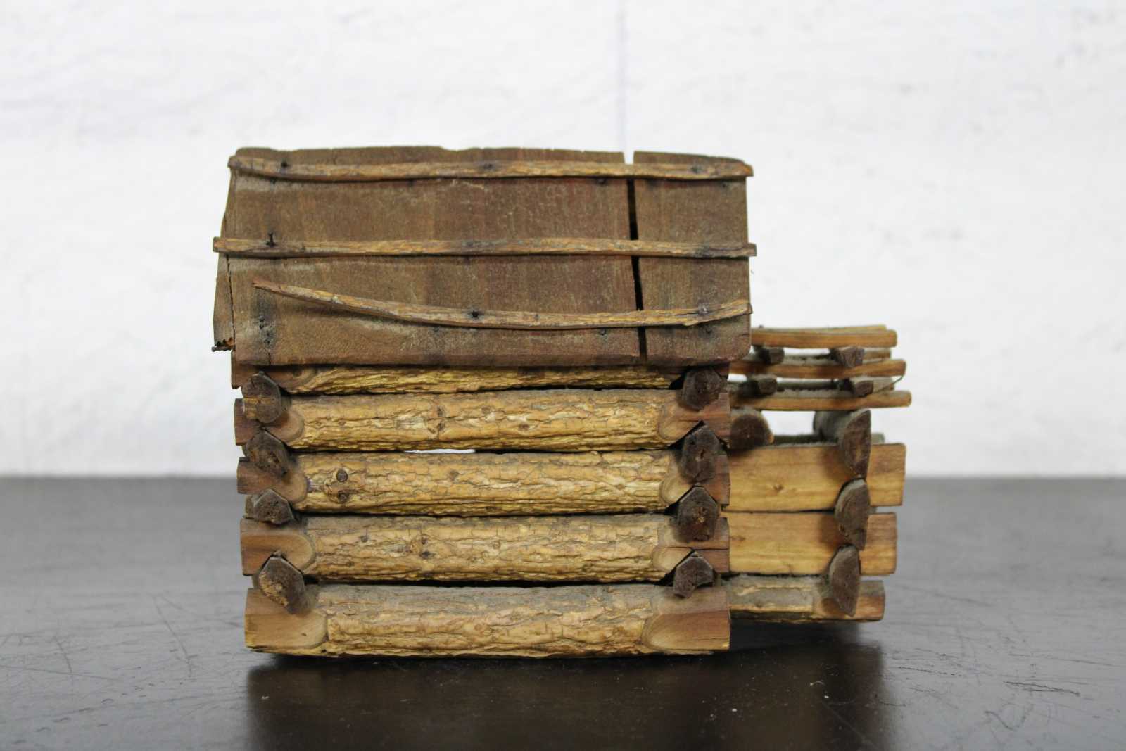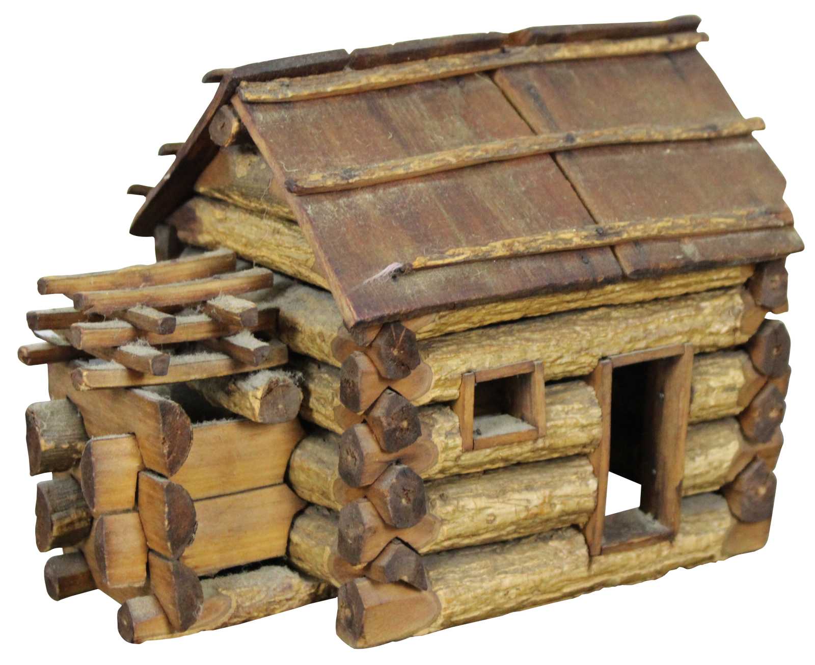 Antique handmade folk art Kentucky style miniature log cabin. This miniature log cabin model has chamfered sticks and stick built frames to window and door. A model of the home President Abraham Lincoln was born in. Circa 1950s