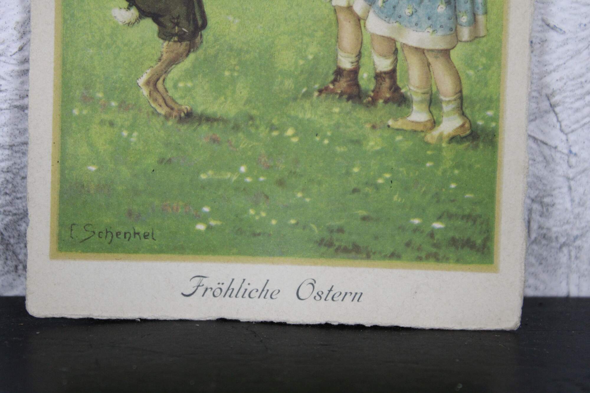 Pair of vintage and antique German postcards. One wishing a Happy Easter (Frohliche Ostern), with art designed by Franziska Shenkel that features a rabbit with a basket of Easter eggs speaking to two young girls; and Happy Birthday Wishes (Herzliche Geburtstagswunsche), featuring a girl in a dress with her lamb and goose.