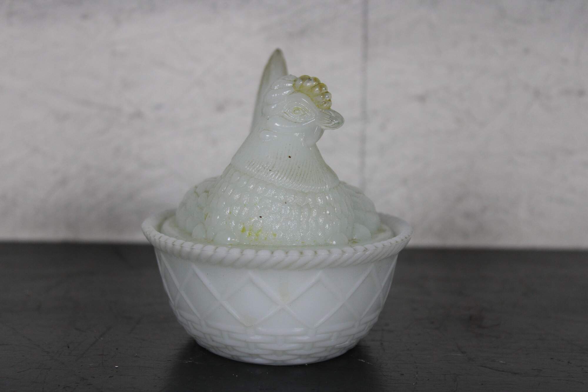 Antique milk glass candy dish in the shape of a chicken nesting in a basket.