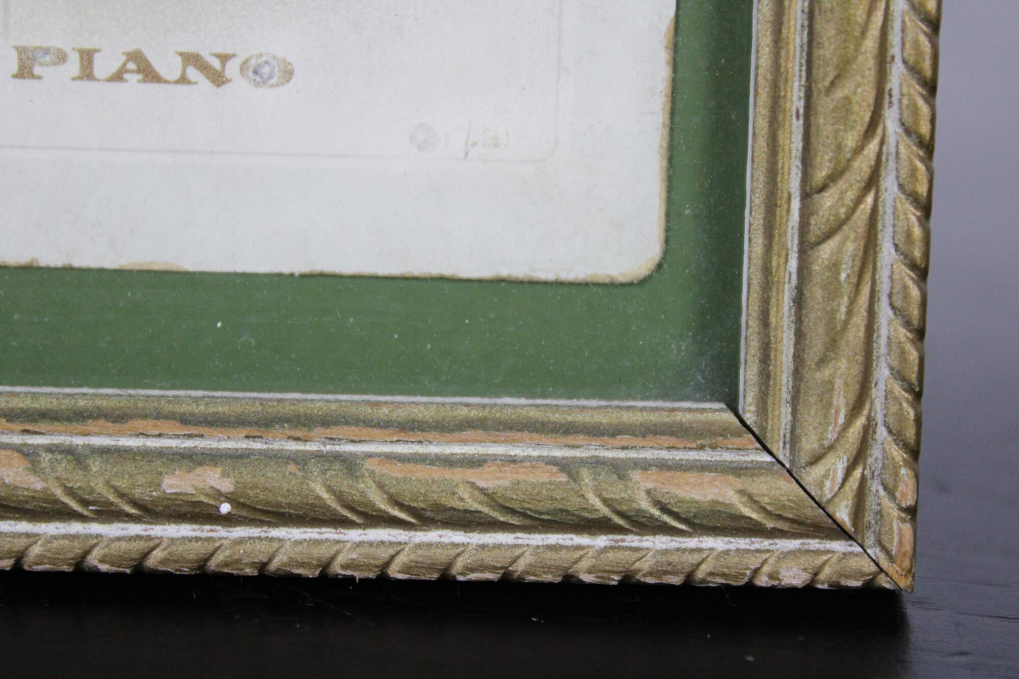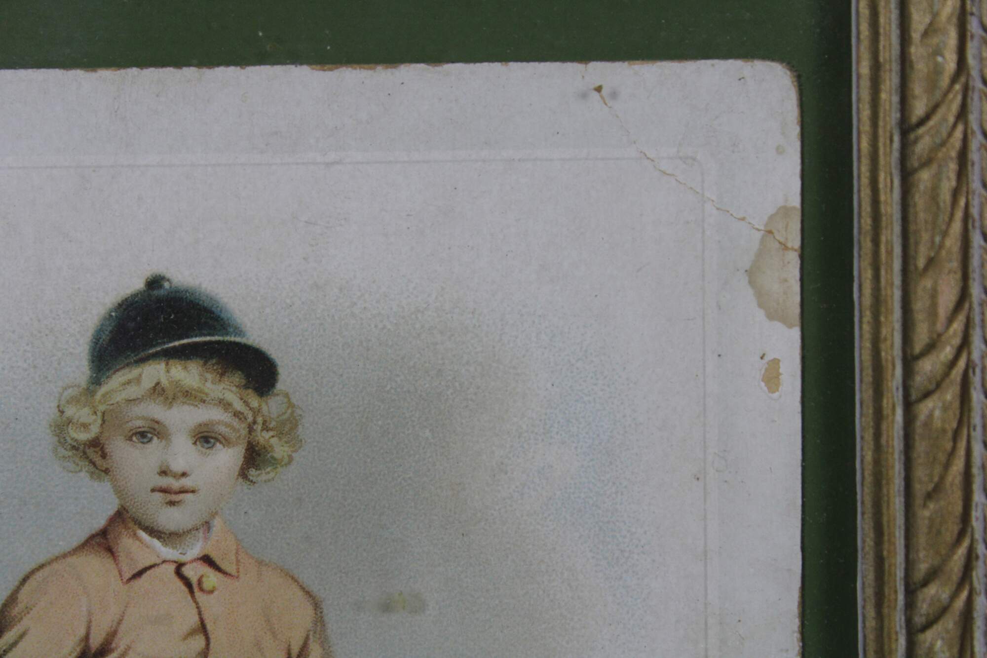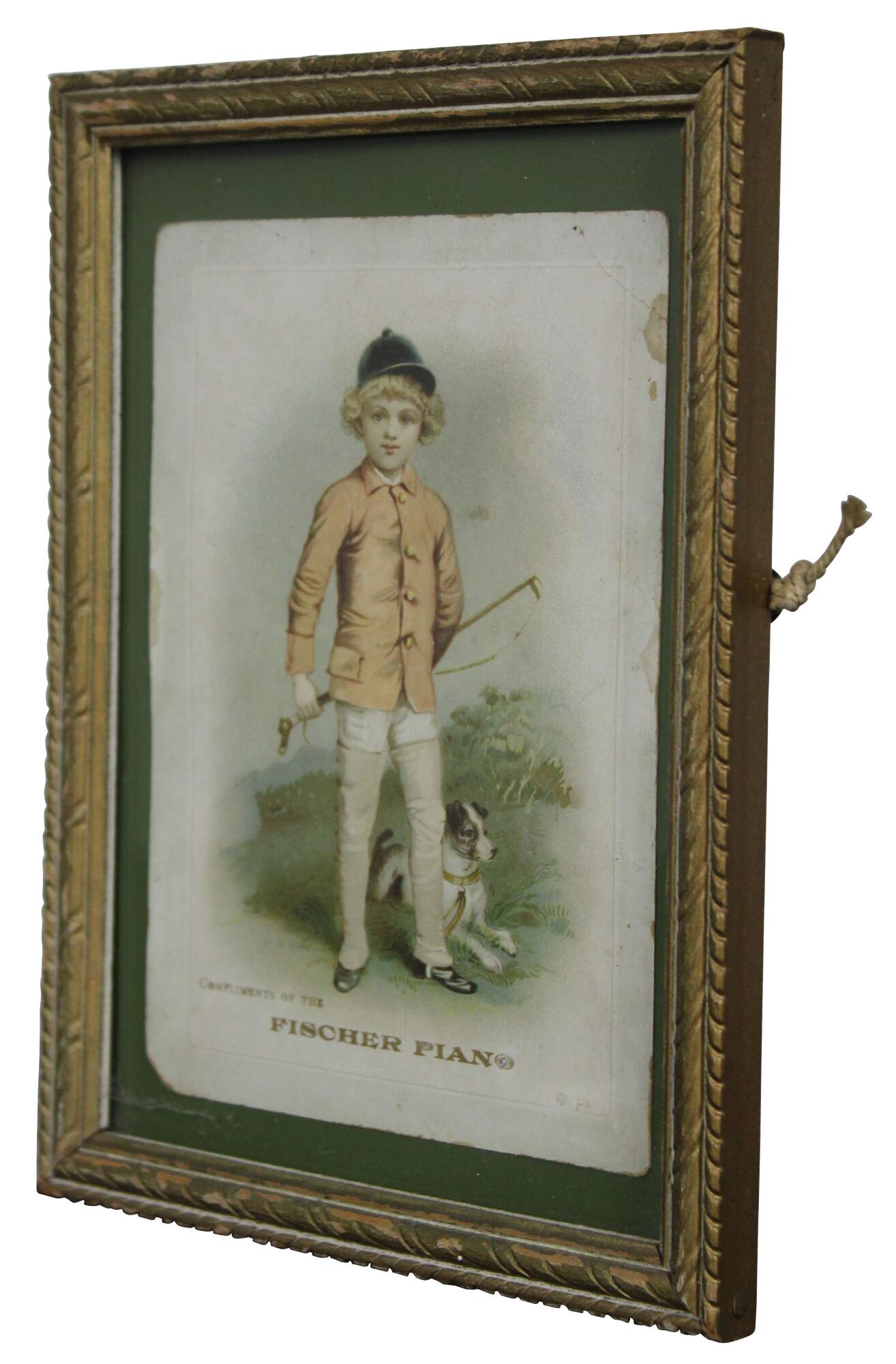 Antique Victorian advertising trade card showing a lithograph portrait of a boy and his dog in fox hunting attire with the legend “Compliments of the Fischer Piano.”