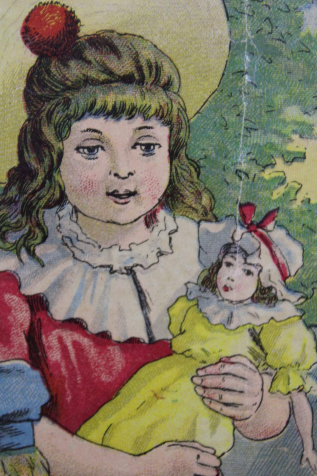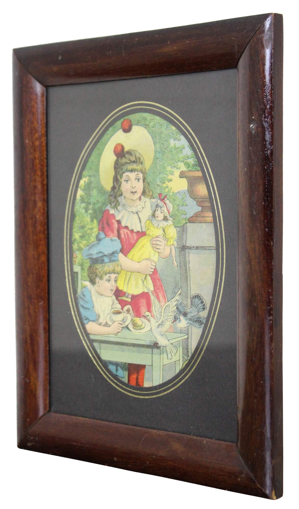 Antique brightly colored Victorian lithograph print showing two children having tea in a garden with hungry birds.