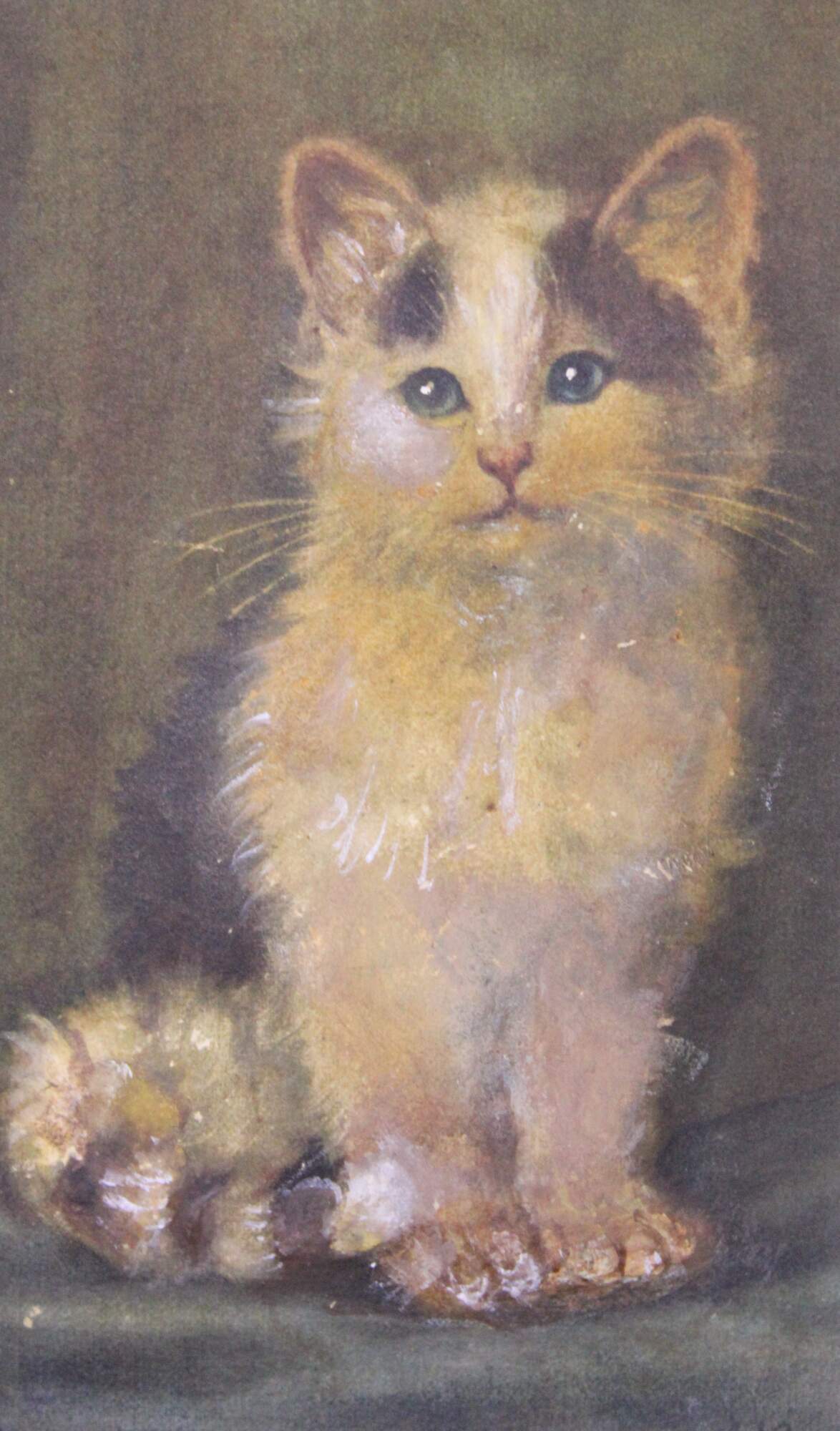 Small antique 19th century watercolor painting of a fluffy kitten, molded over a raised surface to be slightly 3-dimensional.