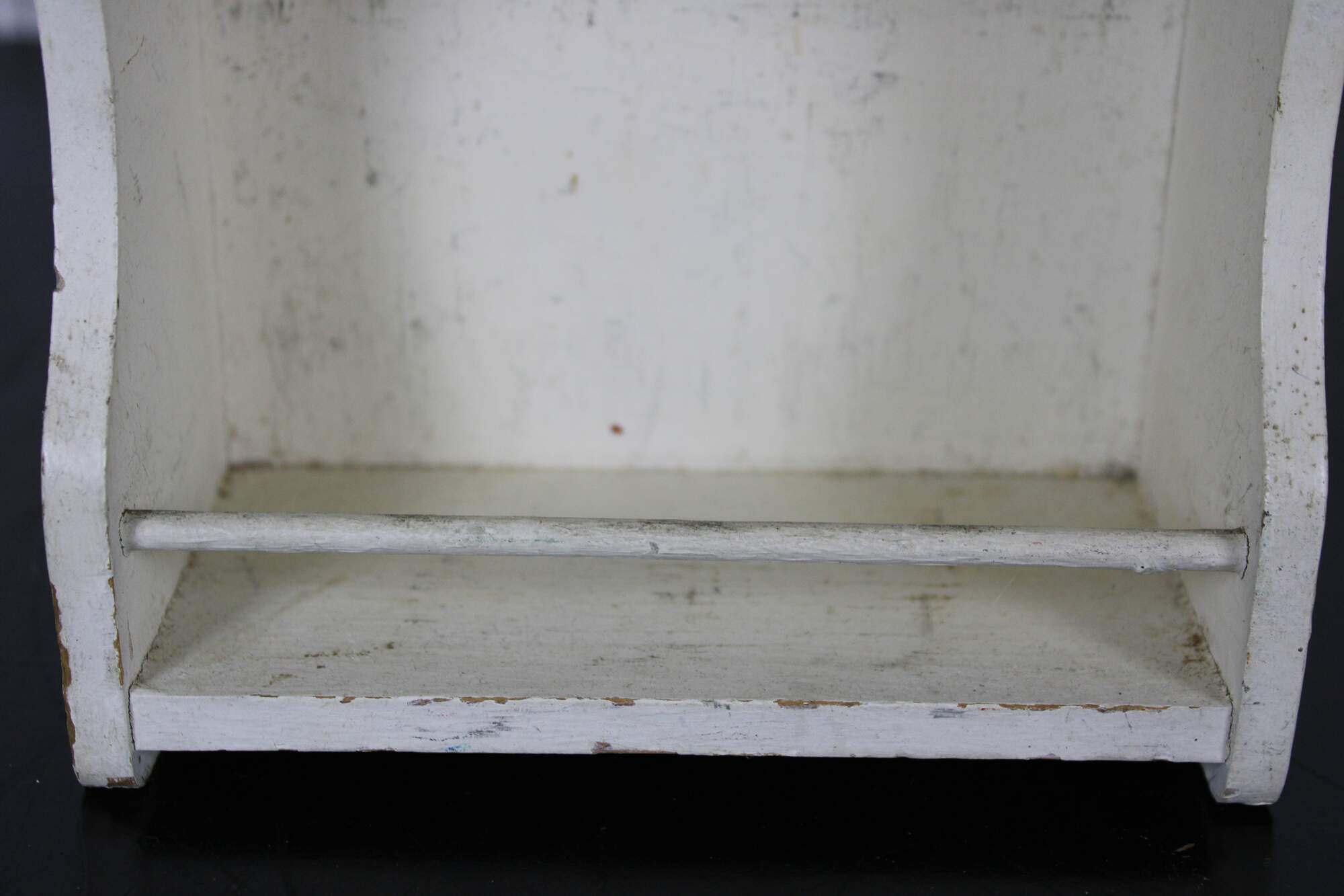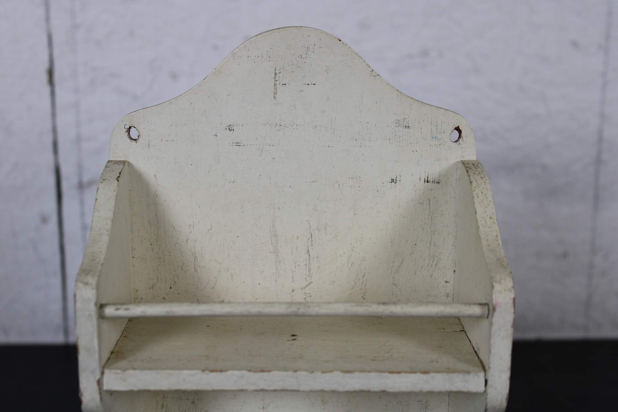 Small distressed antique two tier wall hanging shelf, painted white.