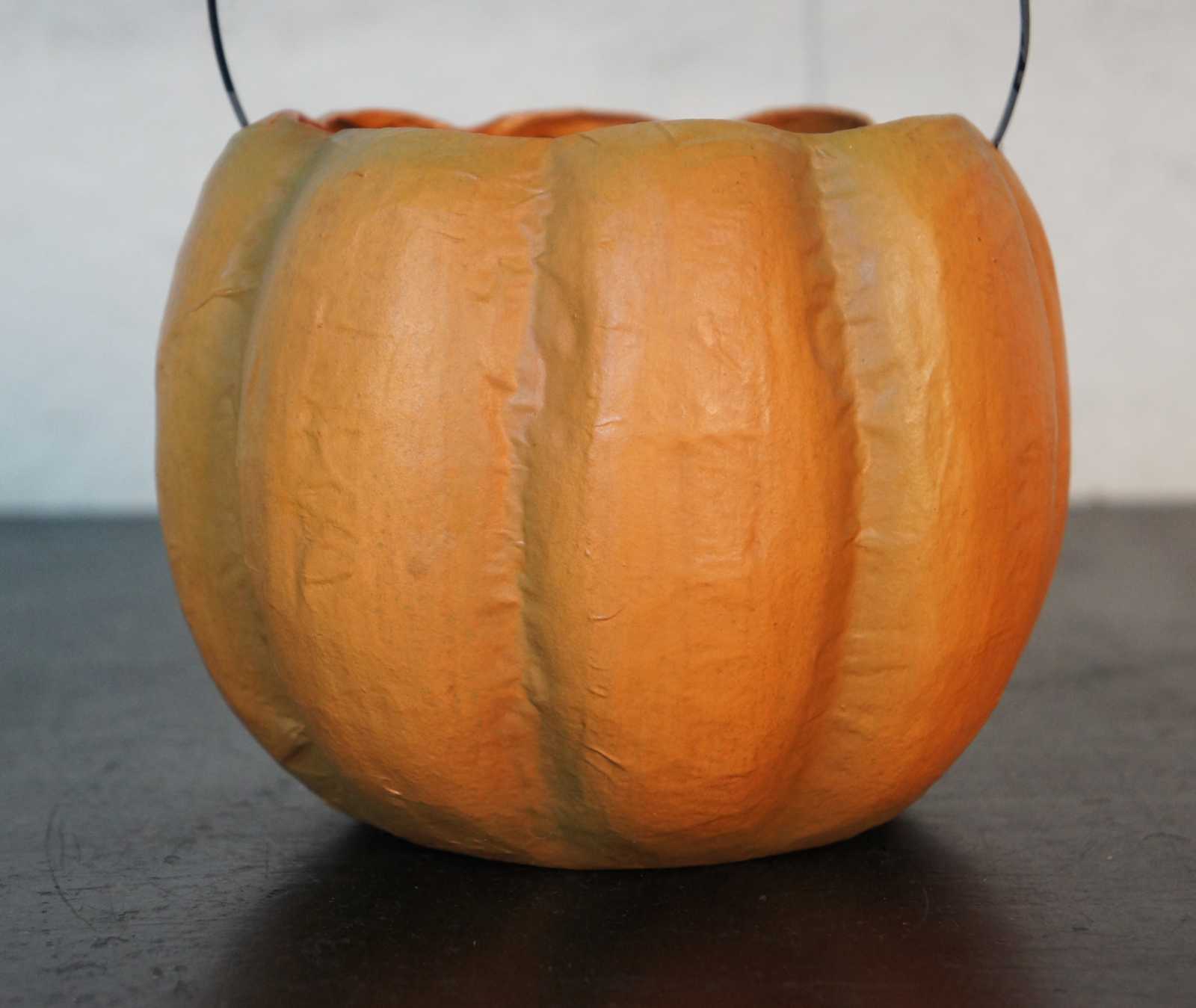 Antique paper mache jack-o-lantern shaped candy bucket with paper backed, cut out face and wire handle.