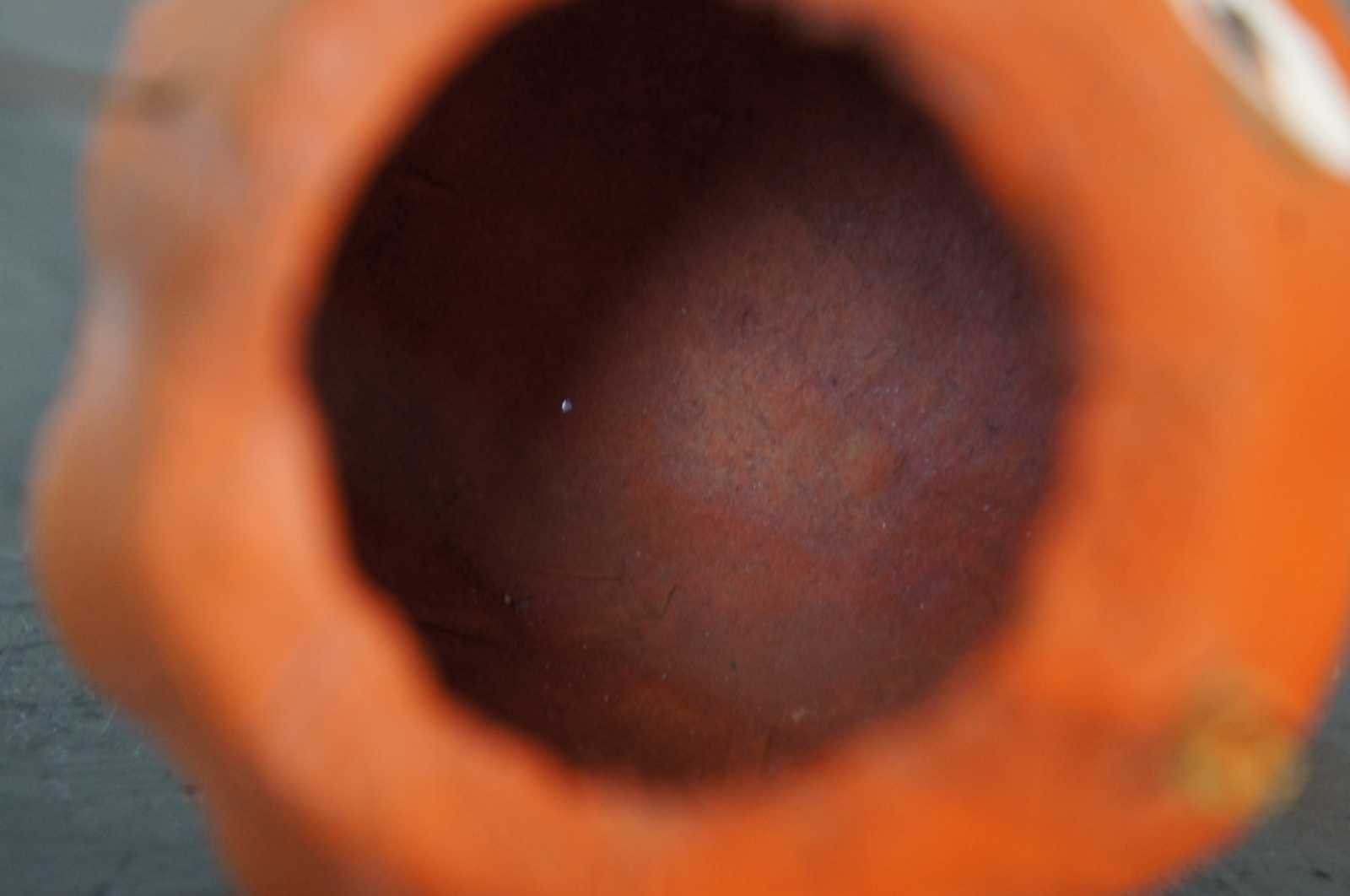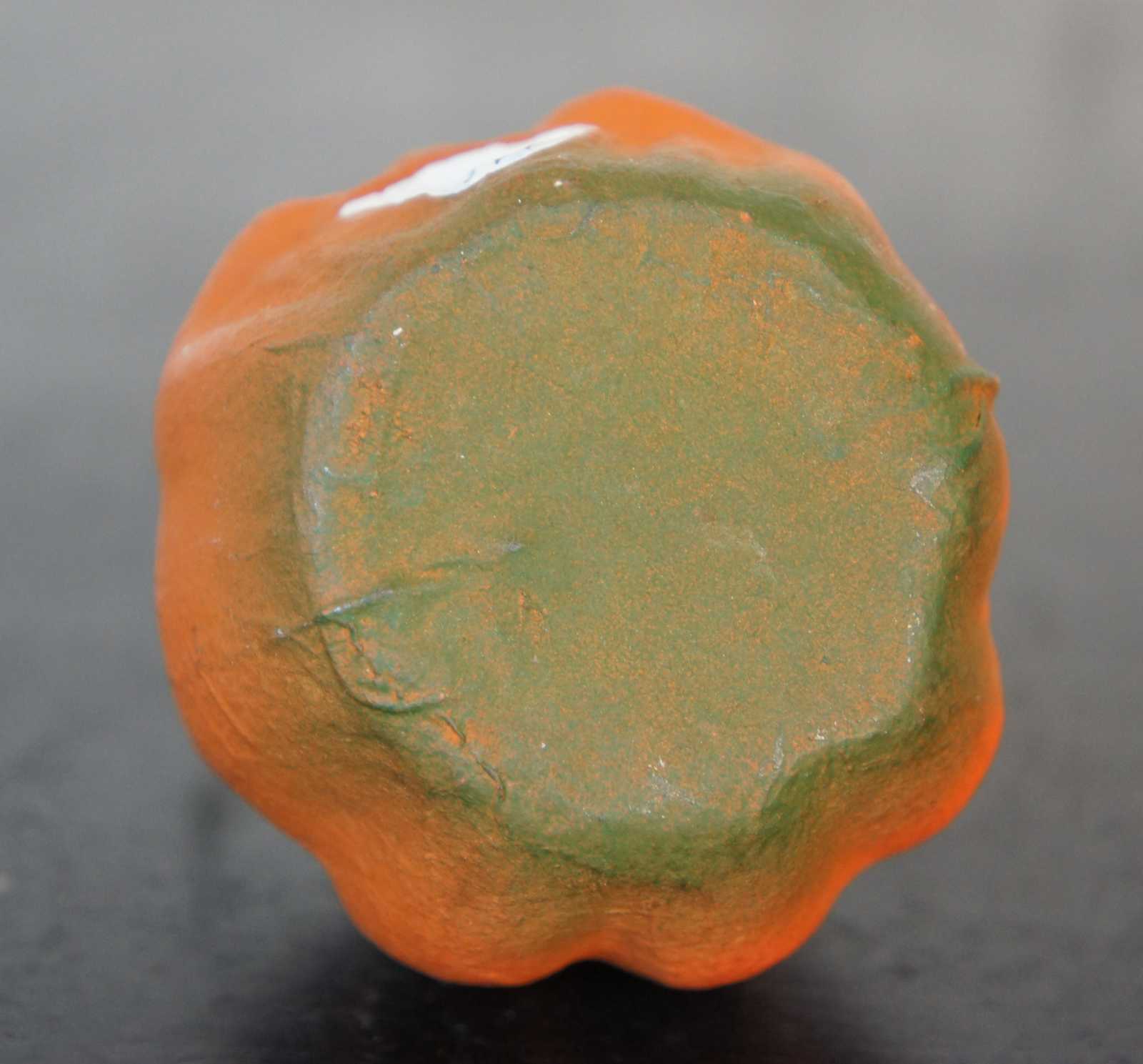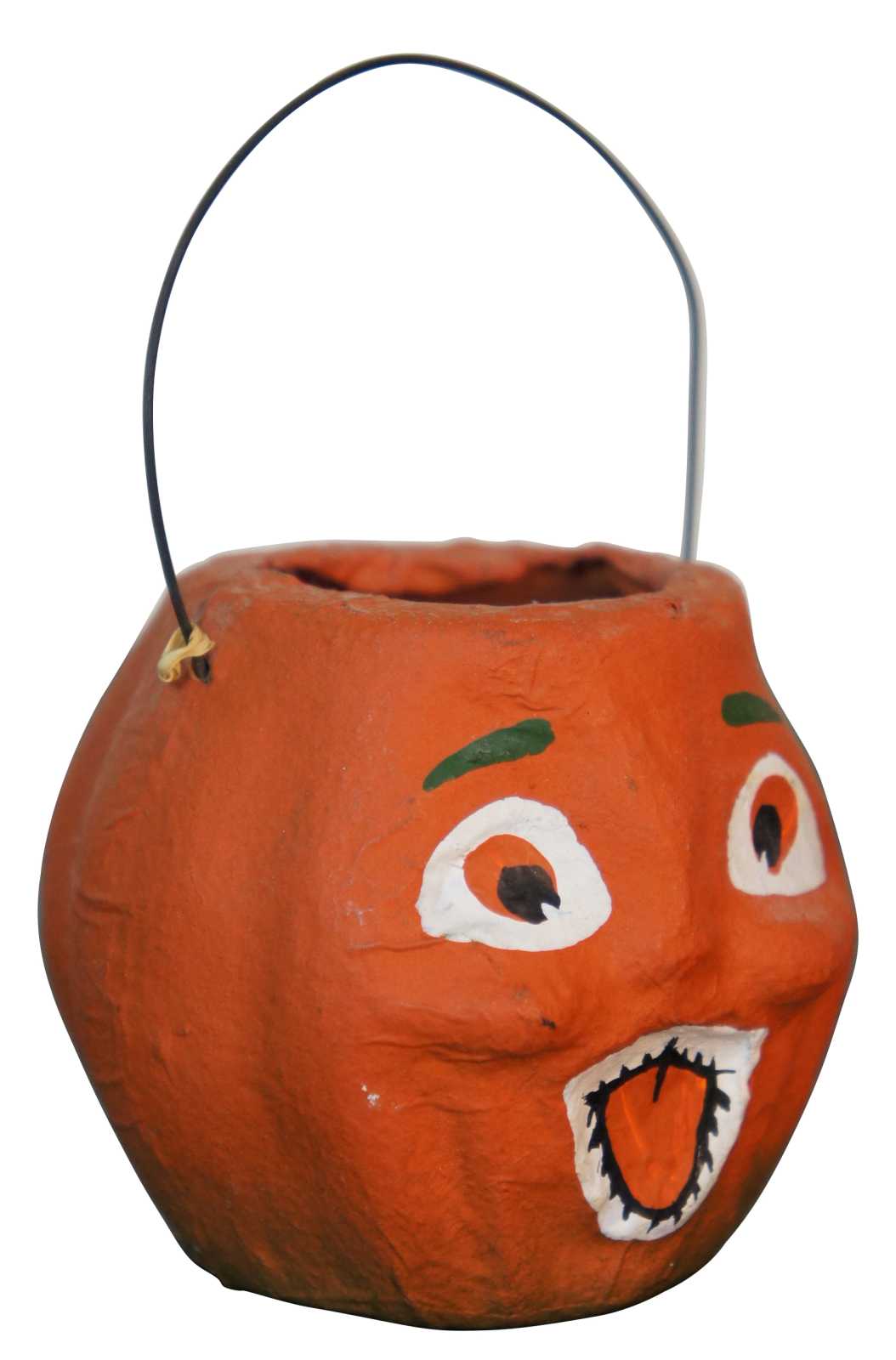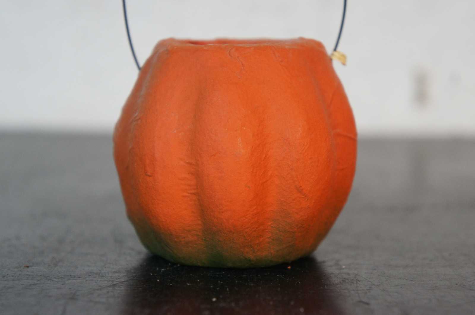 Antique paper mache miniature jack-o-lantern shaped candy bucket with painted face and wire handle.