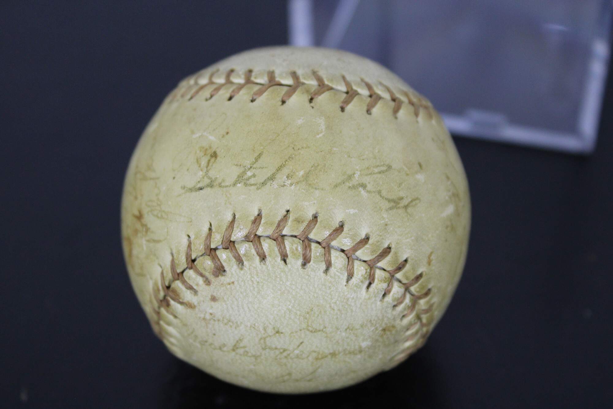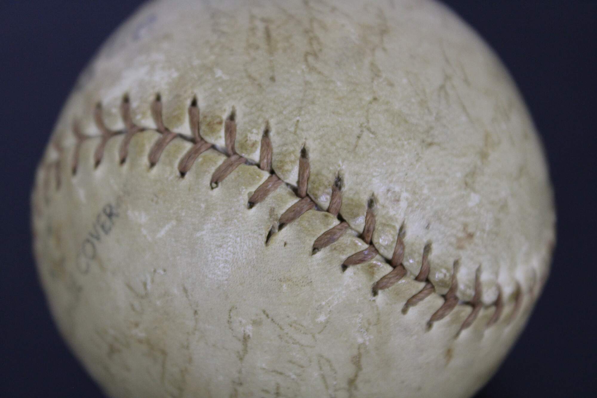 Vintage Special League S48W horsehide baseball signed by members of the 1949 Cleveland Indians baseball team. Ball includes approximately 26 signatures (some are extremely faded). Identifyable names include: Satchel Paige, Mickey Vernon, Jim Hegan, Frank Papish, Joe Gordon, Coach Mel Harder, Ken Keltner, Dale Mitchell, Ray Boone, Hal Peck, Bobby Avila, Bob Feller, and Johnny Bearding.