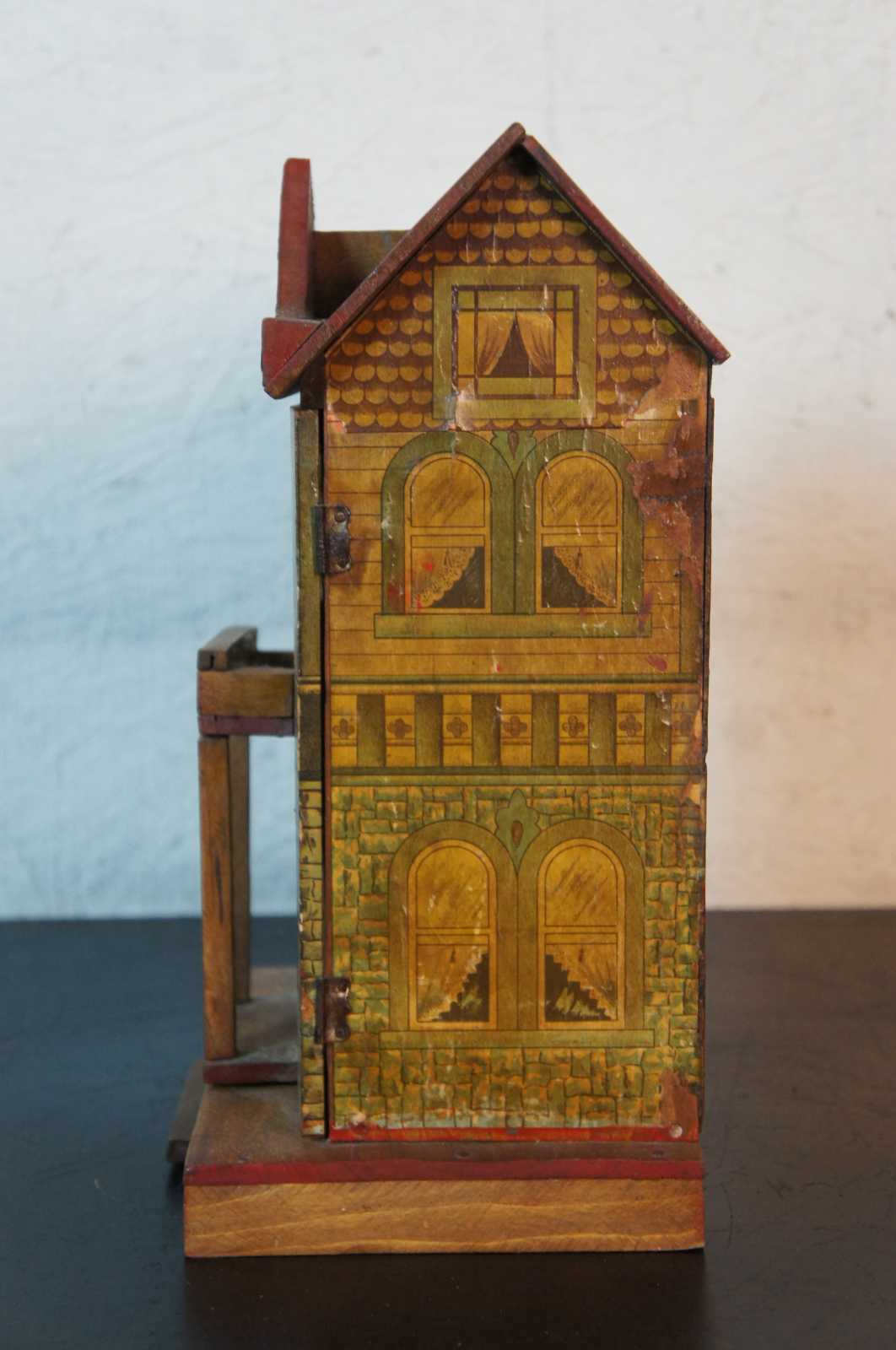 Antique two story doll house with lithograph decoration by the Rufus Bliss Manufacturing Company. Even through Rufus Bliss founded R. Bliss Manufacturing Company in 1832, it is not exactly known when they started producing toys. The earliest mention of toys can be found in the “New England Business Director of 1871.”