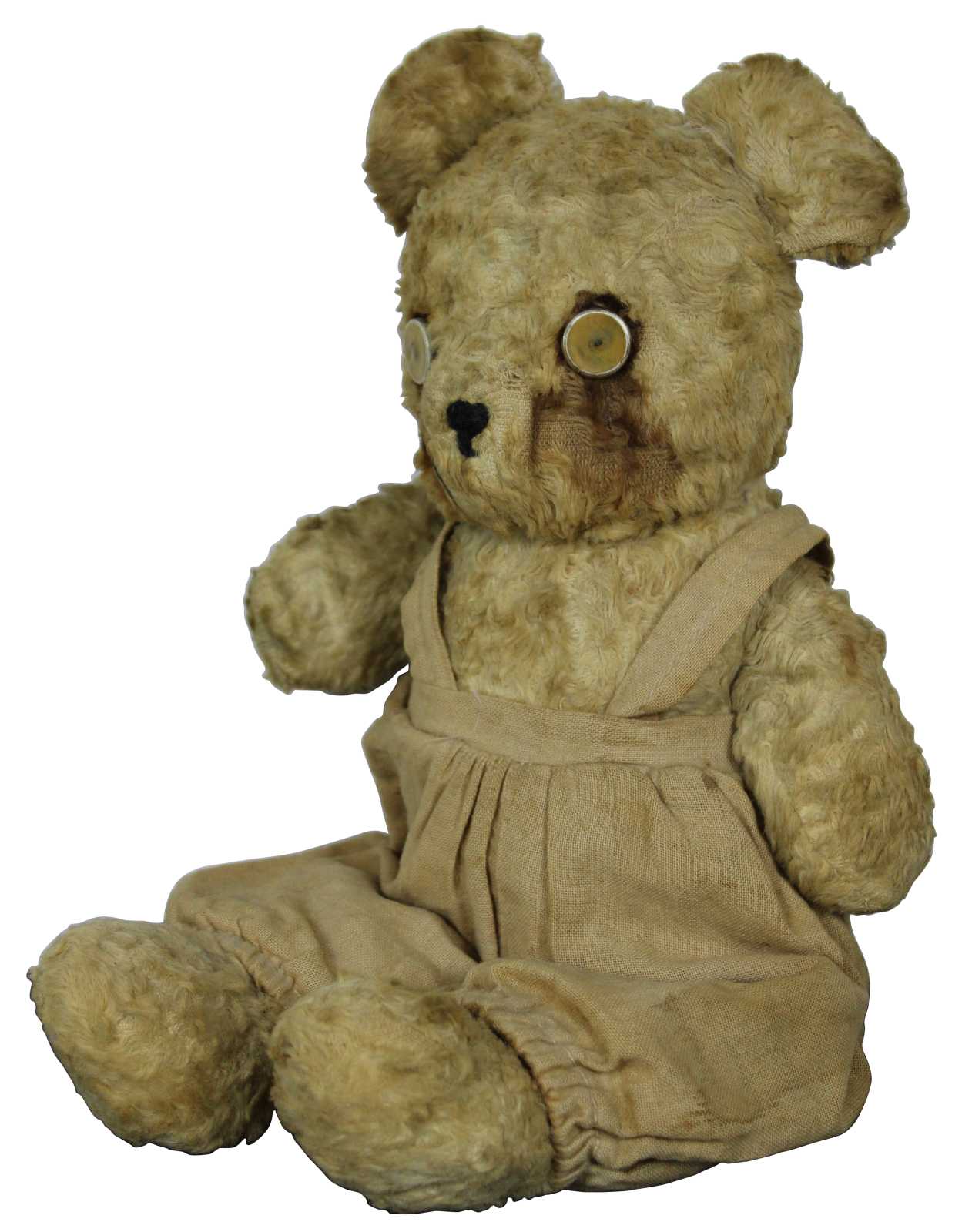 Good Overall - Wear/discoloration to fur throughout; light stains to bear/overalls.