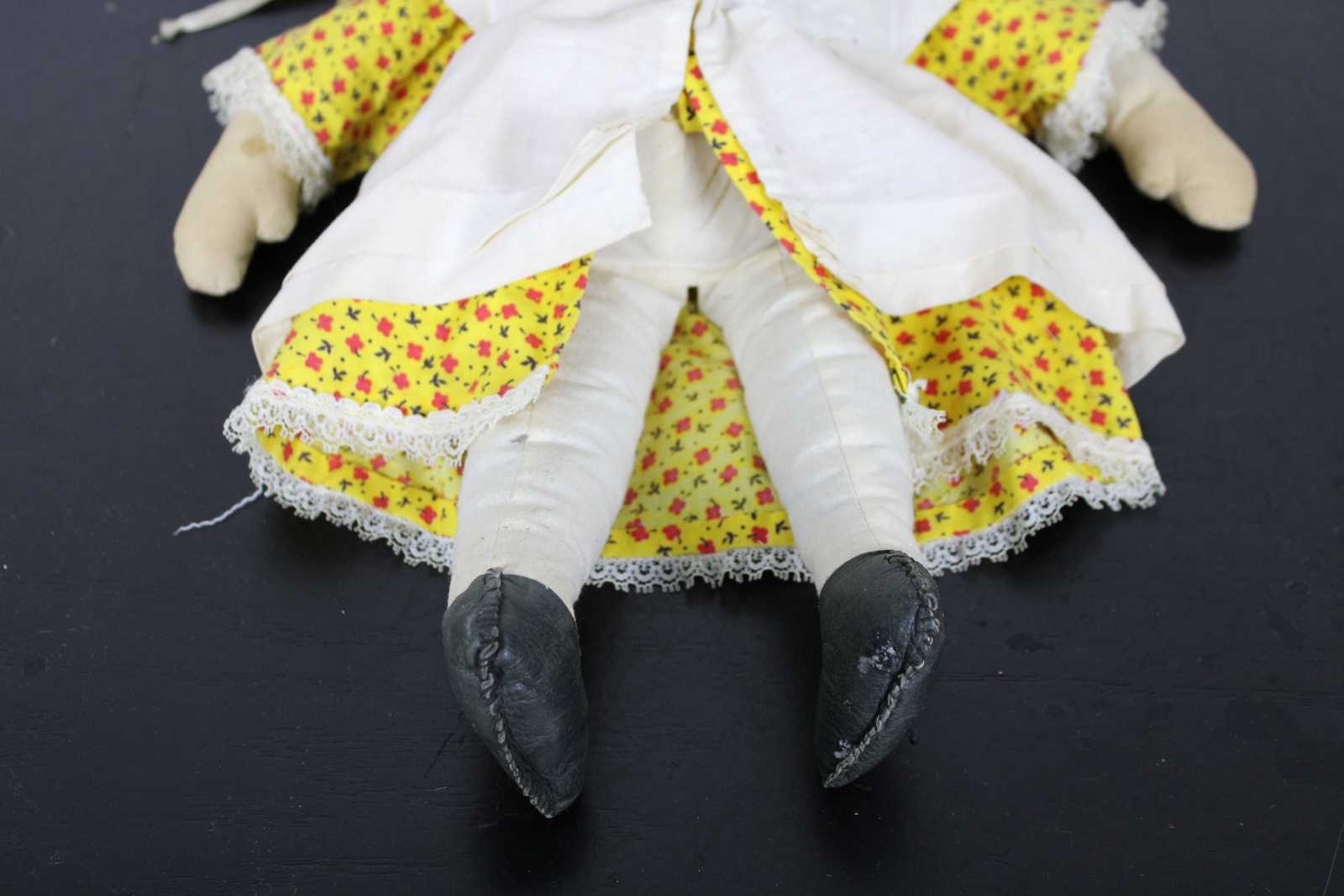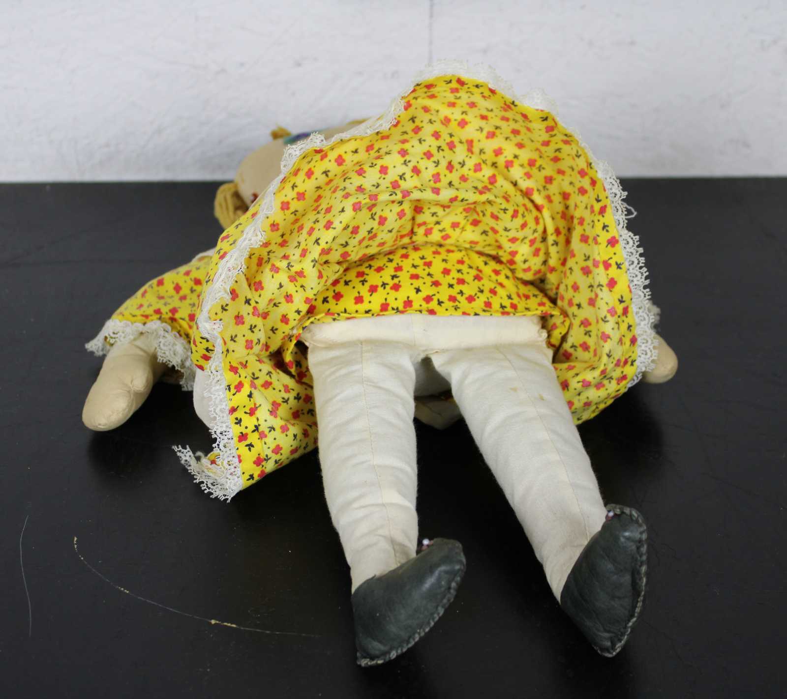 Vintage handmade cloth doll with golden yarn hair and embroidered facial features.