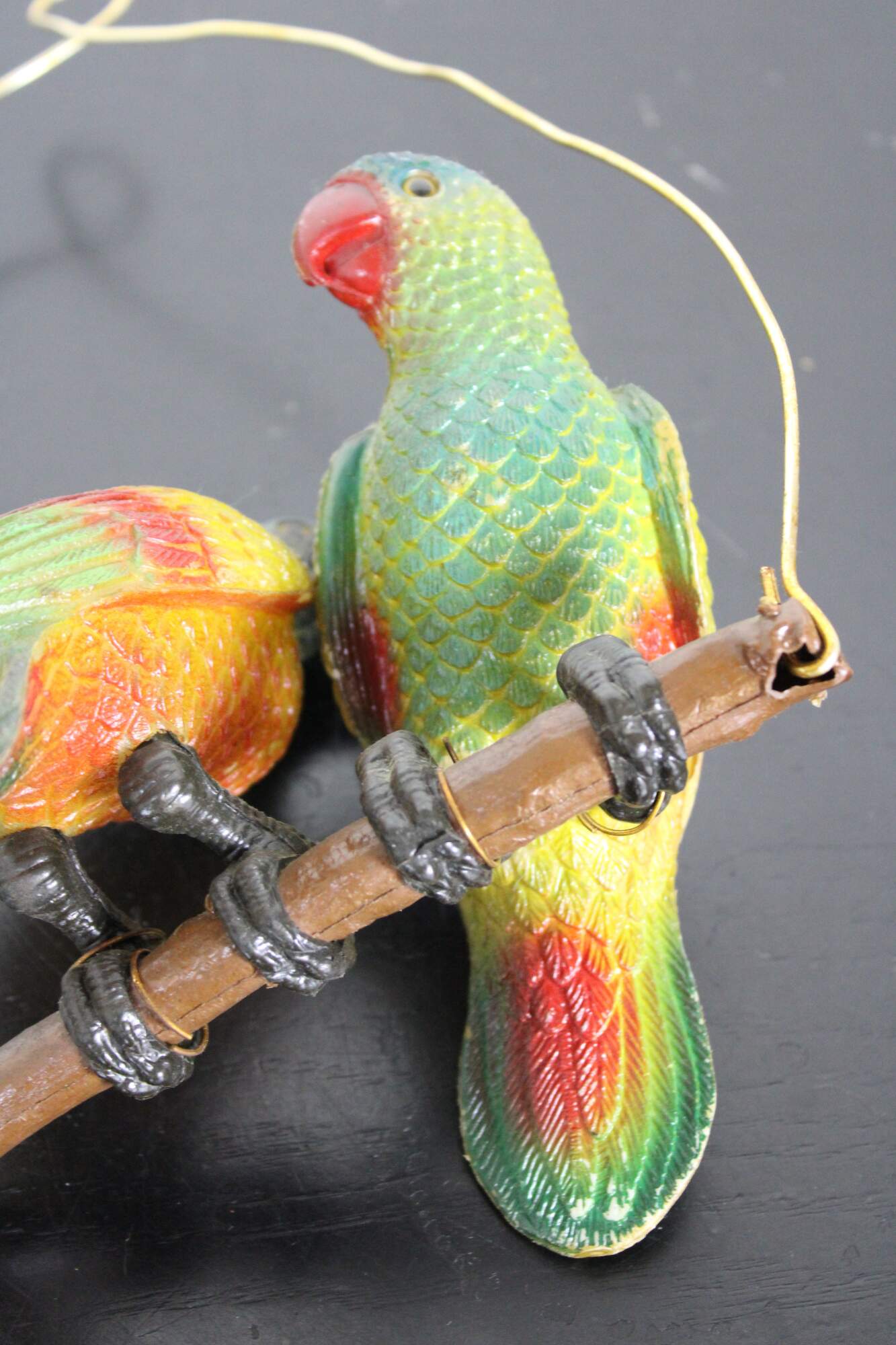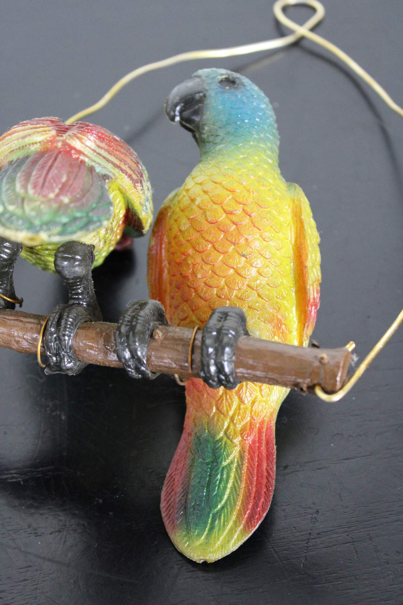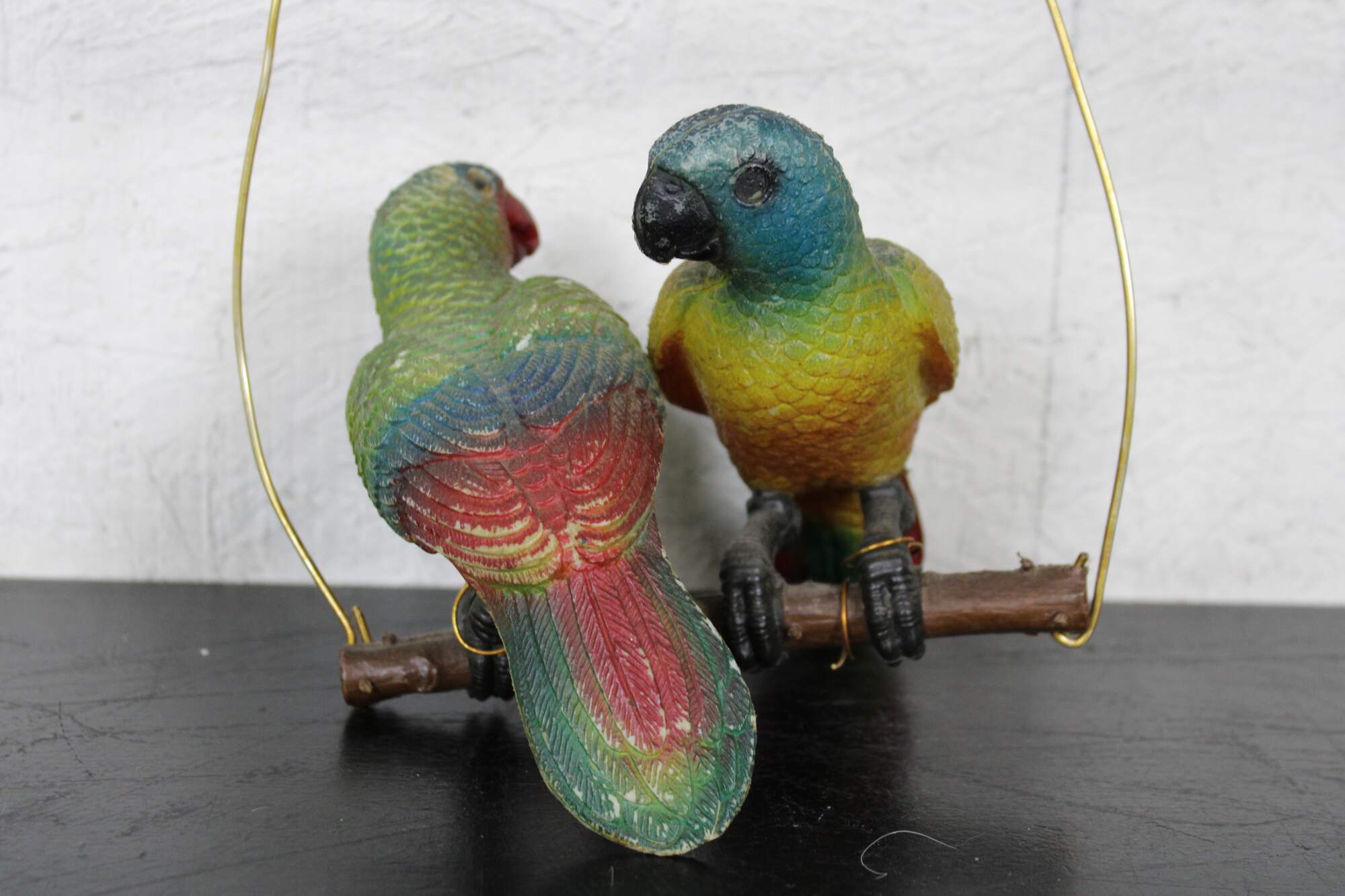 Vintage mid century pair of painted plastic parrots perched on a wood and brass wire hanging perch.