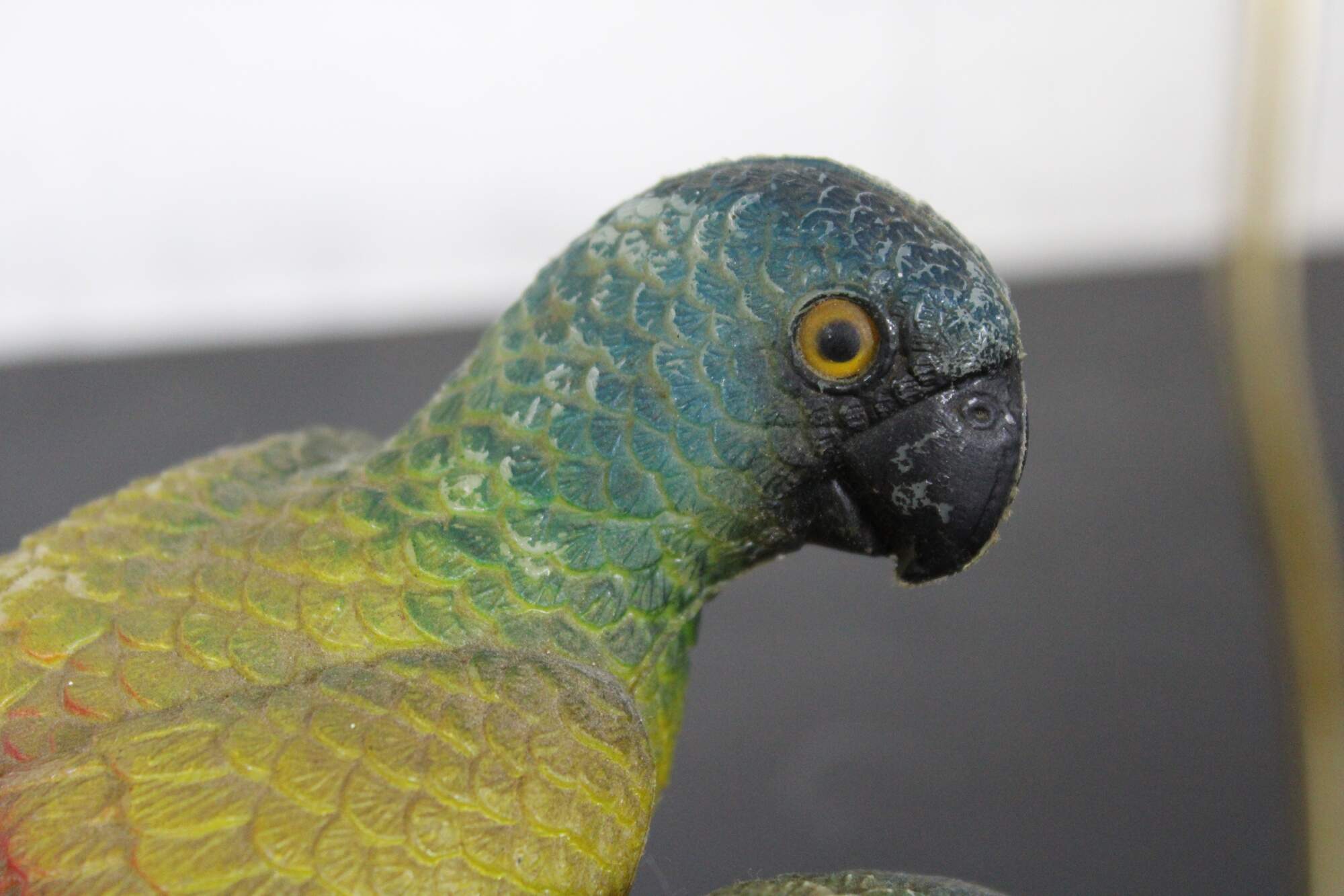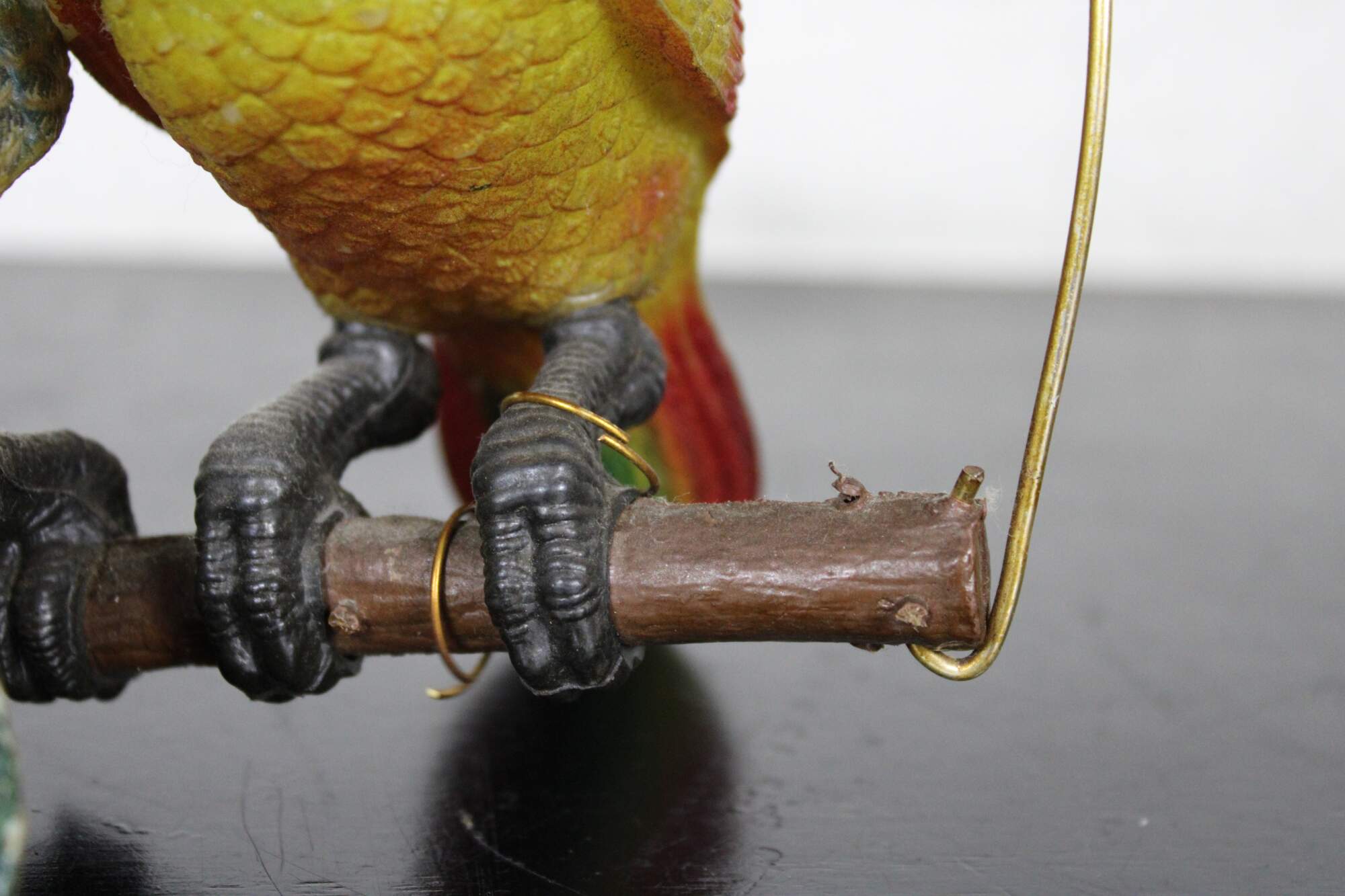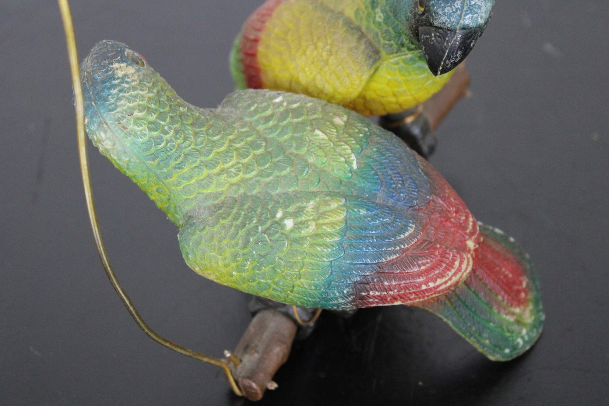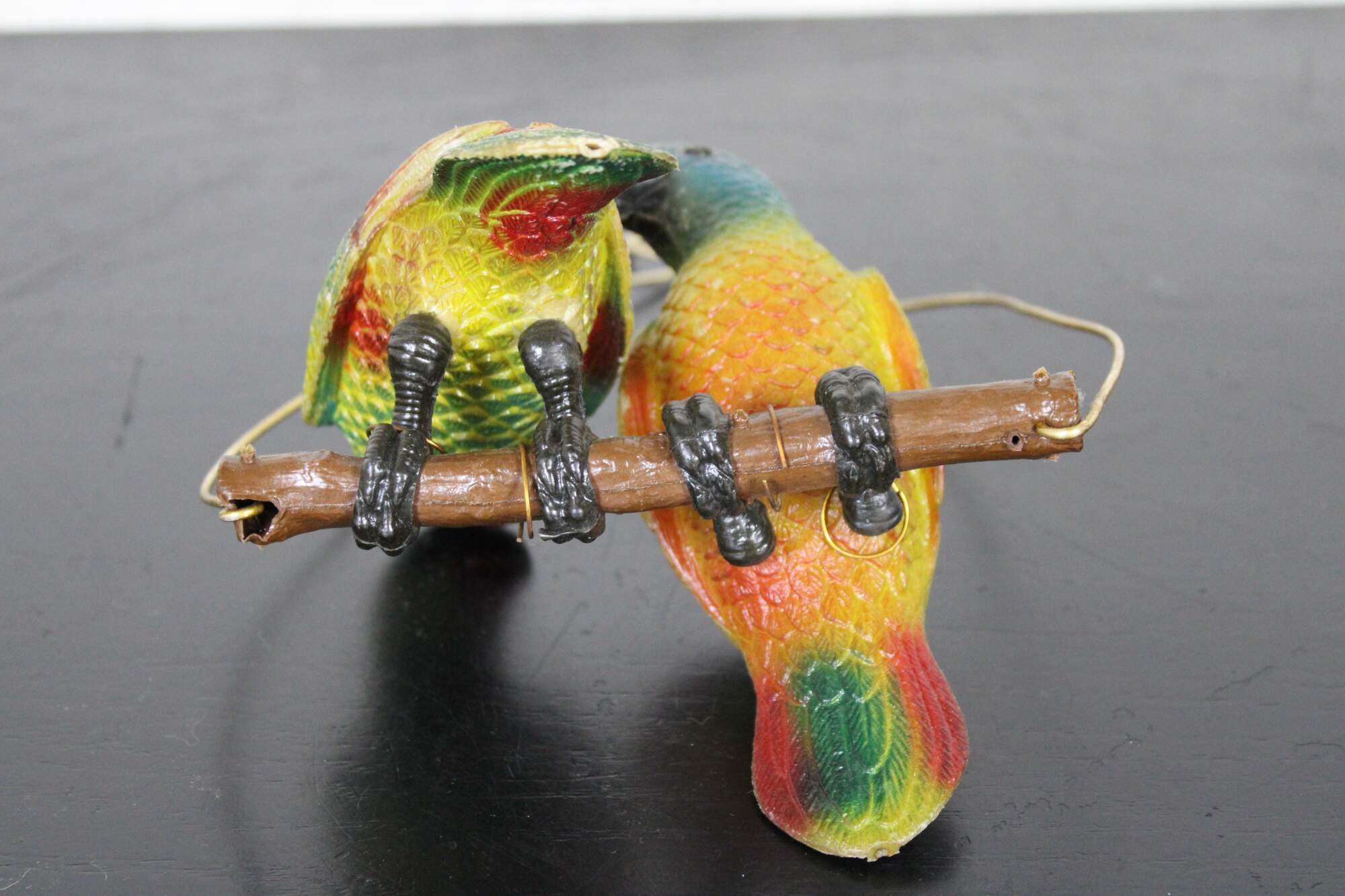 Vintage mid century pair of painted plastic parrots perched on a wood and brass wire hanging perch.