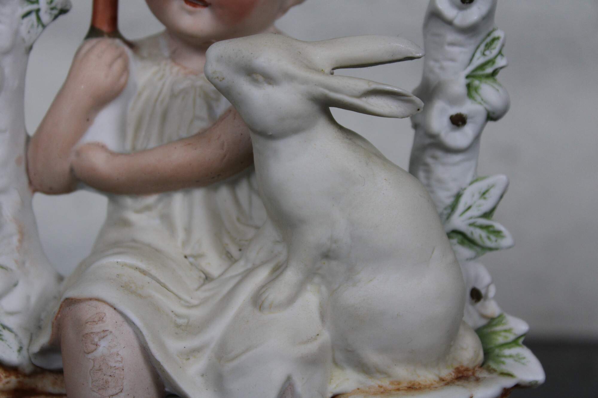 Antique German bisque spill vase in the shape of a child seated under a fence with a rabbit. Attributed to Goer, Made in Germany.