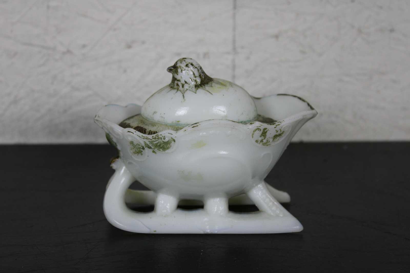 Circa 1905 antique Westmoreland Specialty Company milk glass sleigh shaped candy dish with egg and chick lid.