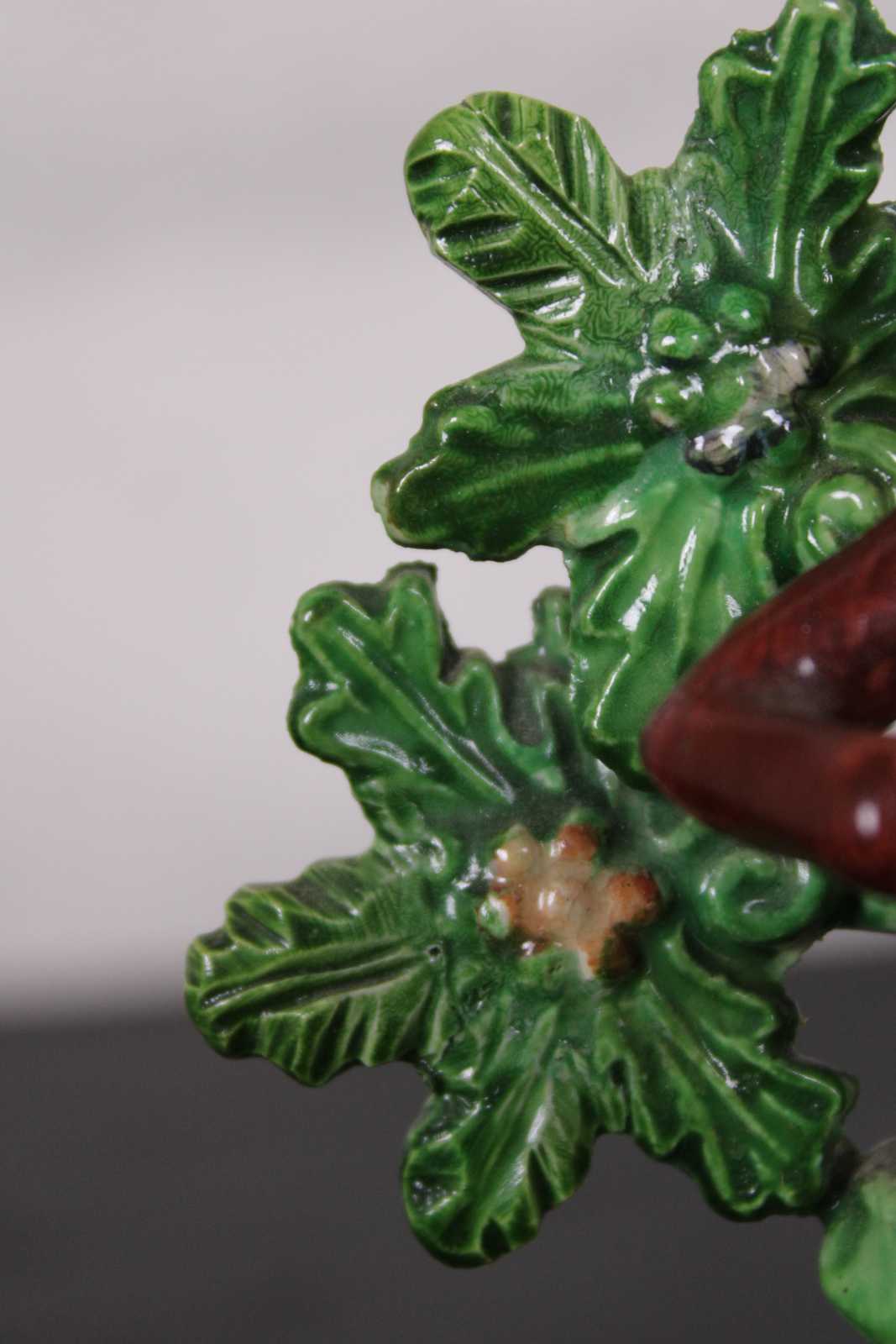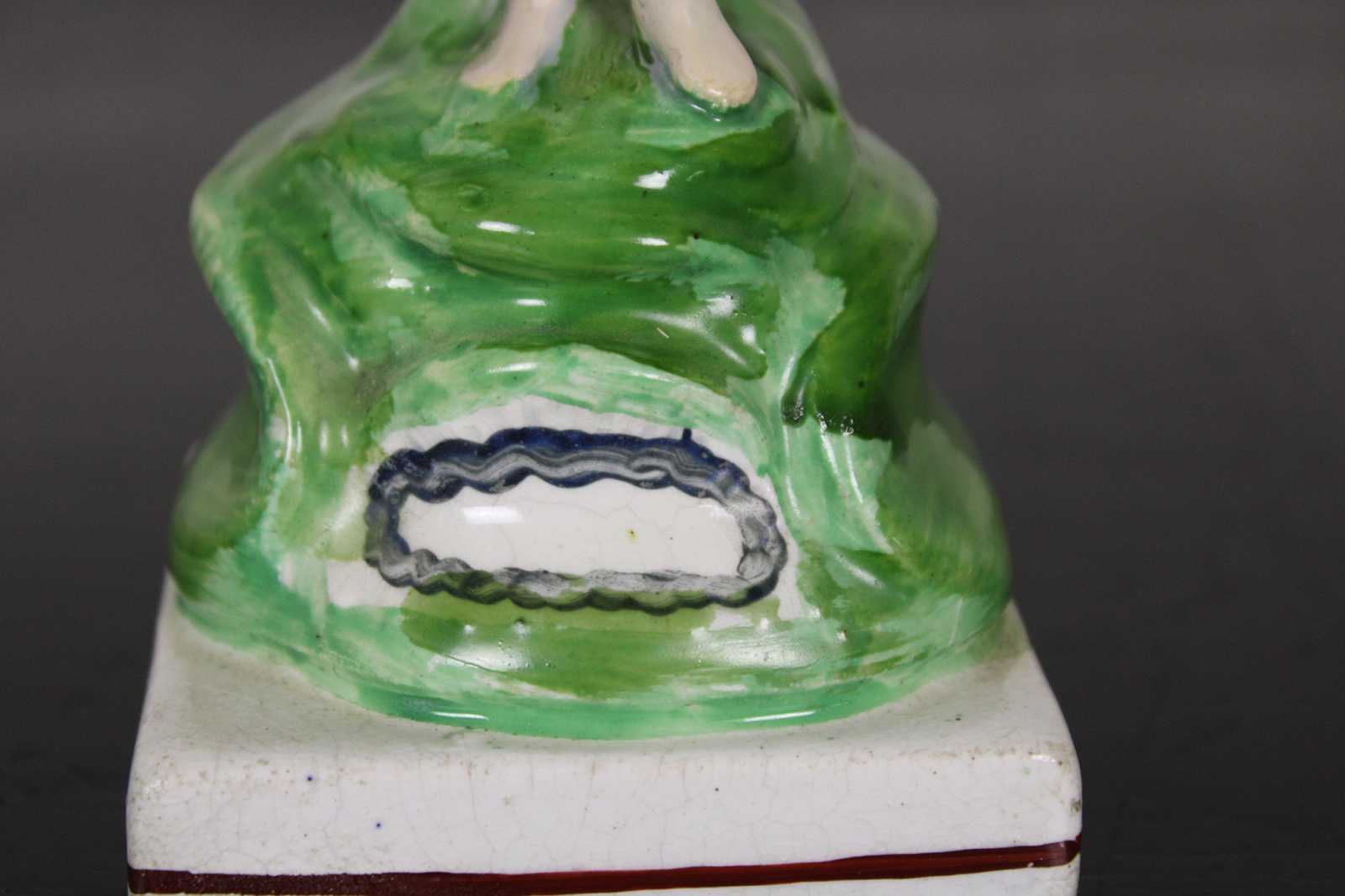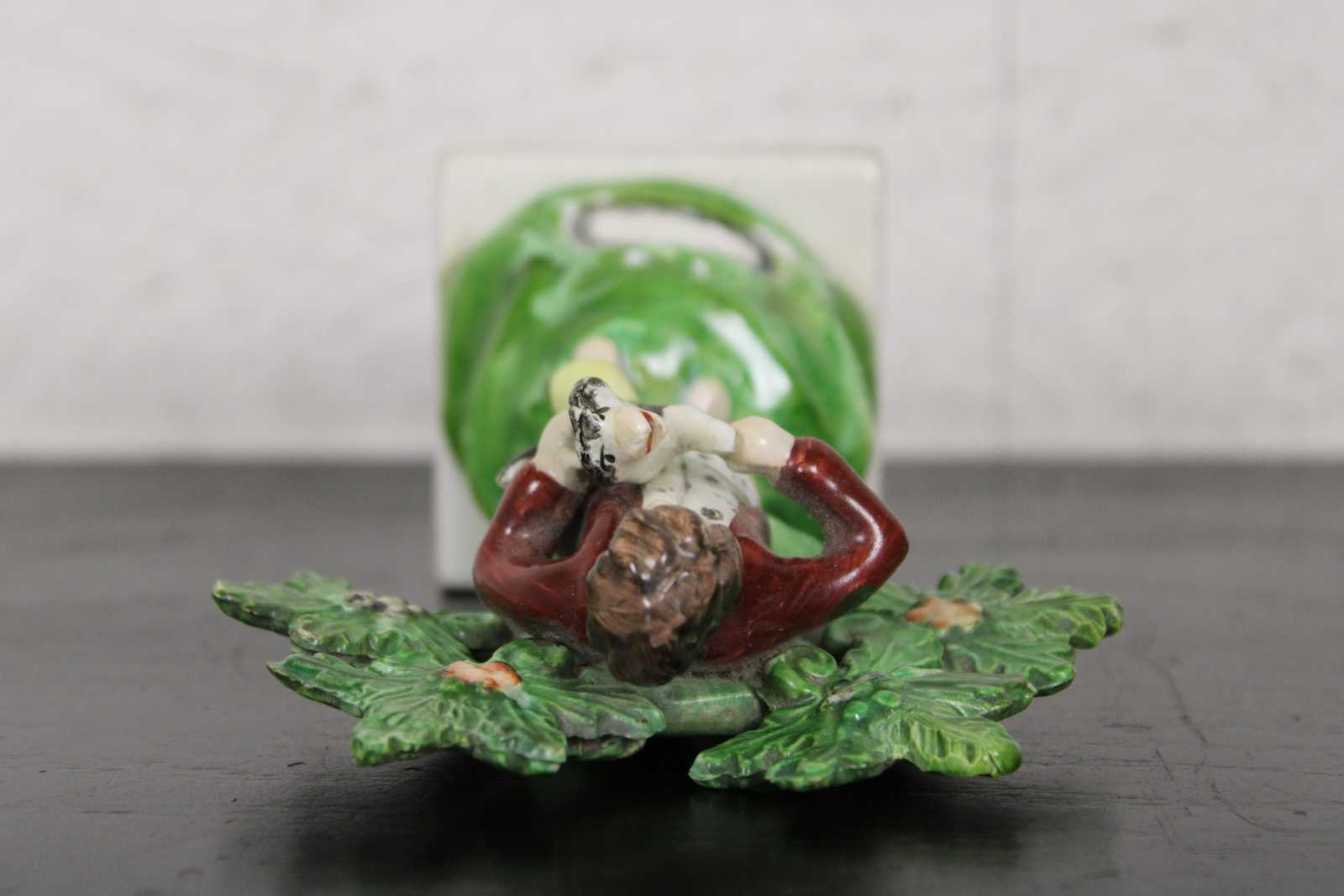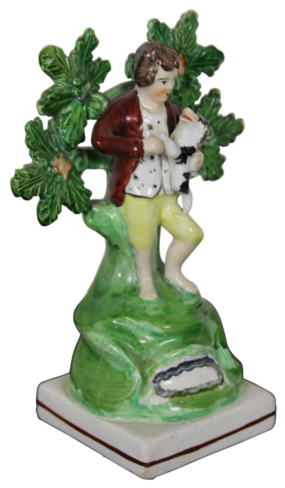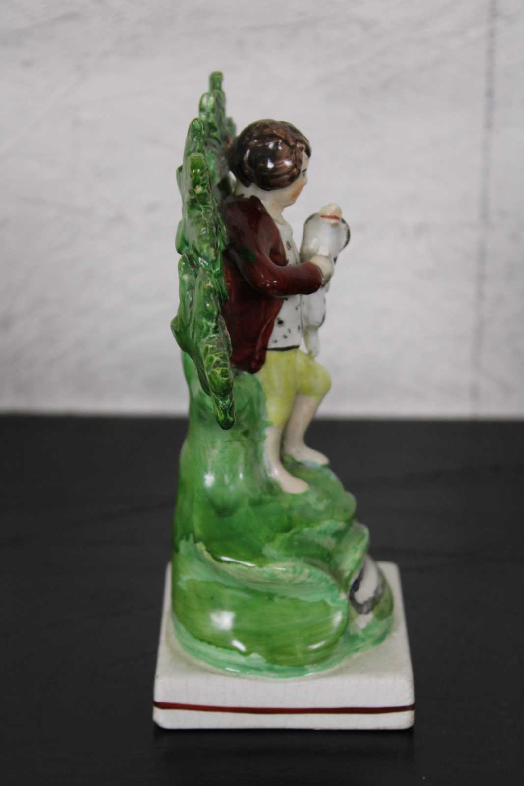 Antique Victorian Staffordshire pearlware Bocage porcelain figurine in the shape of a young boy standing in front of a tree or shrub, holding a small dog.