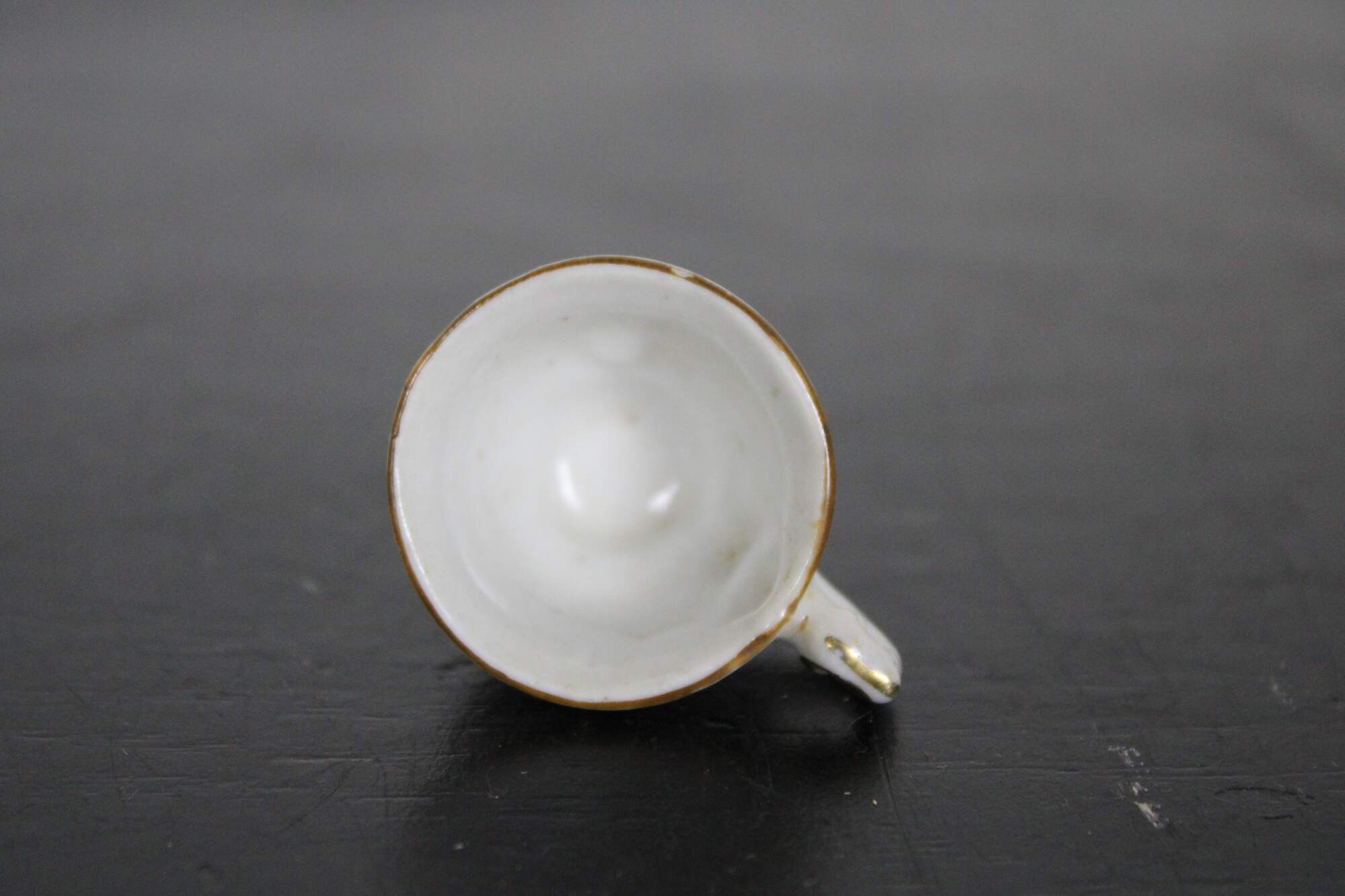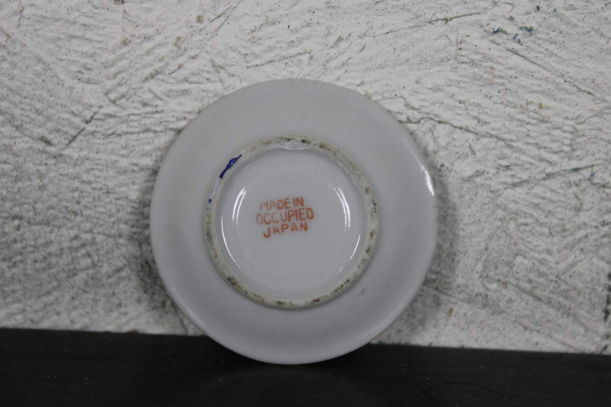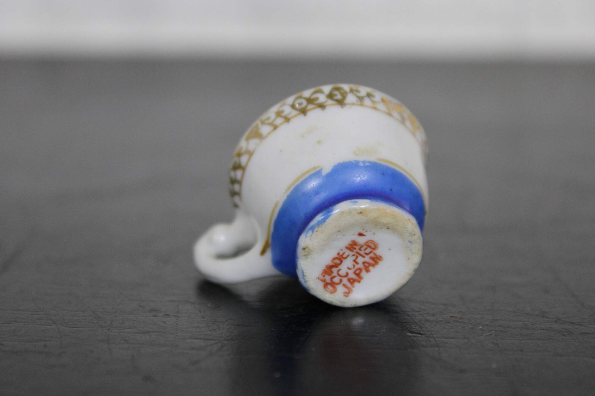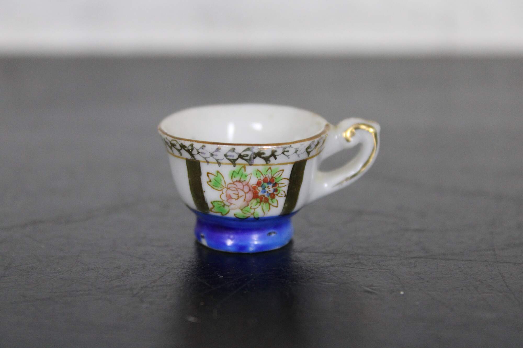 Vintage mid century porcelain miniature teacup and saucer, hand painted in blue and gold with floral accents,; made in Occupied Japan.